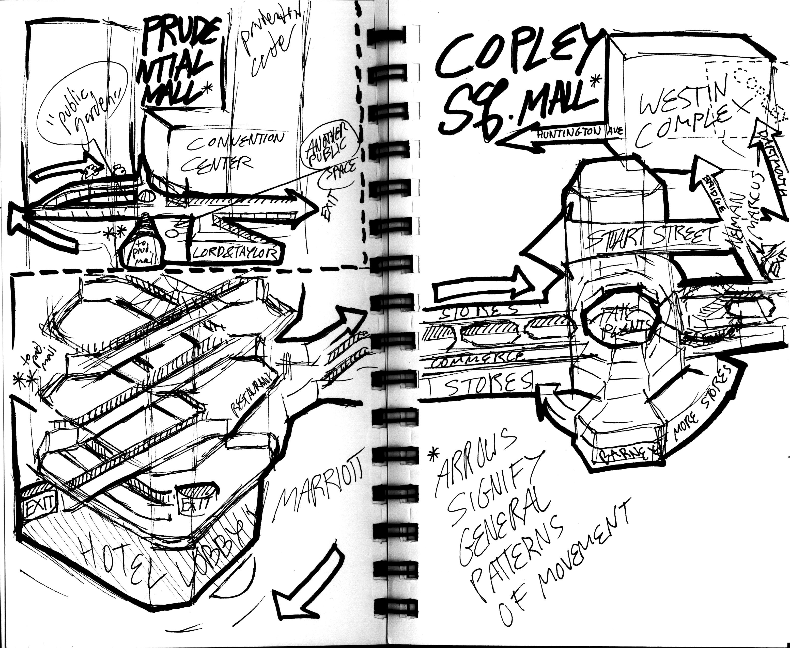 I'll admit that I thought what I was going to learn from this assignment was that street-level commerce produces a convivial, integrated atmosphere whereas enclosed galleries make for predictable, contrived shopping—an opposition implying that wholly privatized space isn't fun unless you're buying something. And while the palpable differences between Newbury Street and the Prudential/Copley mall complex do confirm this bias of mine, the reality is a bit more complicated. First, as I've tried to indicate by using arrows in my sketch, both portions of the mall are surprisingly well-designed, allowing for a seamless passage from the street to the galleries, from the galleries into skyscraper-encircled walking spaces, from these spaces into hotels, and so on. This dynamic topography offers an entertainment of its own—kind of like the Chelsea High Line—that the zero-incline linearity of Newbury street can't match. Similarly, the galleries seem to blend public amenities (bad statuary, ample seating) with private capital (the looming skyscrapers and hotel lobbies with “elite” check-ins) in a way that seems admirable, if strained. Don't get me wrong, though: the mall is deeply sinister—it just makes for a pleasant, I. M. Pei-esque walk.