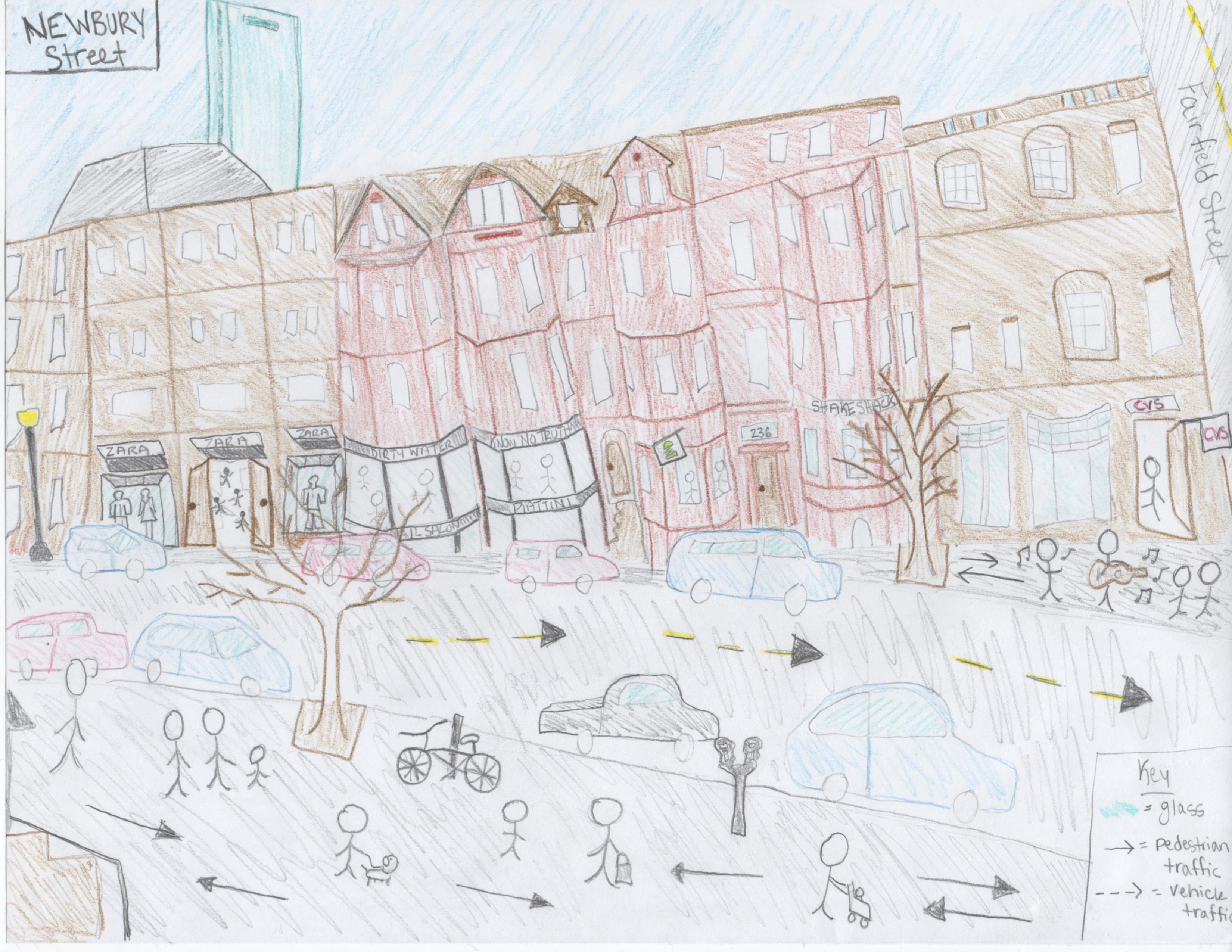 I then went Newbury Street and sat across from Shake Shack (between Fairfield and Exeter Streets) to observe that space. The commercial aspects of the space are comparable to the indoor mall because all of the stores are very close together, and they utilize the same large, glass storefronts to display goods and small signs hanging off the buildings with the store names. However, the interesting thing about Newbury Street is that it is very clearly a space used for activities other than commerce as well, so people just out walking with dogs or kids or friends are integrated with shoppers. The entrances and exits to the streets also reflect this inclusivity because they are much more decentralized than they are in the mall – you can enter and exit from many different side streets – so anyone, even those who are just passing through without any intention to spend money, can experience the space. There are also people hanging out and doing things they love like playing music on the street, which is actually in an attempt to make money rather than spend it. The obvious presence of cars and the sounds that accompany them also point out how different this space is from a mall and how much more integrated it is into the urban fabric, which differs from the man-made, disruptive indoor mall.