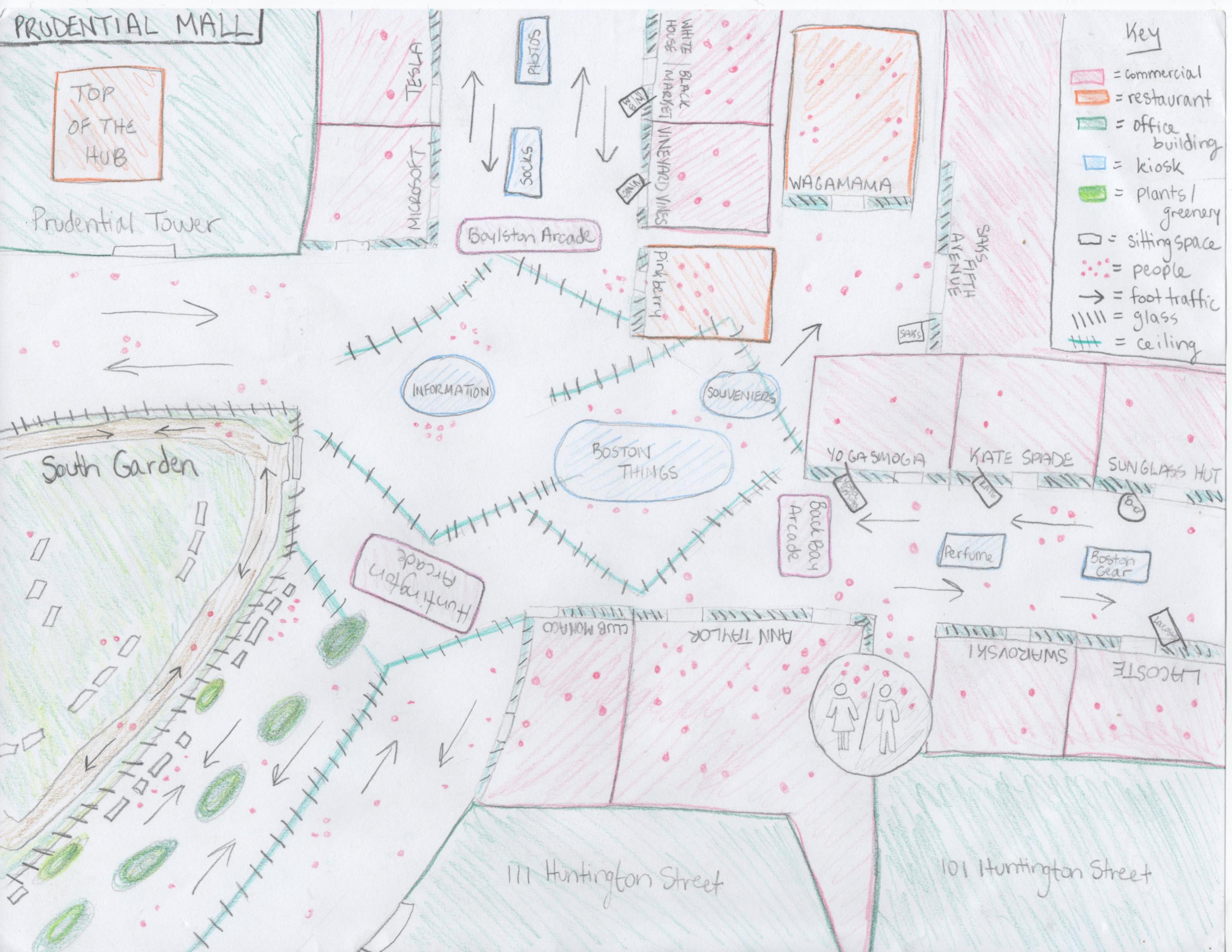 Examining these two different commercial spaces was very interesting because it became evident how they were trying to imitate one another, but also how different they still were. To start, I went to the Prudential/Copley Malls, and I noticed that the use of glass both in storefronts and in the walls and ceilings was very prominent. This creates a fluid feel between indoors and outdoors to make the shoppers feel like they are in a more natural and less commercial, man-made space. The use of plants and large greenery in certain spaces also helps to achieve this natural feel, as does a large outdoor garden that can be clearly seen right outside the mall through large glass walls. The smaller signs hanging off many of the storefronts (which I tried to portray in my sketch) also give the feeling of walking down an outdoor street with small boutiques all in a row. The high, uneven, glass ceilings are also artfully constructed to blend in with the natural sky and give a very open feeling. The people in the space seem to mainly be there to shop and spend money in some way, whether that is in shops or in restaurants, but there are also a few gathering spaces with seating near the foliage and large windows. The entrances and exits to the mall are very streamlined because they are only in a few, designated spots, so it seems to attract people who are coming in with a purpose (and with money to spend).