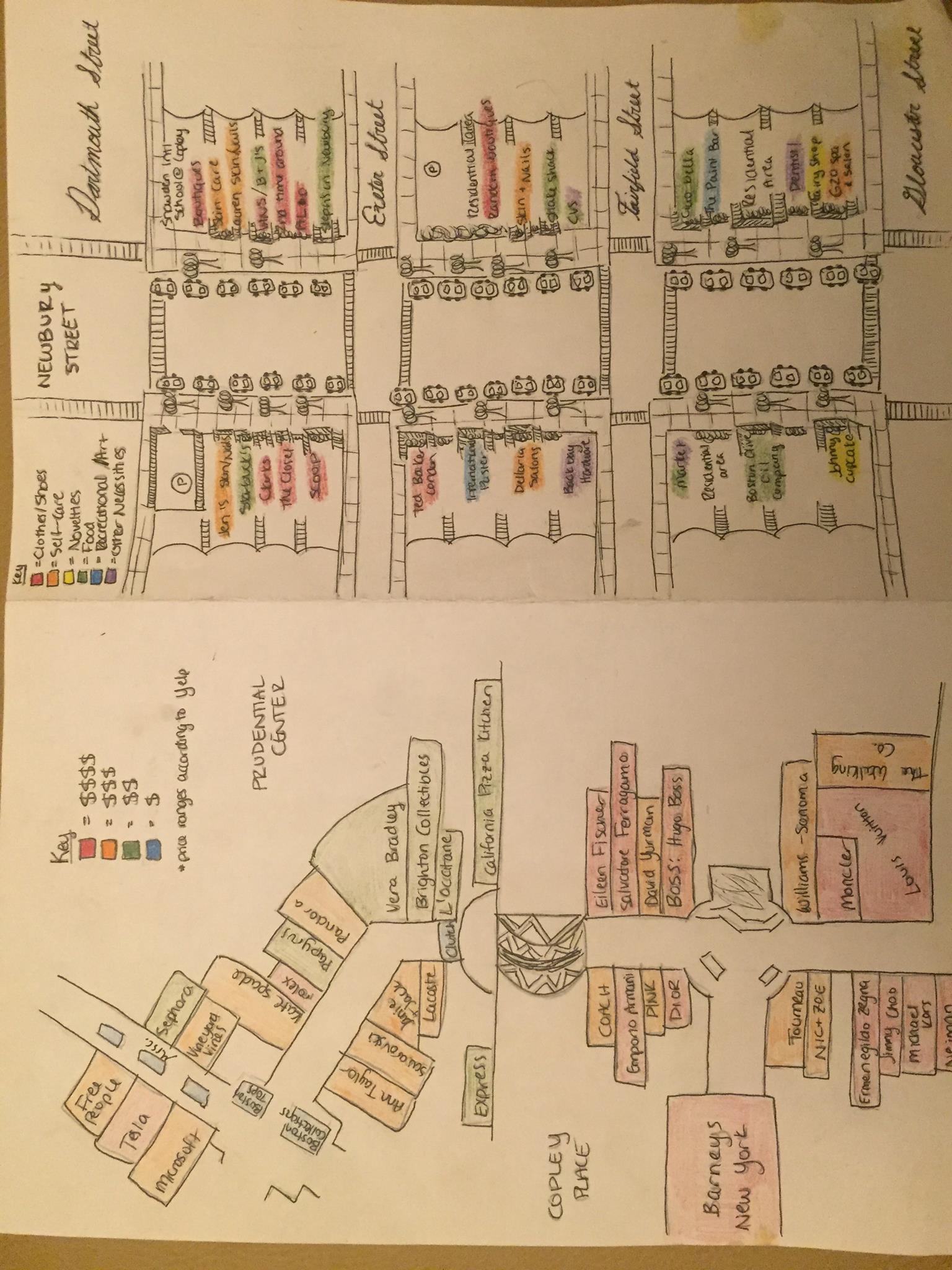 The first thing that I noticed when I entered Copley Place was how expensive everything looked. From the tiling, to the gilded ceiling, and the expensive brand-name stores that I had always associated with affluence (Louis Vuitton, Jimmy Choo, Armani, etc.), I felt immediately out of place. And I looked out of place, as the man standing outside of one of the stores who forgot to ask me—and only me—if I wanted a free sample, could probably tell. The Prudential Center, however, was a stark difference. I found myself surrounded by stores that I could see myself, a not-very-well-off college student, shopping at. The atmosphere was more familiar, and it reminded me a lot more of the shopping mall I visited at home. There was a greater diversity of people: not just the old white people I found myself surrounded by at Copley, but diversity in race and age. While there is no literal barrier between Copley Place and the Prudential Center, there seems to be an unspoken agreement about who has access to what spaces. Money acts as the barrier between the two very different worlds, and this is what I wanted to highlight in my sketch. On Newbury Street, I found some similarity to Prudential Center in terms of monetary accessibility and diversity of populations. However, Newbury Street is not a shopping mall, but rather a street in the heart of Boston, and the architecture reflects this, with the stores woven into housing complexes and residential areas. Given that it is a residential area, I noticed a greater variety of stores on the street in comparison to either of the malls: more restaurants, creative/community spaces, self-care places, etc. This difference of Newbury Street as a residential area and community, rather than simply a shopping area, is reflected in my sketch.