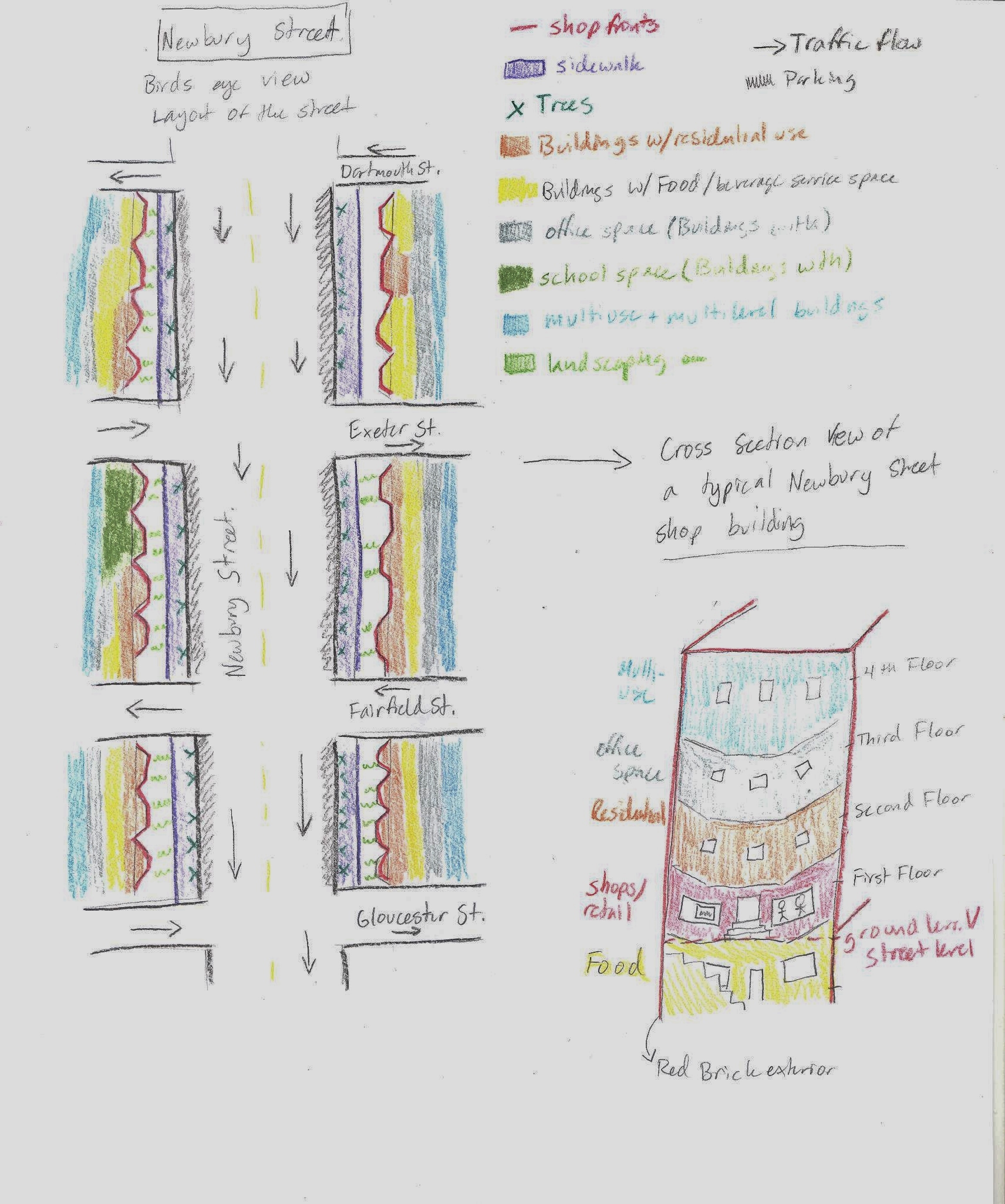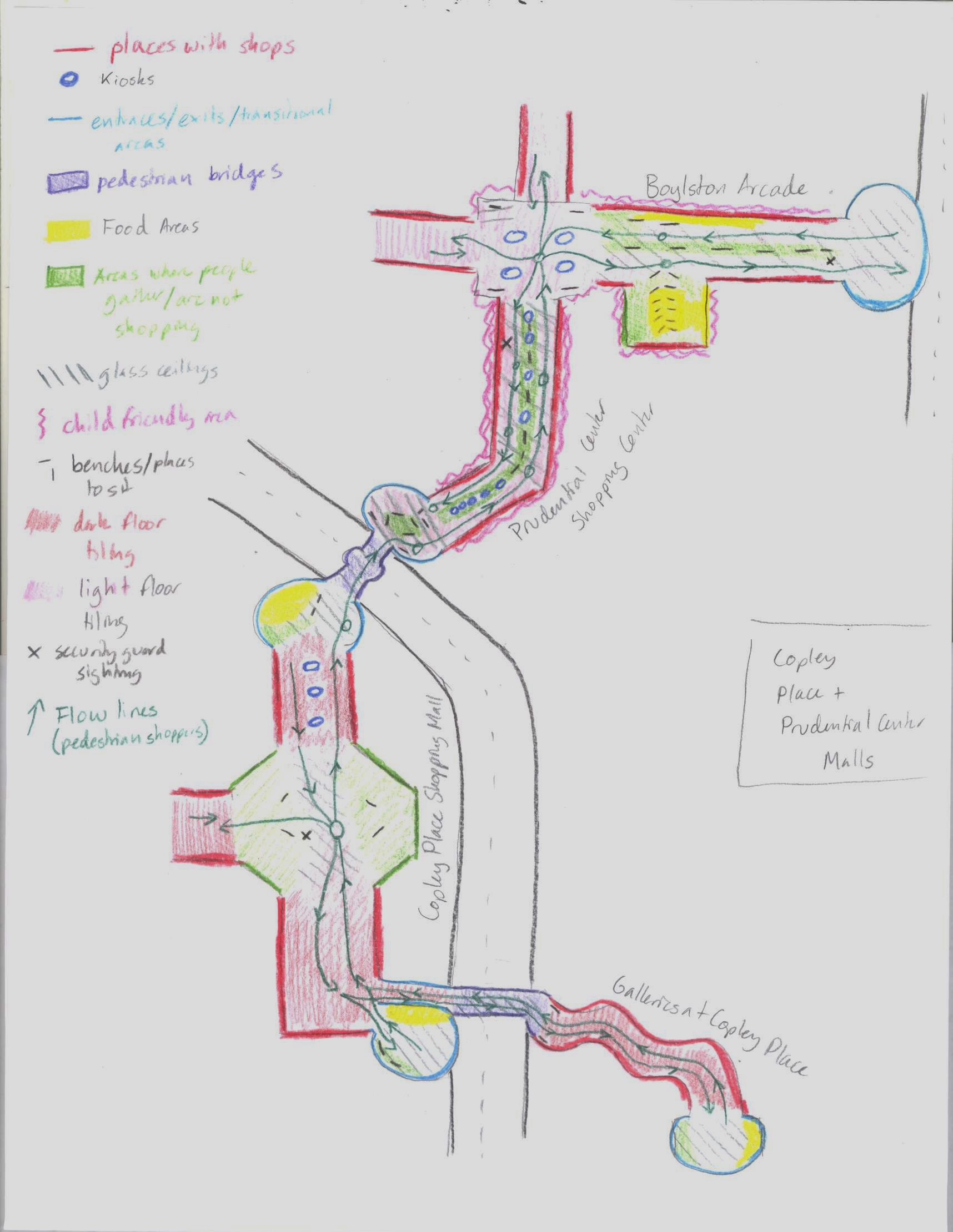 Despite both being shopping malls, these two spaces are drastically different. The Copley and Prudential center shopping mall is designed for consumerism. The flow of the space effortlessly directs one along a path of retail. It is one long tunnel of retail opportunities, designed in a way to make the space seem more like a neighborhood of shops. This illusion is created by turns in the tunnel, the addition of glass ceilings, brick walls, pedestrian walkways, and food areas all of which break up the monotonous presence of shops. Newbury Street on the other hand actually does seem to be a neighborhood of shops. This is particularly evident in the multiuse nature of the buildings. In fact the retail, despite being almost overwhelming present in advertising and signage, occupies mostly the street level or underground level, while the upper levels appeared to be residential, office, and even school space. As well, significantly more restaurants and food vendors compete with the retail on Newbury Street and give it a very different feel. These restaurants make Newbury Street more than just a destination for shopping. As well the way that Newbury Street fits into the surrounding area gives it much less of a focus on shopping, with the crisscross of cars and pedestrians just passing by on their way to somewhere else in the city. Newbury Street has had to adjust to this and make more of an effort than the shops in the Copley Mall. In fact, Newbury Street has seemingly attempted to emulate a traditional mall like the Copley Mall with its large window displays and intense advertising. Architecturally the buildings themselves protrude into the street, which allows the shops to catch the eye of the consumer. I found the Copley Mall to be exhausting even just to walk through. It was a much more social experience and a much more intense experience with all of the design aspects aiding in the marketing of the stores (the lights, the colors of the floor, the mahogany lined panels) which heightened my senses greatly. In taking a harder look at these malls I really feel that I saw them both in a new light, seeing how both have used design (inside and out) to create a space fit for the American consumer.