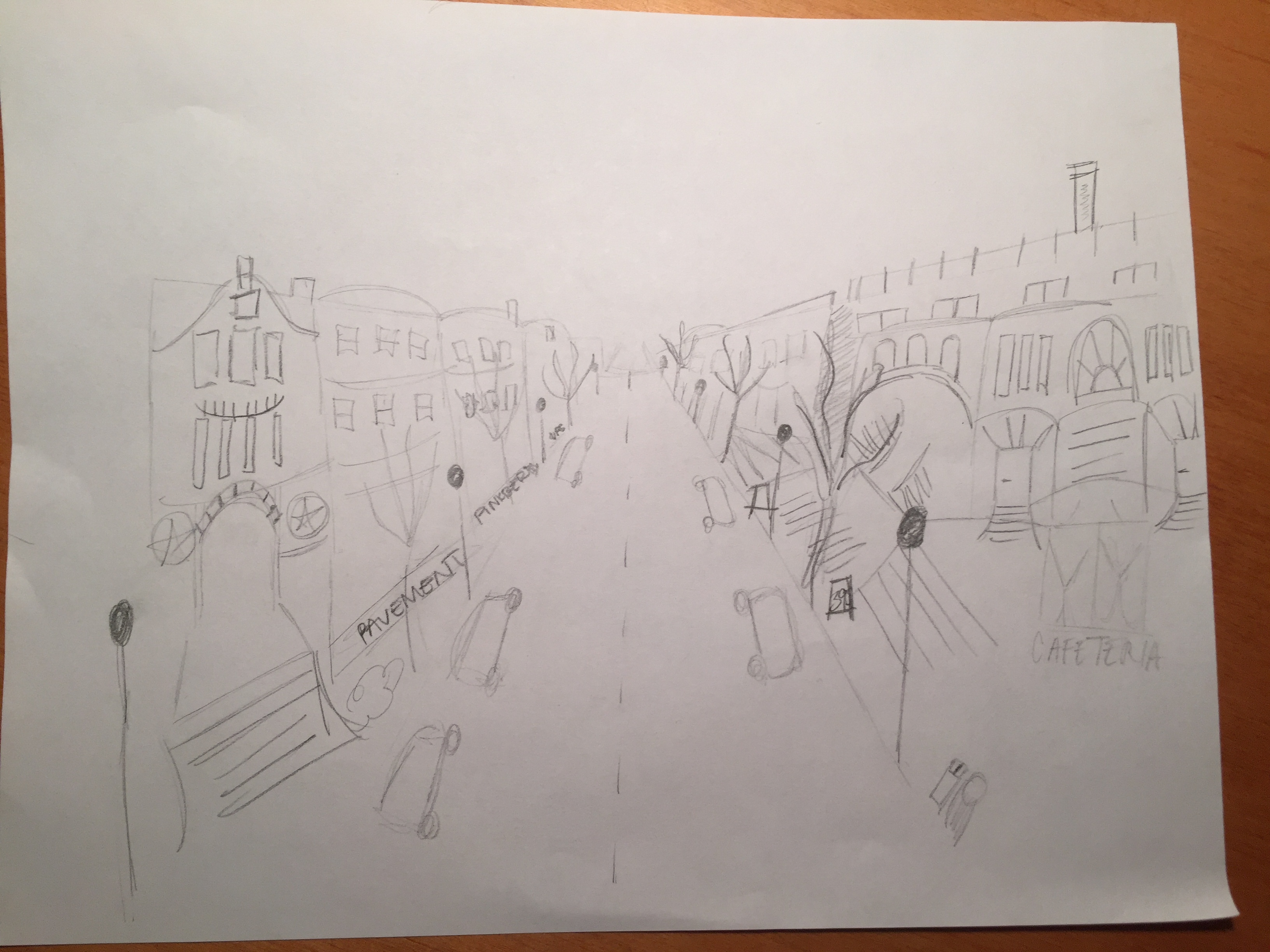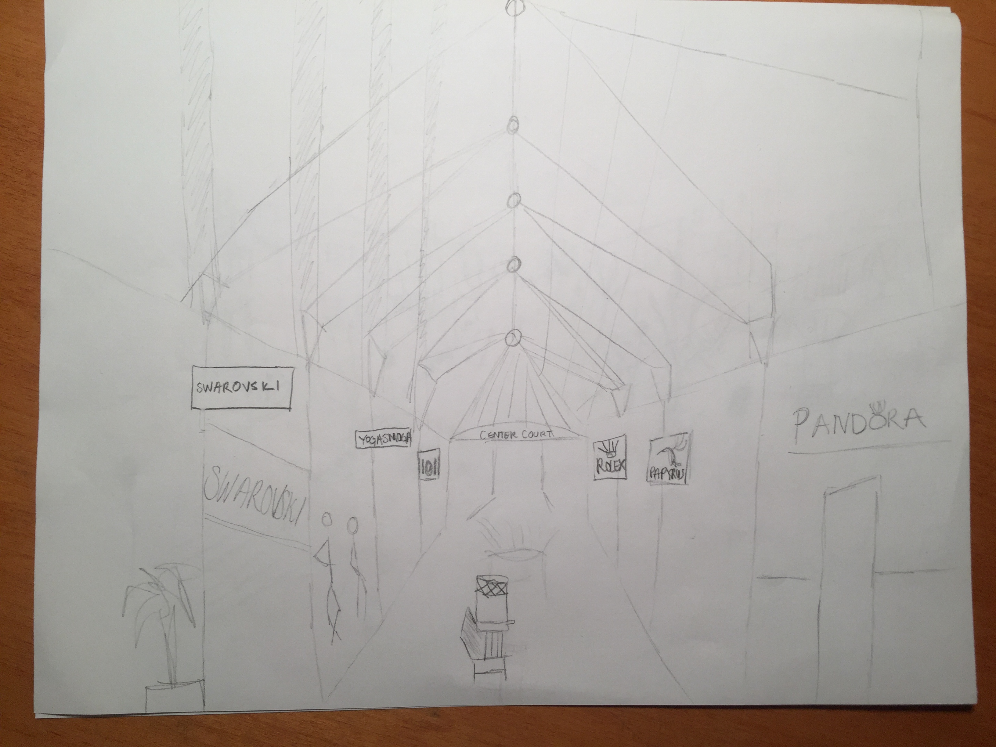 For this sketch, I tried to switch up my approach from my last sketch. Instead of doing a view from above, I picked a view from one particular spot and tried to incorporate a more abstract idea of space. I tried to focus on perspective and angle. I thought drawing the small part of the mall was actually a lot easier than the part of Newbury Street. There was more happening on the street and it was harder to focus on the specific aspects on the street because we were outside. I also couldn’t stand in the spot I centered my drawing on because it was right in the middle of an intersection, so I had to do my observing from both sides of the street and then pull it together on paper when I began to draw. At the Prudential Center Mall, it was easier to stop and draw and so it was easier to notice small details, but the drawing of the perspective and all the lines I tried to incorporate definitely stretched my artistic ability.