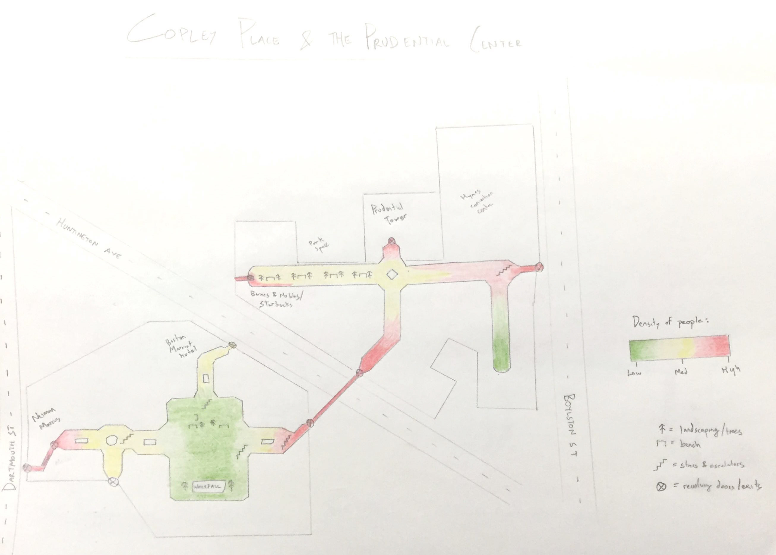 This assignment forced me to think critically about the decisions I was making. Unlike our first assignment, where we were tasked with simply sketching a space from memory, this assignment required considerable observation and attention to detail. Moreover, the purpose of this second assignment was to use the two sketches to tell a story or emphasize the contrasts between Copley Place and Newbury Street. After spending time in both locations, I decided that the best way to articulate these differences was by illustrating their vastly different patterns of use.