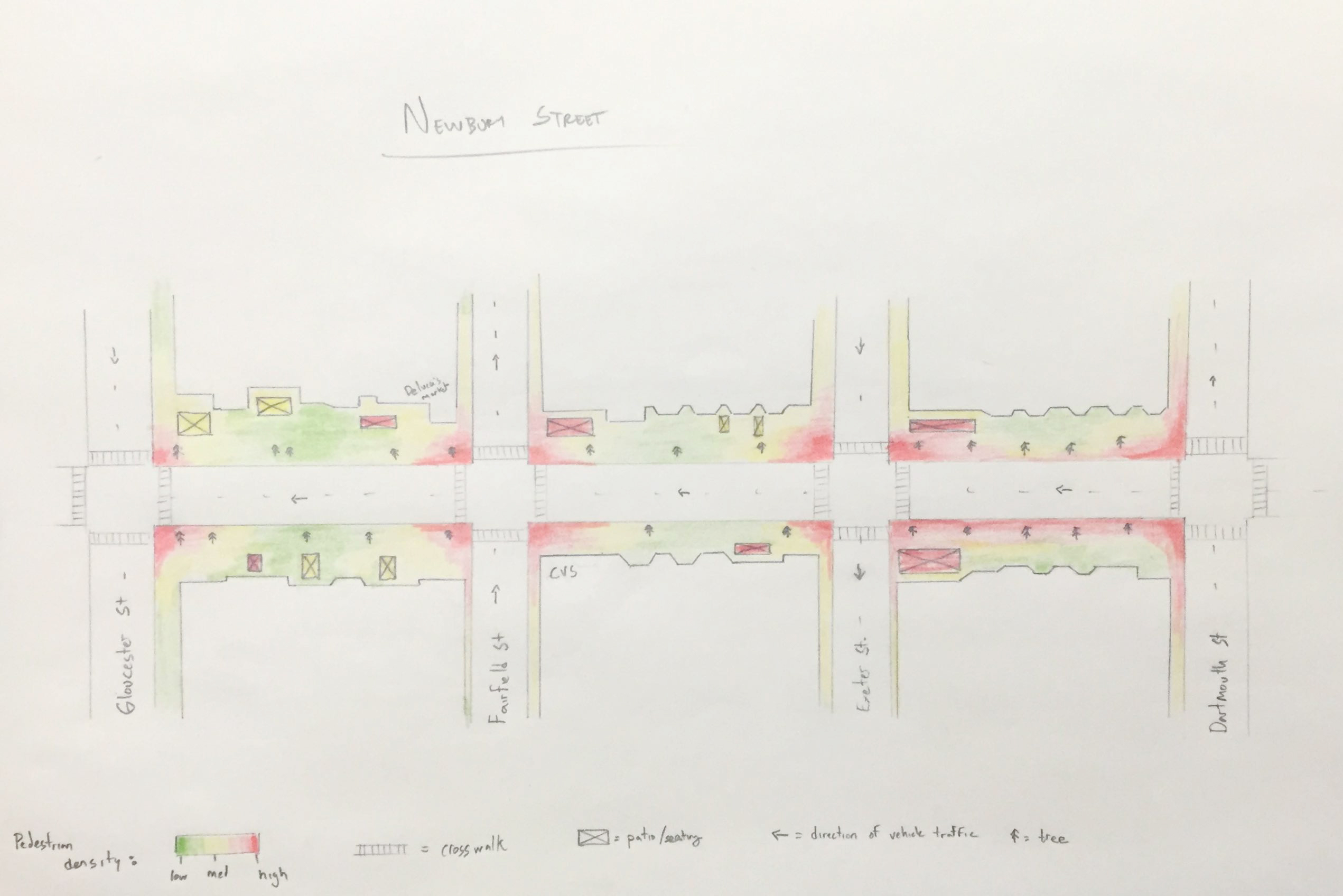 Newbury Street, on the other hand, is a very porous environment, with pedestrians entering from side streets, walking the length of the street, or entering from inside its many brownstone buildings. High densities were still observed, mostly clustered around intersections and at popular outdoor cafes and terraces. But pedestrian traffic was overall more dispersed and fluid.