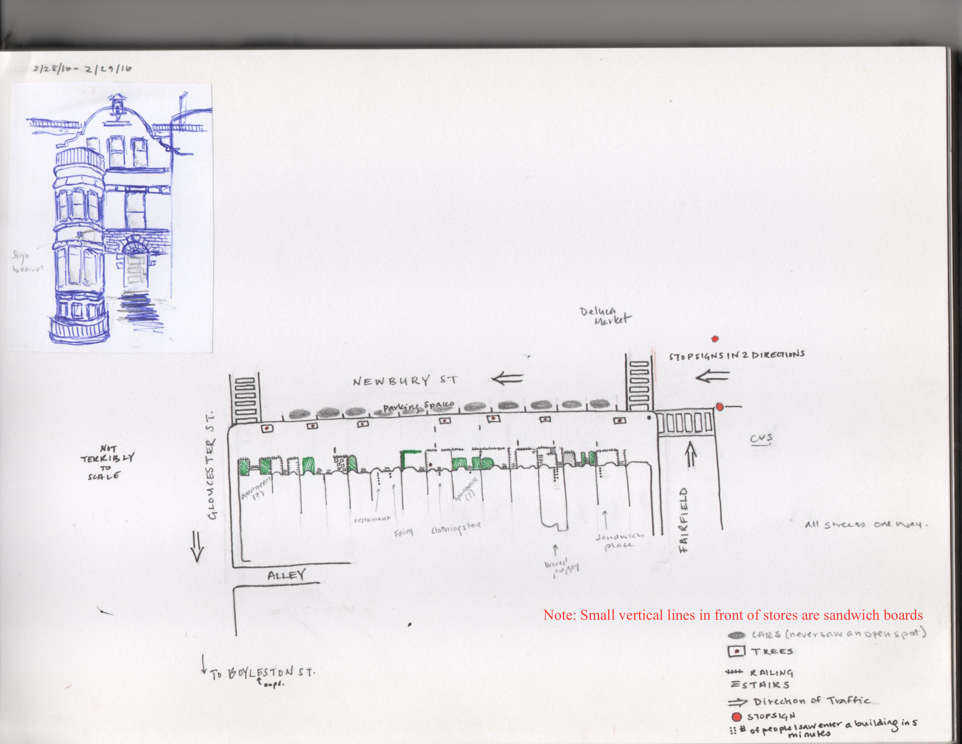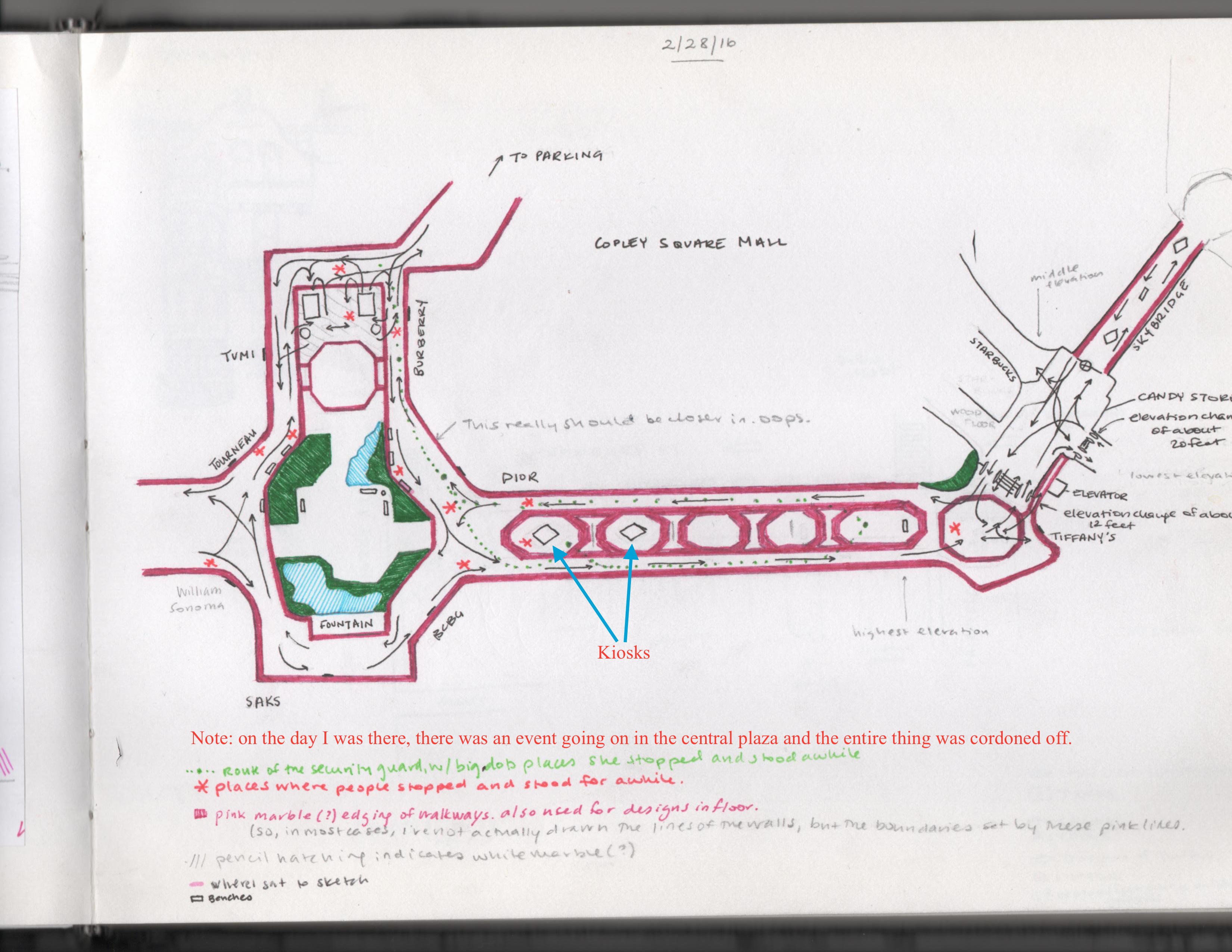 What’s fascinating about the Prudential Center and Copley Square malls is the way in which they both seek to simultaneously evoke the covered shopping street and, more complicatedly, the dynamics of a small market town. In the first case, the peaked glass roofs call to mind an arcade, a feeling added to by the occasional kiosks placed in the path. These particular malls are not merely a collection of little shopping streets, but a collection organized around central town square-like open places. I chose to focus my sketch on one of these places, which is not merely shapes as a town square with four main ways leading to and away from it, but contains a fountain (albeit a quite modern one), plant-life, plenty of natural light from a huge glass ceiling several stories up, and benches to sit on. The fountain is even filled with pennies, just as one in a town square might be. The storefronts, too, add to the illusion of being outside as they all are designed differently, as if they were actually separate buildings on a street (Williams Sonoma is actually designed to look like an old-fashioned shop front). The malls are arranged as a series of these “squares,” linked together by generally straight and not-too-long walkways. In the Copley Square Mall, these are lined in a pink marbleish material and their main part is of herringbone pattern brick, again recalling an outdoor street (perhaps of an older market town). These pathways are almost entirely devoid of places to sit or pause (this is truer of the Copley Mall than the Prudential Center) and instead function to keep people moving—moving towards more stores or towards the squares, where there are places to sit. I rarely saw anyone pause for long in these walkways, nor did anyone deviate from the general traffic plan of walking on the right side. All walking looked purposeful and barely anyone was there alone.