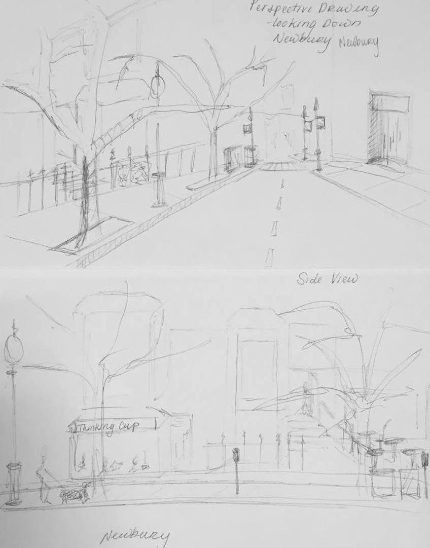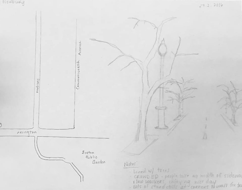 Upon observing both Copley Place and Prudential Center Malls, and Newbury Street, distinct differences between the two become apparent. On the first floor, the shopping centers of Copley Place and the Prudential Center have wider walkways spanning the space between the two shops on either side with small kiosks placed at a diagonal in the center of the walkways. The floor has different materials that mimick a track: a darker brick-like zigzag pattern highlights the movement that I felt I was supposed to follow. In this way, movement seems to be constricted to this ‘brick road,’ which, in one way, allows for a constant flow of people that is minimally interrupted – only once in a while by those distracted by their phone or those who stop abruptly, suddenly intrigued by a window temptation. Levels two and three also exhibit this same ‘runway-like’ design bordered by white to highlight the path of movement. The upper floors look over the first floor of the plaza, which allowed a feeling of enormity, and allow light from the glass ceiling to penetrate to the lower floors.