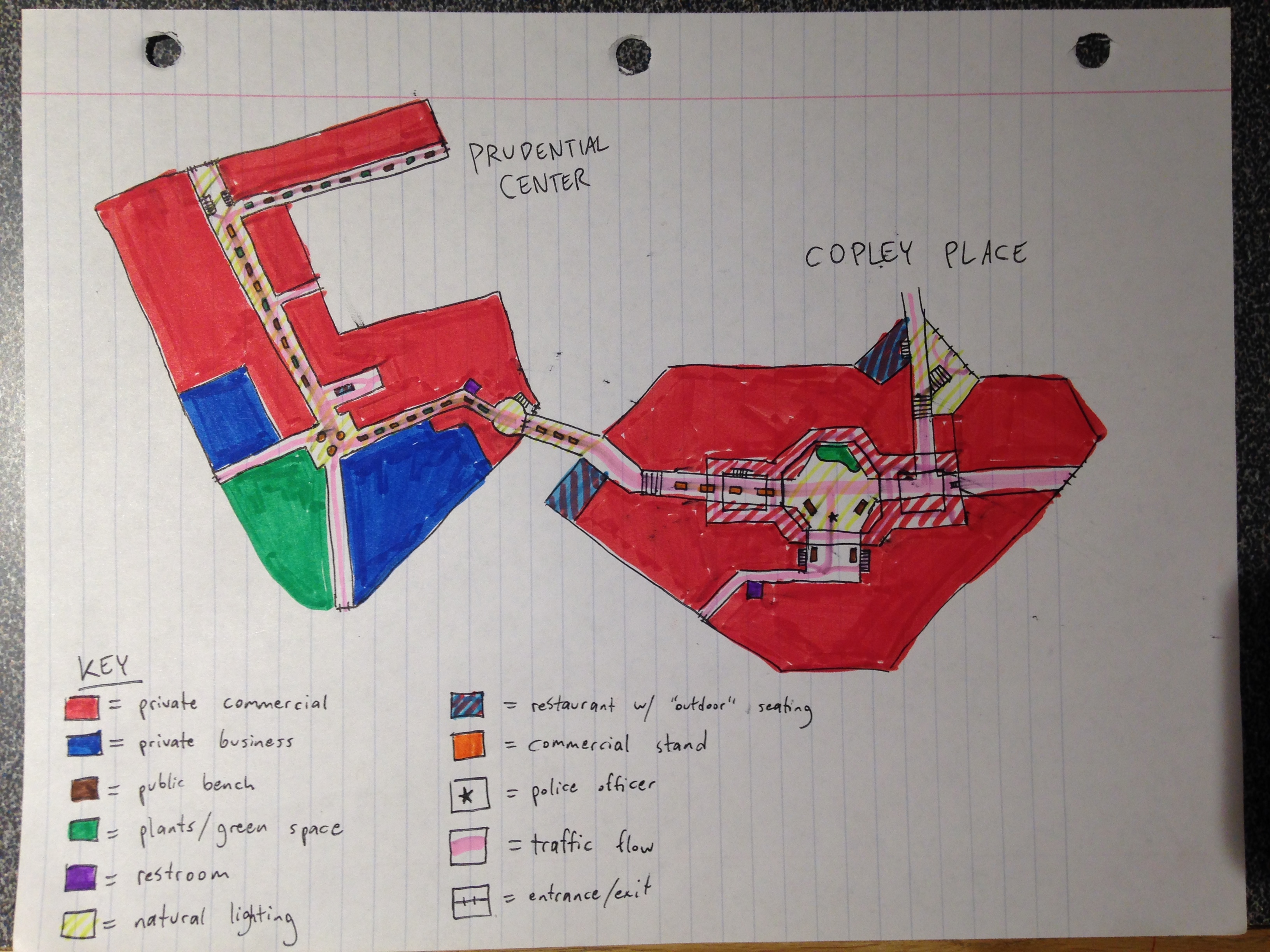As I walked through Copley Place and the Prudential Center, I was struck by how the visual experience of the mall changed, both in terms of types of stores and in terms of aesthetics. Copley Place seemed to be mostly high-end fashion retailers, and there was little natural light. The floor added to the sense of luxury, being made of marble and brick, although the ceiling offered a somewhat disorienting contrast, with bare lightbulbs and metal pipes that would normally be hidden exposed. There were a few benches, but very few people were using them; most people seemed to be on their way to somewhere else. Prudential Center, meanwhile, had an abundance of natural light because the ceilings were made of glass. There were also many more plants benches in the main arteries, and more people sitting down.