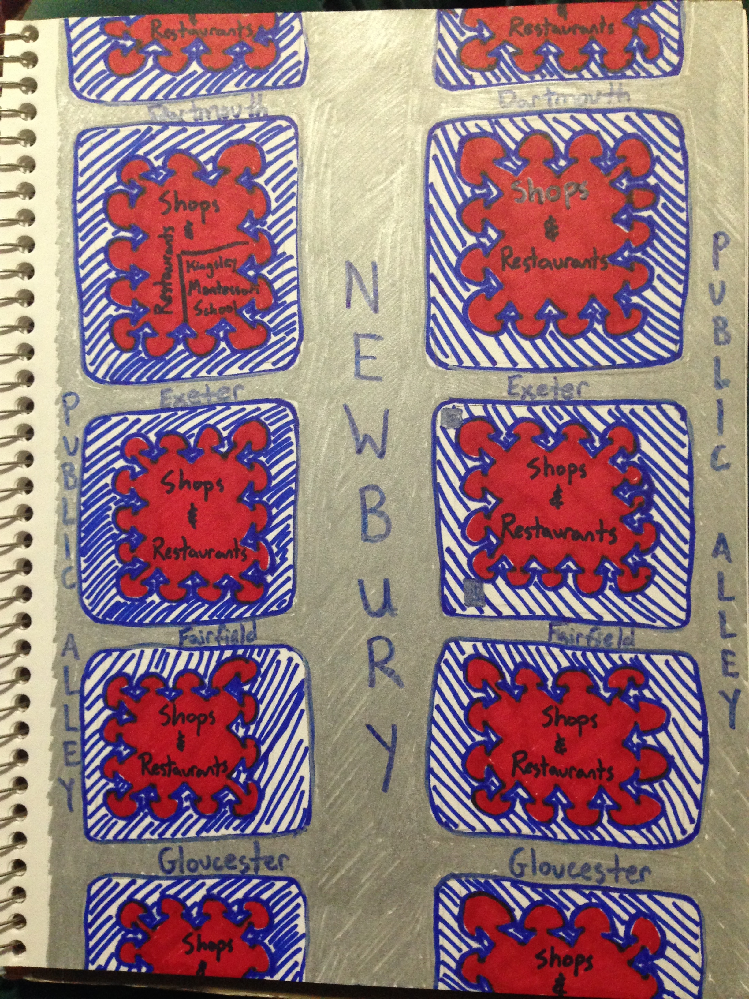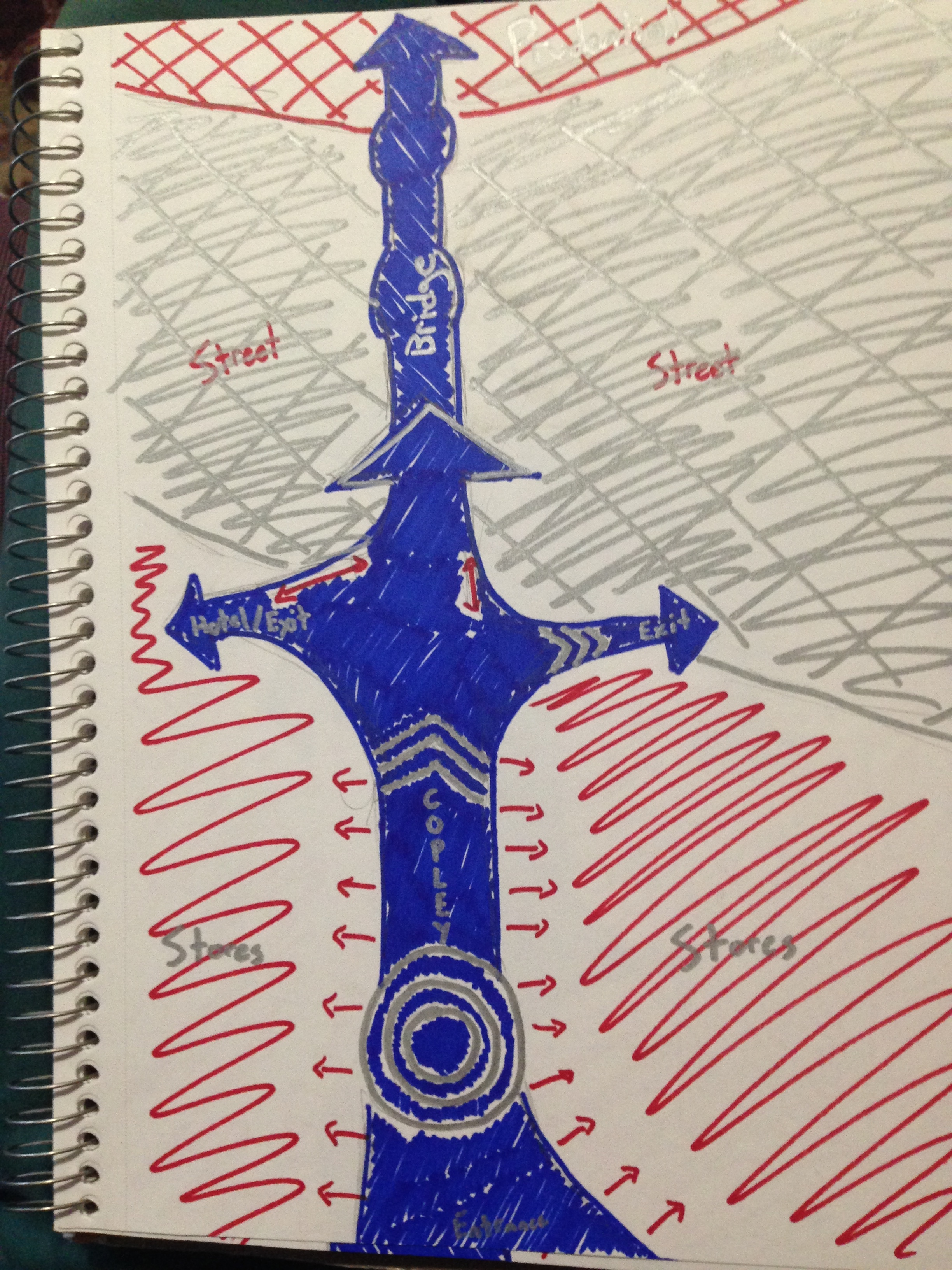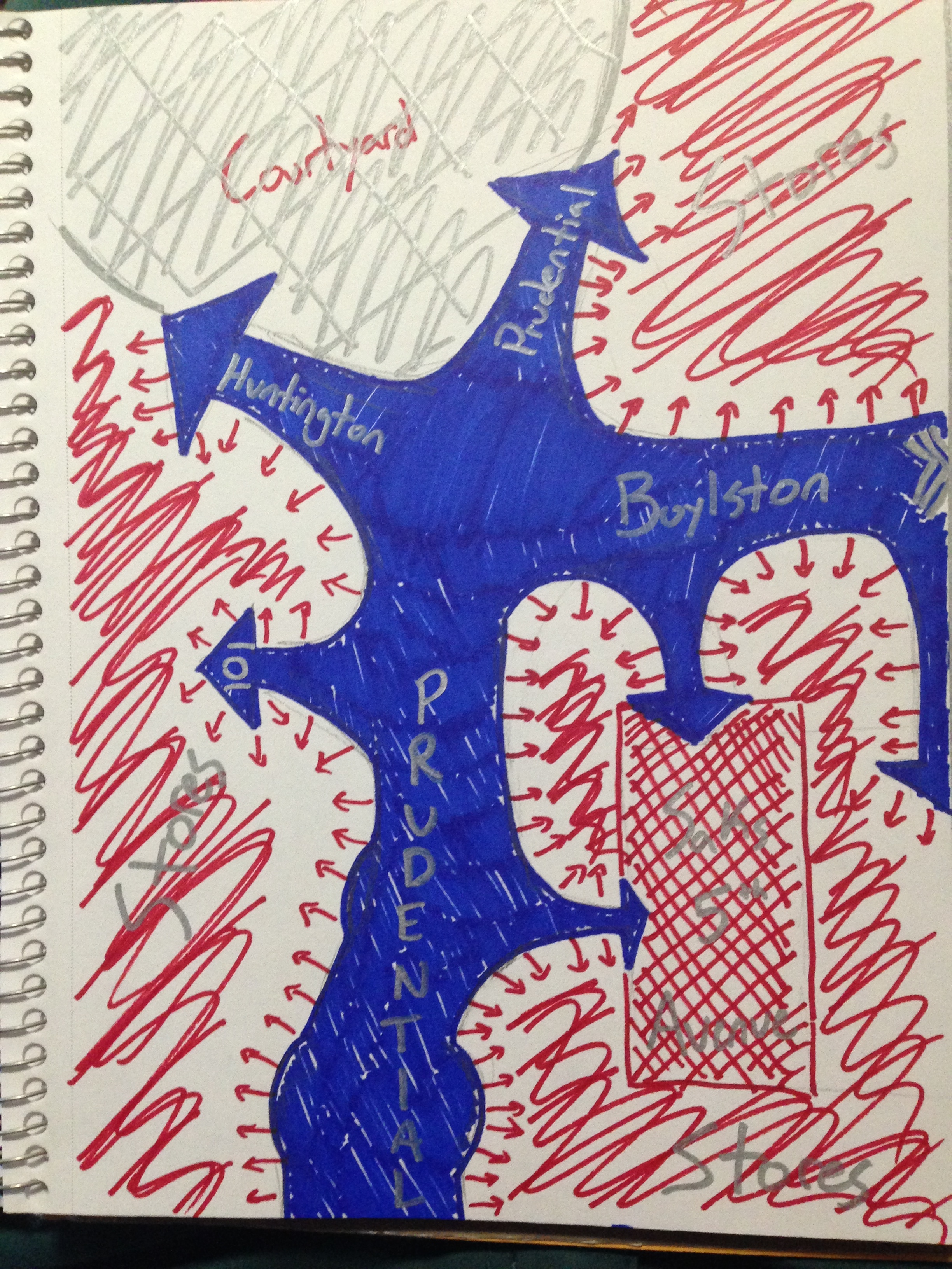 The main point I attempted to distinguish in these two/three drawings was the difference between non-commercial walkways in the two spaces. In the malls the walkways felt like these clearly defined pathways, with just a few entrances/exits, surrounded by a haze of stores with the street in the background. That is why the main path I followed was a thick blue arrow, with the stores and streets being loosely shaded in red and grey areas. While walking down Newbury Street, however, it felt like the exact opposite. The streets were clearly defined and the stores were obvious, with steps up to their doors and each store set apart from all the others. The sidewalk, though, was vague. There were gardens and little patios in front of some of the stores, and the demarcation between public and private property was unclear. Thus, the walkways were full of unclear exits, which is why there were many small arrows and the shading was vague. The streets and stores though were solidly colored. This shading is also meant to distinguish between the atmosphere of the two scenarios. In the mall the walking is confined, enclosed on all sides by walls and a steel and glass ceiling. Newbury Street, conversely, is open to the world, with a much larger variety of sounds, sights, and smells. In the malls the walkways were there to efficiently get between places to shop, whereas on Newbury Street, the stores seemed more like fun ways to punctuate your journey up and down the sidewalk.