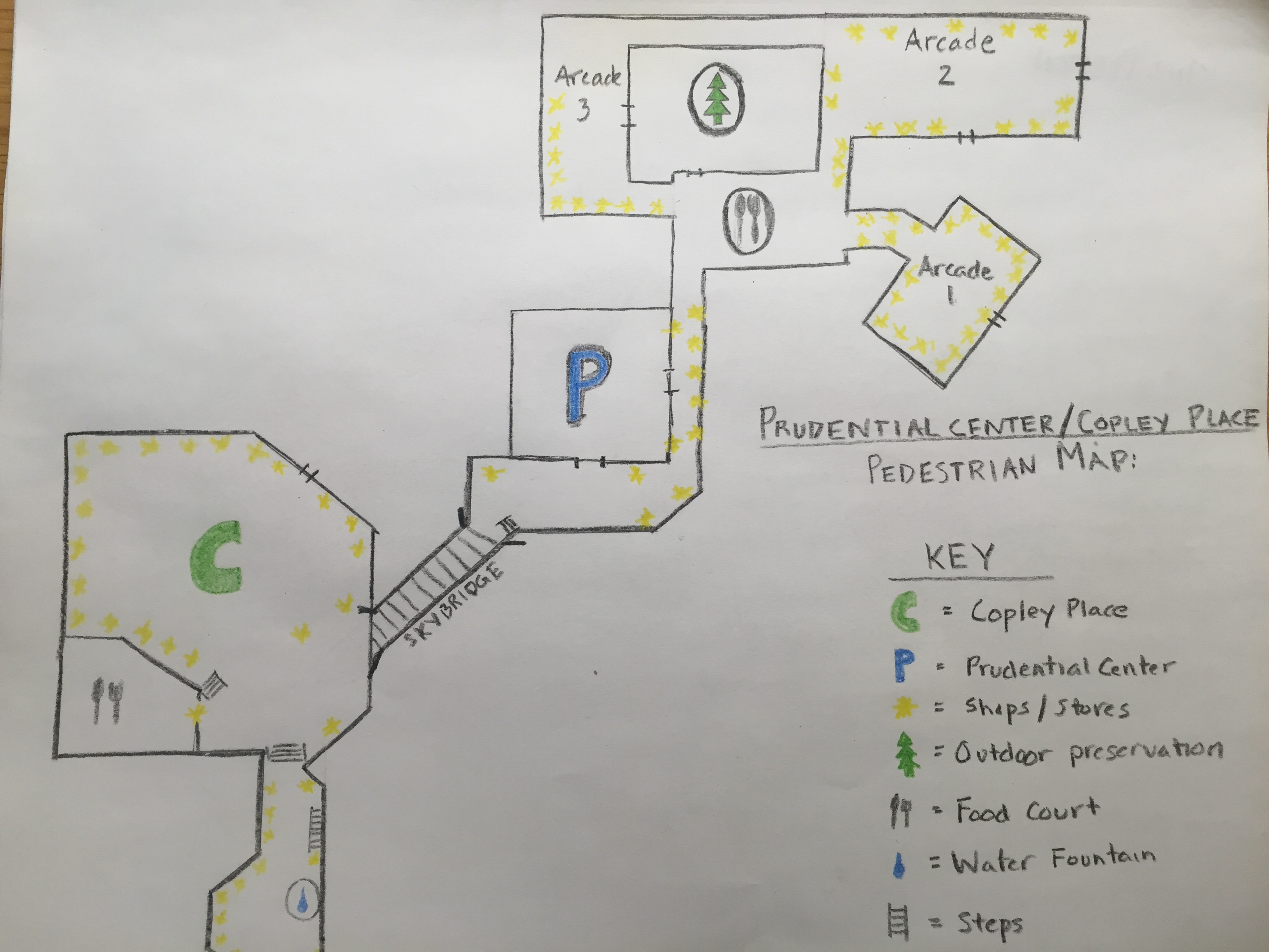 In contrast, the Prudential/Copley Place shops was very chaotic and confusing to get around. You constantly needed to view signs and maps in order to get where you were going. For this reason, I attempted to draw, to the best of my ability (and memory!), a general pedestrian map in order to help shoppers get around the shops. While it does not provide accurate details of each shop’s location, it provides a general sketch of the shops and the main areas that shoppers would most likely need to get to. In addition, it provides iconic parts of the shops, including the water fountain and the skybridge, to help shoppers maneuver the maze that is Copley Place.