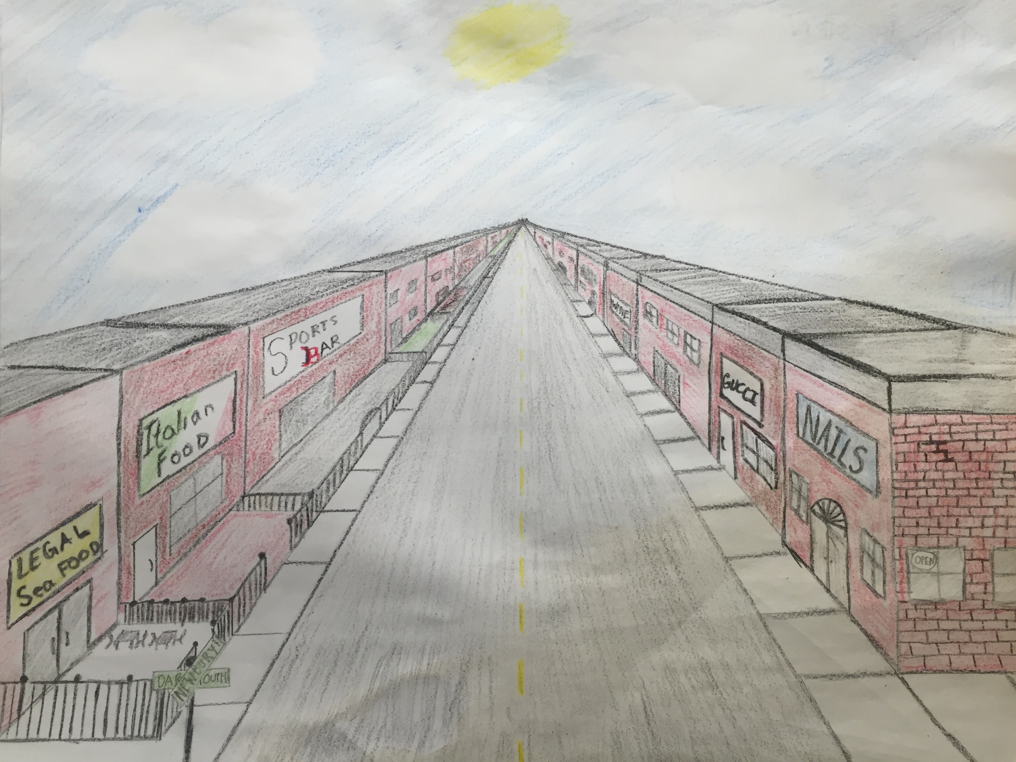 This assignment offers the chance to view two separate, but close, locations. They are both very unique from one another. While most may get lost in the Prudential/Copley shopping district, it would be very difficult to lose your way while traveling Newbury Street. I found Newbury St to be very interesting for many reasons. First, it was very easy to follow. All you had to do was continue straight. Secondly, there seemed to be only restaurants and smaller shops on Newbury St. Nonetheless, it provided a small-town feel to it. If you were traveling the street at night and disregarded all of the commercial signs, you would feel as if you were traveling the streets of a friendly neighborhood. This was an aspect that I aimed to depict in my sketch of Newbury Street. Restaurants with “eat-in” lawns consume the left side of the street while shops line the right side of the street. Additionally, I drew the road as if it were disappearing into the horizon to depict the length of the road. It’s a shopping district that seems to continue with no end.