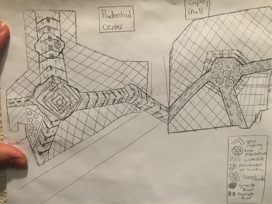 When taking the elevator up from the ground floor to the main entrance of the Prudential center Shopping mall, you begin in a glass ceiling hallway that “begins” your journey throughout the mall.