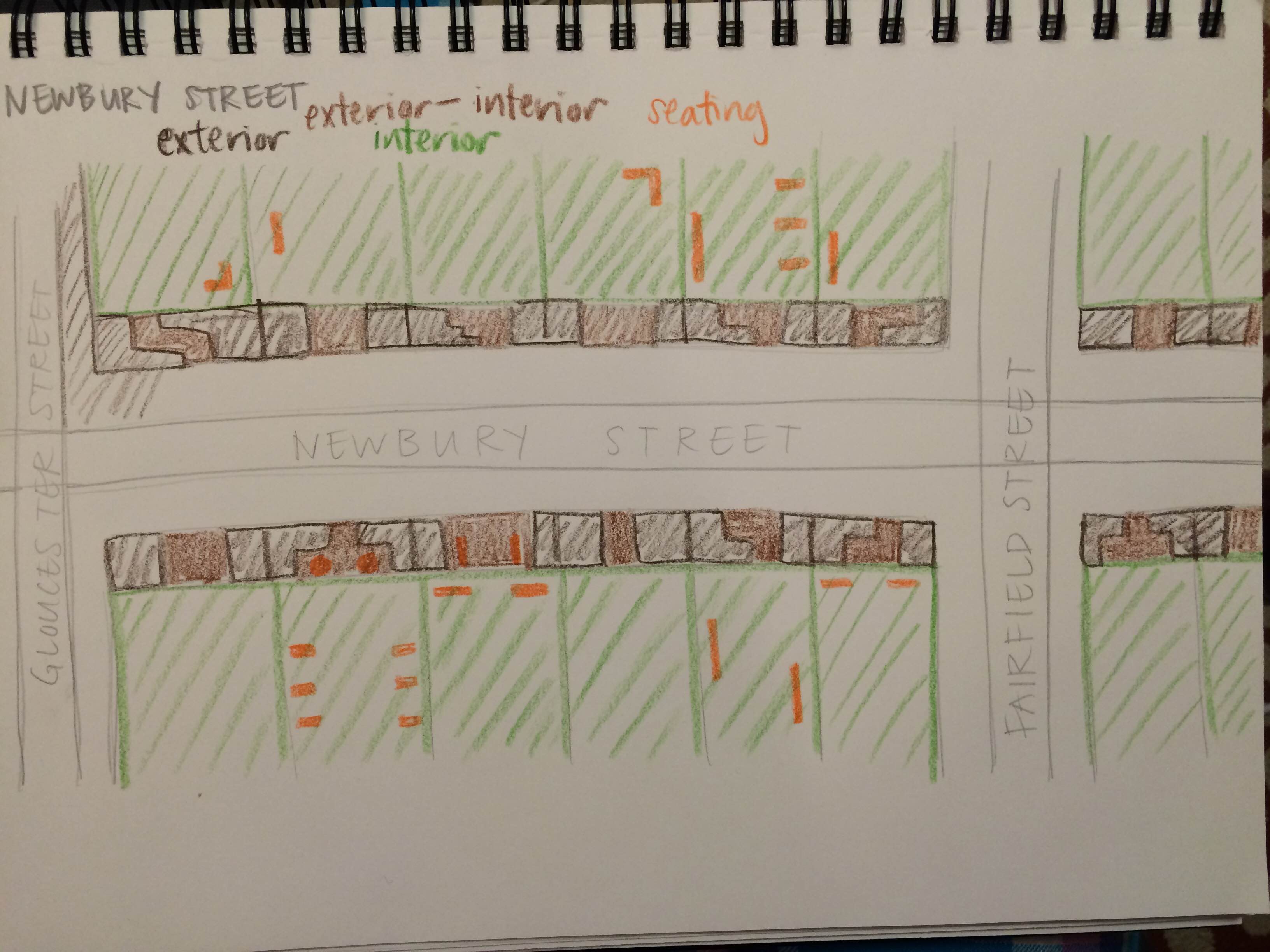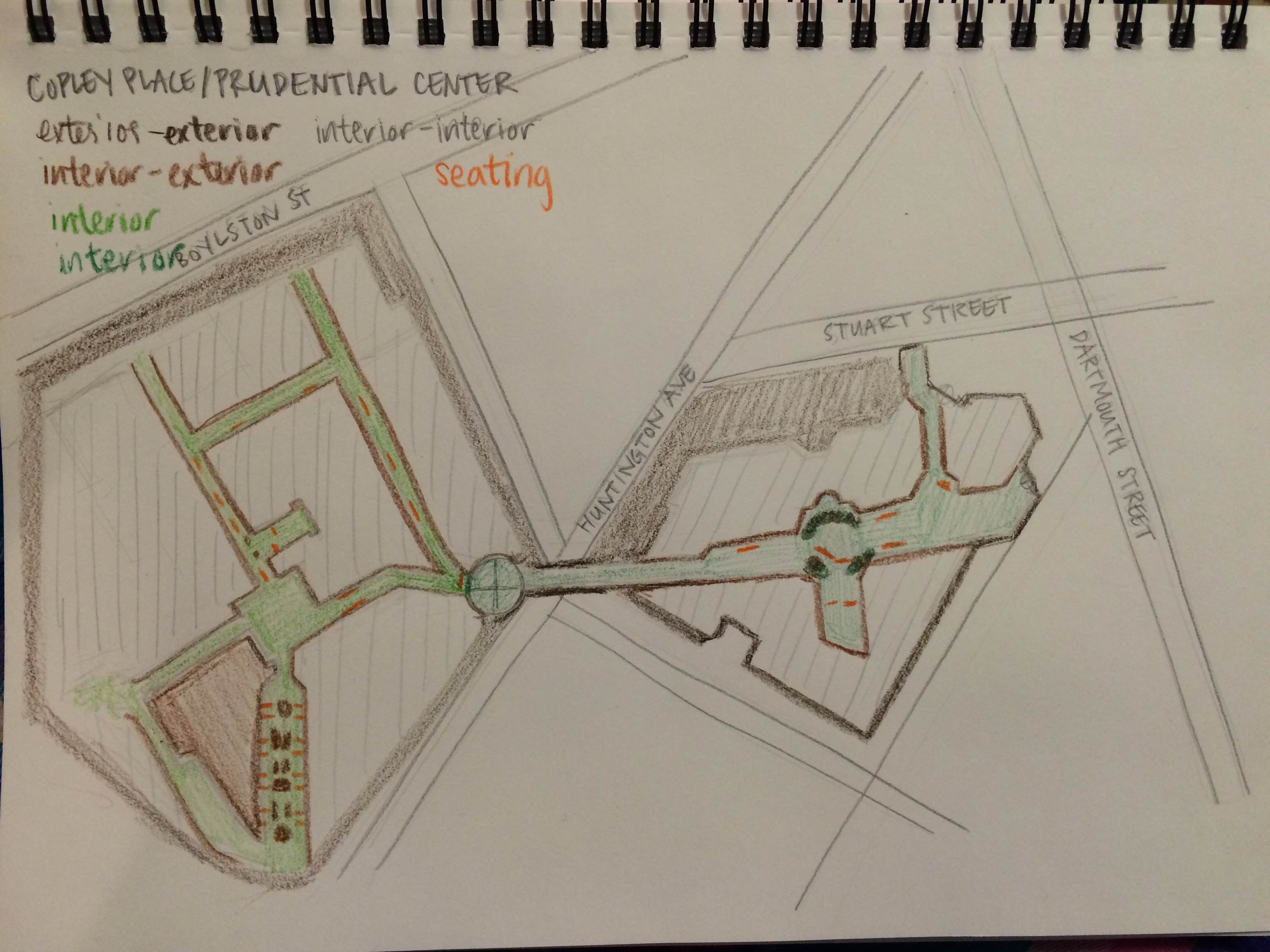 The theme that I focused on in my sketches and observations was the notion of inside/outside. I found that the two spaces each conveyed a sense of an interior and exterior, blurring the lines between what is actually outside or inside throughout the shopping experience. Upon observations, the distinction between the two became less clear in the Copley/Prudential Shopping Center as indoor gardens or facades gave the illusion that the corridors and hallways were actually exteriors rather than interiors in the shopping complex. In comparison, the interior/exterior dichotomy was much more direct in Newbury Street as the "hallways" of the shopping center were in actuality the sidewalks of the street itself -- the only interior in Newbury was the actual interior of the shops themselves. This resulted in a difference in how people interacted with the spaces as the perception of interior/exterior forced shoppers in Copley/Prudential Shopping Center to be wander more in the stores than loiter in the hallways between them, similar to how the people at Newbury were forced to go into stores if they wanted to sit and rest some place due to a lack of benches on the street. Although I didn't have much of a chance to express it in my sketches, there were many different elements such as flooring or the exteriors of the shops in the shopping center, replicated from outdoor malls such as Newbury, that conveyed this sense more clearly as well.