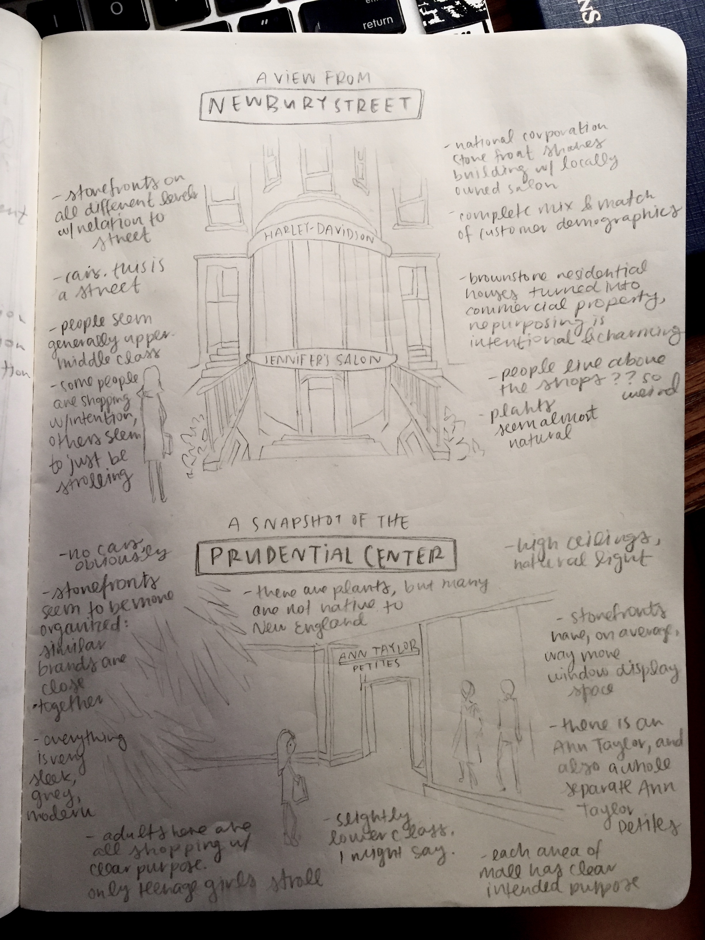 To me, a juxtaposition of Boston’s Newbury Street and Prudential Center ties in very neatly with the comparisons we’ve been drawing between urban and suburban landscapes. Obviously both sites exist within an urban environment. But the slight variations in the environments and experiences each commercial space offers align extremely well with what I see to be the main distinguishing factors of residential spaces across the nation.