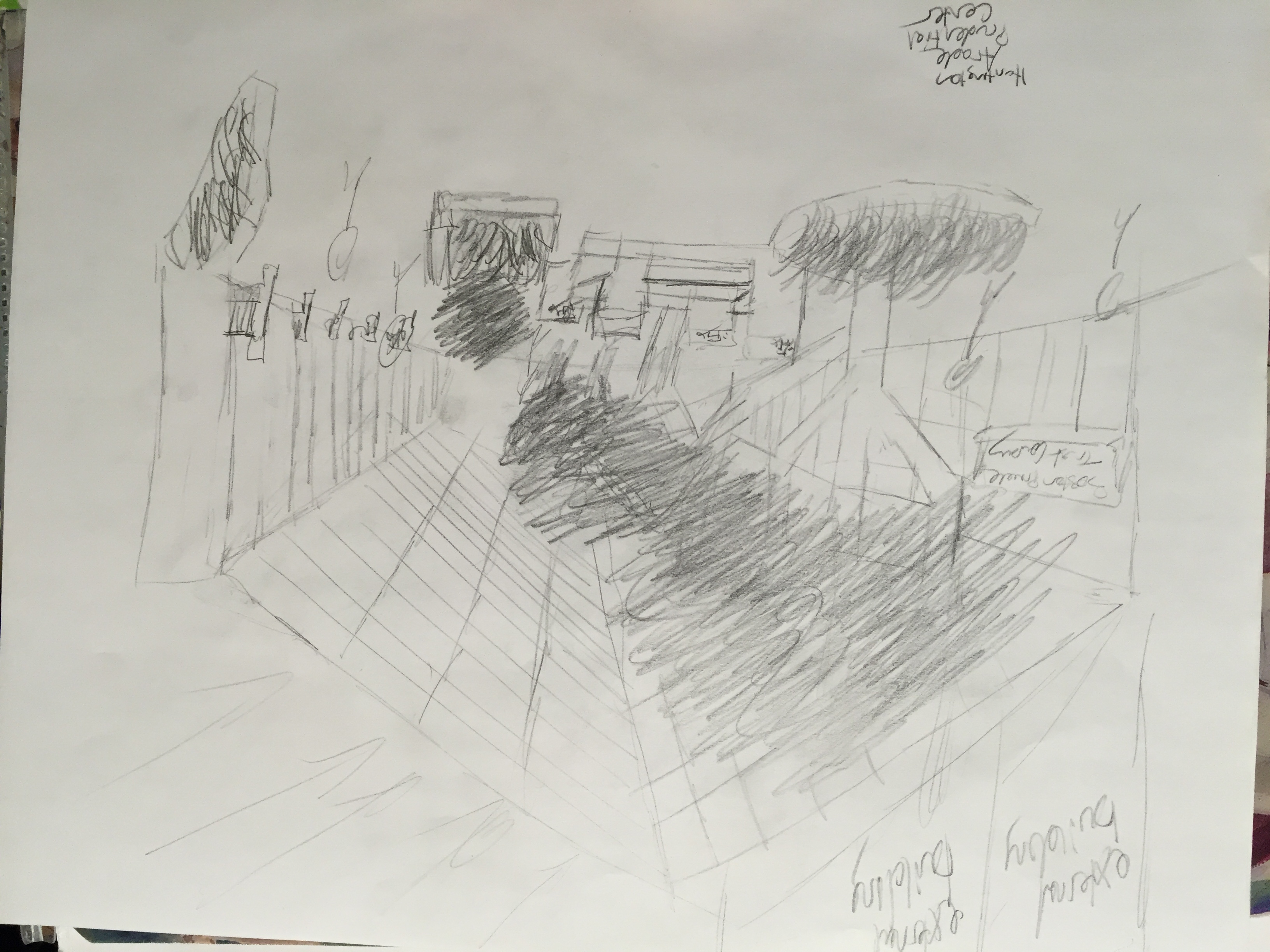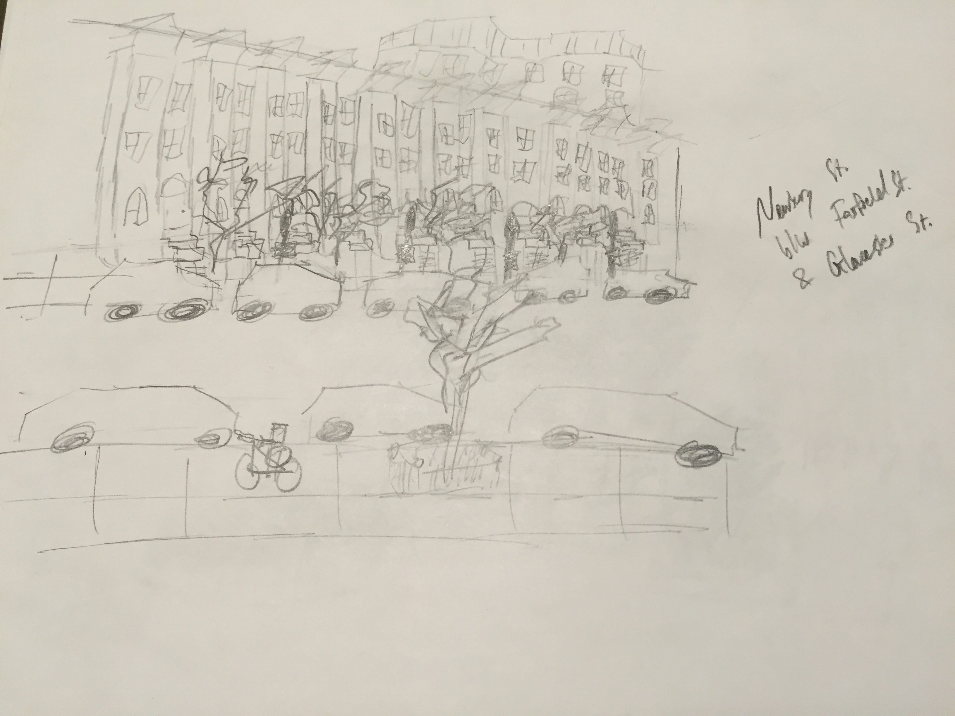 In the Pru, I was struck by the natural elements the designers built into the building, especially in the Huntington Arcade, which is the area I illustrated. Up above, the rafters were large skylight window pains that allowed mid-morning to afternoon and early evening sun to shine through. Along the center of the arcade, there were large dirt-filled areas in which trees and bushes rested – I counted around a dozen or so, and all held numerous plants. While Newbury street was lined with trees on both sides, they did not compare to the dense, green foliage that occupied the Huntington Arcade. Plus, the effect that being outside had on the degree of naturalness of the environment of Newbury Street was, in my opinion, easily dissipated and overcome by the appearance and smell of exhaust fumes and pollution.