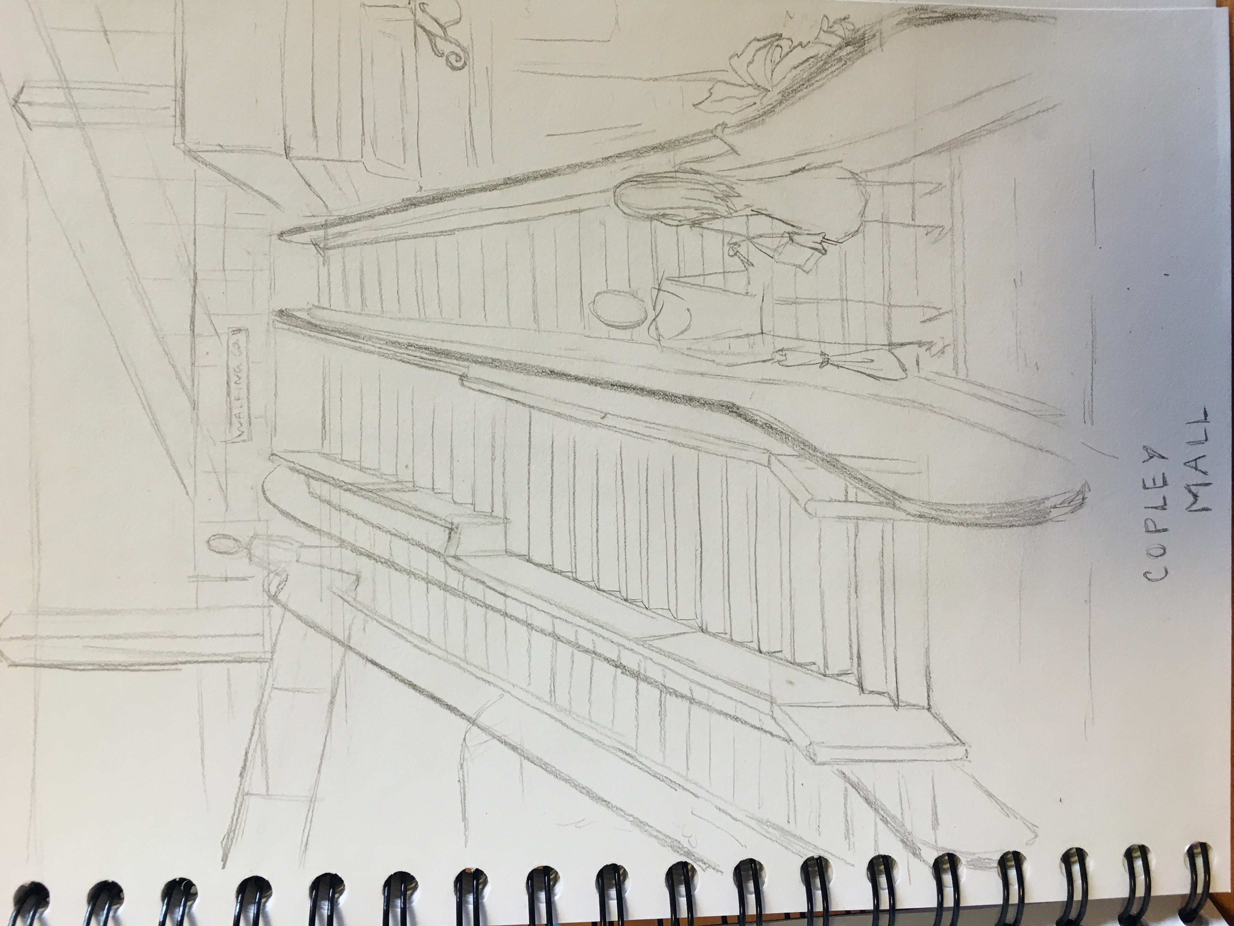 Both Copley Mall and Newbury Street may be large commercial shopping centers open to the public, but that is where their similarities end. Copley Mall is a mazelike network of hallways and escalators. For the most part, it is dark and close; visitors are closed in on both sides by stores and the occasional restaurant. There are few windows, immersing the visitor in the shopping experience. Although the mall is dotted with occasional open spaces featuring skylights, potted plants, and benches, the space is, by and large, designed for movement through and up. I tried to convey that emphasis through my sketch, focusing on escalators and stairs and the angular, dynamic lines that dominate the space.