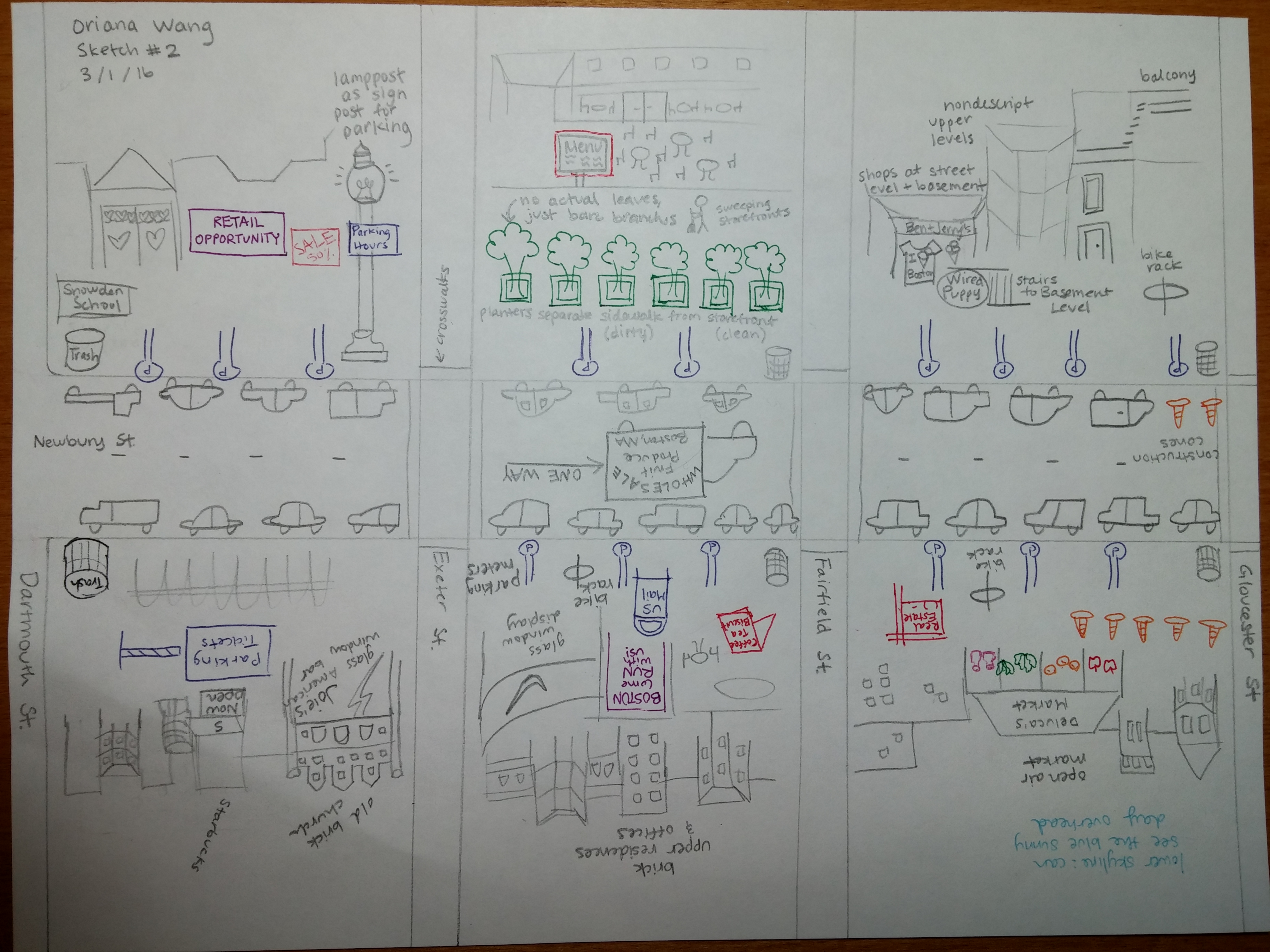 To sketch Copley Place/Prudential Center Malls and Newbury St., I first stopped by Newbury St. since it was earlier in the morning and the shops at the mall were not open yet. At Newbury St., it was extremely easy to navigate to, just one block away from the Copley T Stop. The shops along Newbury St were renting out of larger buildings, the 2nd, 3rd, and 4th floor of which were being used for residences or offices and were rather nondescript. However, the street level and basement level were much more aesthetic, with pretty shop windows, outdoor tables and seating, and the promise of finding something unique and wonderful. The modern glass storefronts were contrasted with the old brick buildings and the narrow one-way street, which at 8am was already left with no free parking spots. Parking meters, bike racks, and wide sidewalks allowed the normal heavy foot traffic during the busy times to influx into this elongated shopping area. Planters separated sidewalks from store fronts, basements were finished and sometimes housed fancy restaurants, and trash cans lined the streets. There were signs for sales, for real estate properties, for streets, and for city events, all to attract customers to individual stores, which seemed to be competing with one another for your attention. Although filled with its fair share of luxury stores, Newbury St. still seemed grounded as it had to face traffic and parking issues, inconsistent weather, city dwellers by the masses, and the unpredictable inevitability of change as stores would pop up or go out of business.