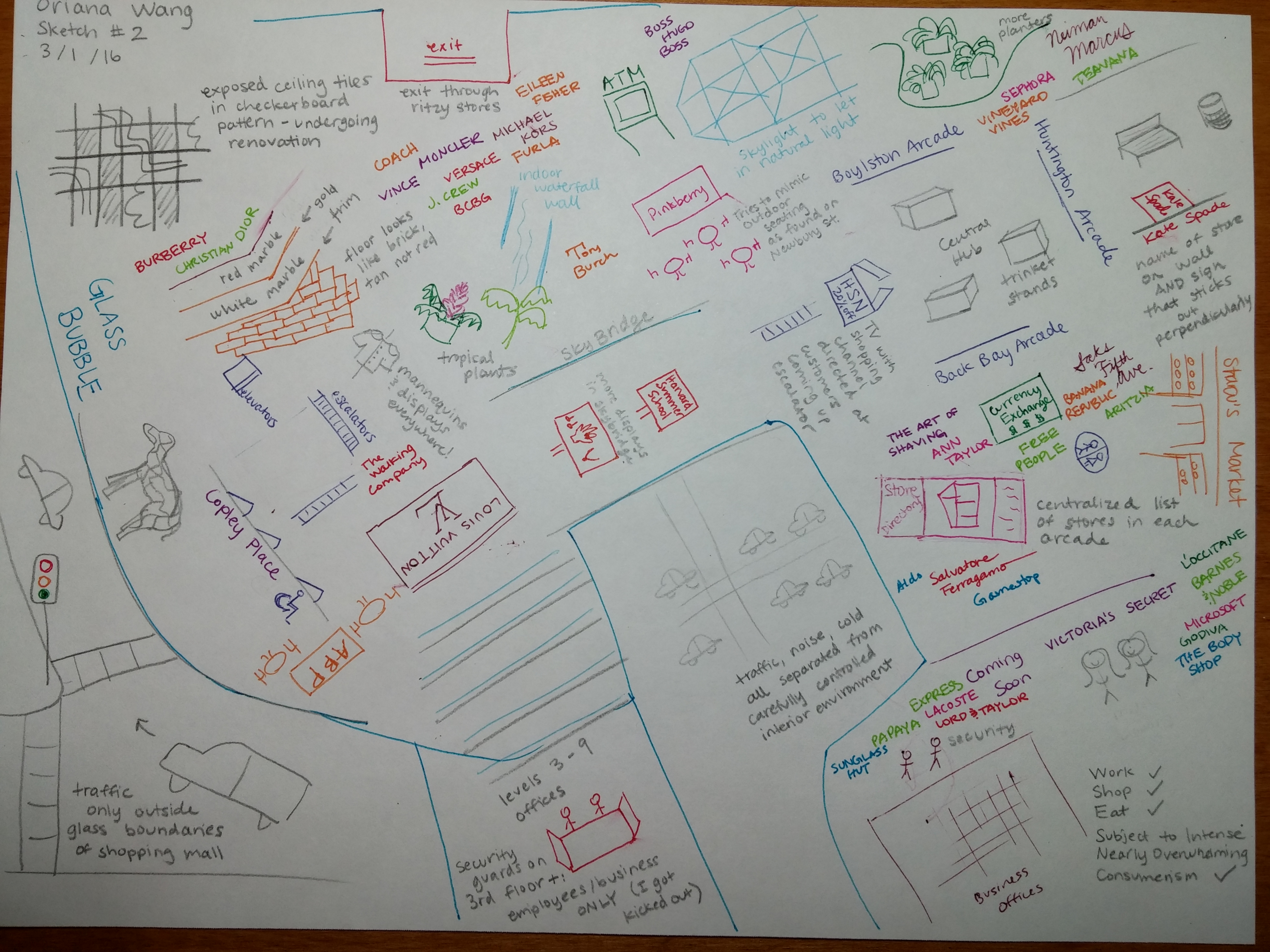 Prudential Center was similar, although slightly geared towards the middle class consumer as opposed to the luxury consumer. Advertisements were everywhere, marked exits were through department stores, benches provided some minimal seating in the center aisles, and it was easy to get lost in the maze of stores. I had a far harder time navigating my way around the mall trying to sketch. Linearity was broken. As for security, I was stopped and turned away at the 3rd floor of Copley Place, the boundary between shops and businesses. I was also questioned by a security guard as I stopped to write in a notebook and take pictures of some store fronts. Yet at Newbury St., I felt free to roam as I pleased, finding a welcoming city neighborhood as opposed to a patronizing conglomerate mall. Interestingly enough, I had never been so opposed to indoor shopping malls, and their design and implementation, until I was forced to take notice of everything through sketching. I will praise their convenience and centrality, but would much rather stroll along a street with charm and character.