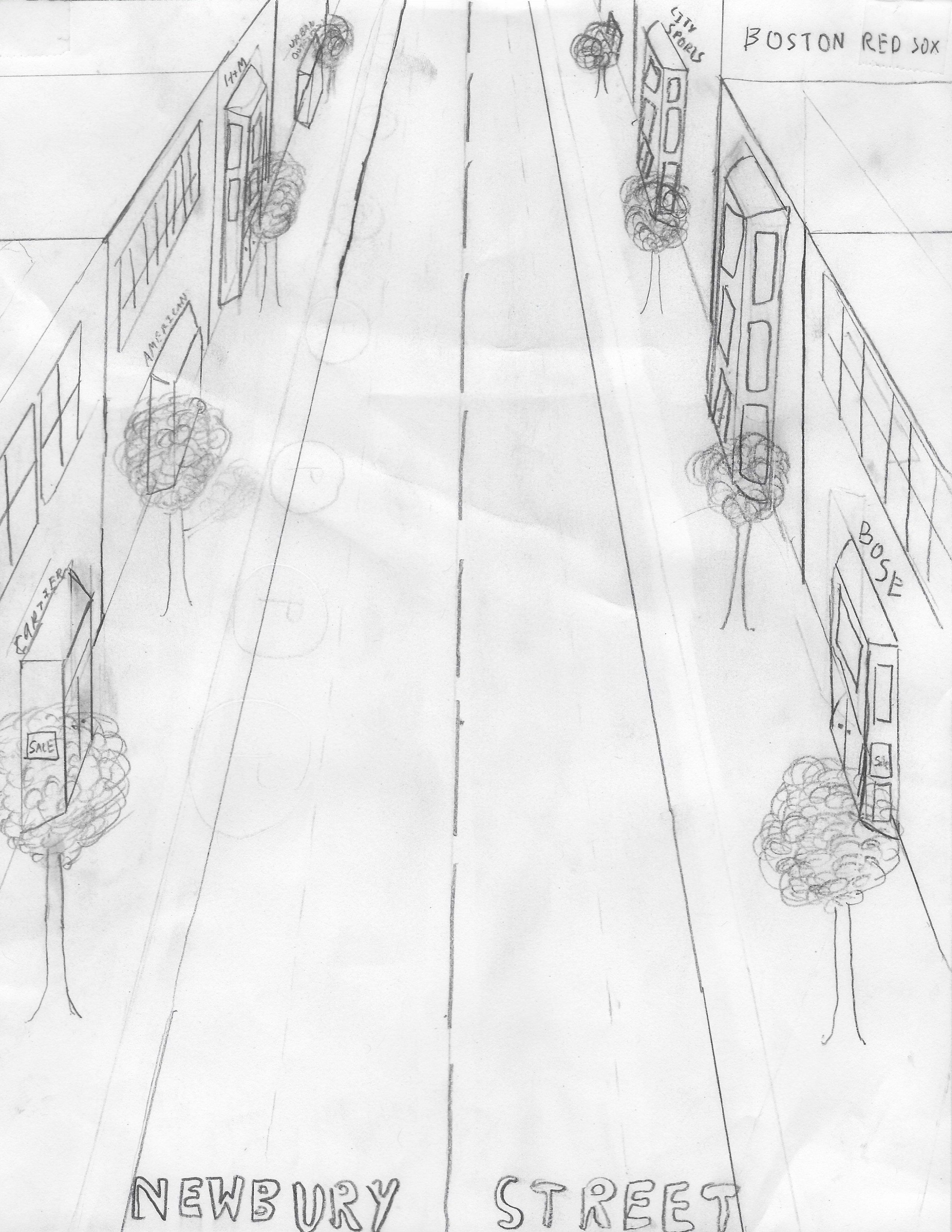 Although a completely different setting, Newbury Street has striking similarities to the two malls. The street also has very wide sidewalks and light, one-way traffic; it invites pedestrians to walk on it, even if they aren’t shopping. Most of the buildings have multistory bay windows displaying the products and drawing buyers into the stores. Also, the end of the street is the Public Garden, which attracts lots of tourists and park-goers to casually shop on Newbury. Unlike the mall, though, shoppers can “exit” the shopping center at any point by sampling turning off the street at any intersection. My sketch shows the inviting bay windows of the buildings and the wide sidewalks that people can easily walk on.