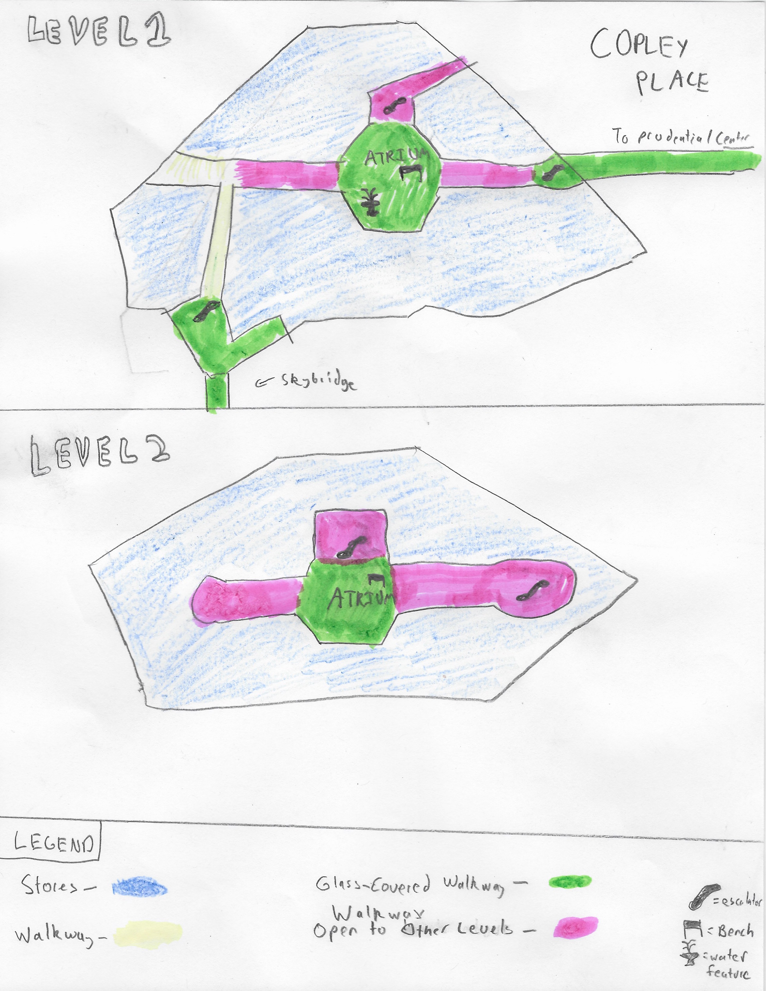 Although Newbury Street and Copley Center/Prudential Mall are very different shopping settings, they surprisingly share very similar characteristics. Copley Center and the Prudential Mall are indoor shopping malls with an emphasis on open space and natural lighting, almost imitating an outdoor shopping experience, like at Newbury Street. Shoppers enter Copley Place through either glass skybridges or a glass-covered entryway, which let in natural light, while still sheltering shoppers from the elements. The main arcade is open to the levels above, making it feel big and open. At the very center, a multistory glass atrium with a waterfall allows shoppers to sit on the centrally located benches and enjoy sunlight. Even the smaller, non-open arcades have high ceilings, wide walkways, and bright marble floors. The openness of the arcade seems to be effective as it attracted many pedestrians and was a popular place for convening (especially under the atrium). The design of the mall also has only two main entrances, “forcing” consumers to walk through the entire mall before they can exit. My sketch is a basic floorplan of the mall that shows the design elements of the walkways that make them feel open and allow in light.