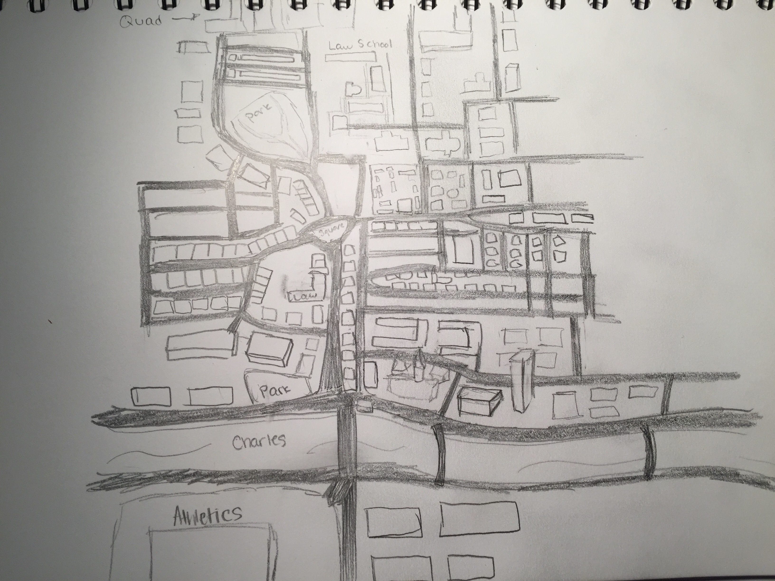 If I were to redo my sketch, I think I would start with making the large geometric centers of Cambridge, and then fill in around them, since that is the way the city appears to be organized. The Yard is a large square, then there’s the large triangle of the park, and the smaller triangle of Brattle Square. If I had started with organizing those first, I think I would have had an easier time; my mistake was trying to draw streets and connections without giving myself easy landmarks, so nothing is in correct proportions. The streets all seem to move out in a fan formation from the intersection of those three major geometric locations, so I could have more easily produced the city from starting at the center and then moving progressively outwards. It’s very difficult to conceptualize a bird’s-eye-view of a city that I am used to seeing only from walking.
