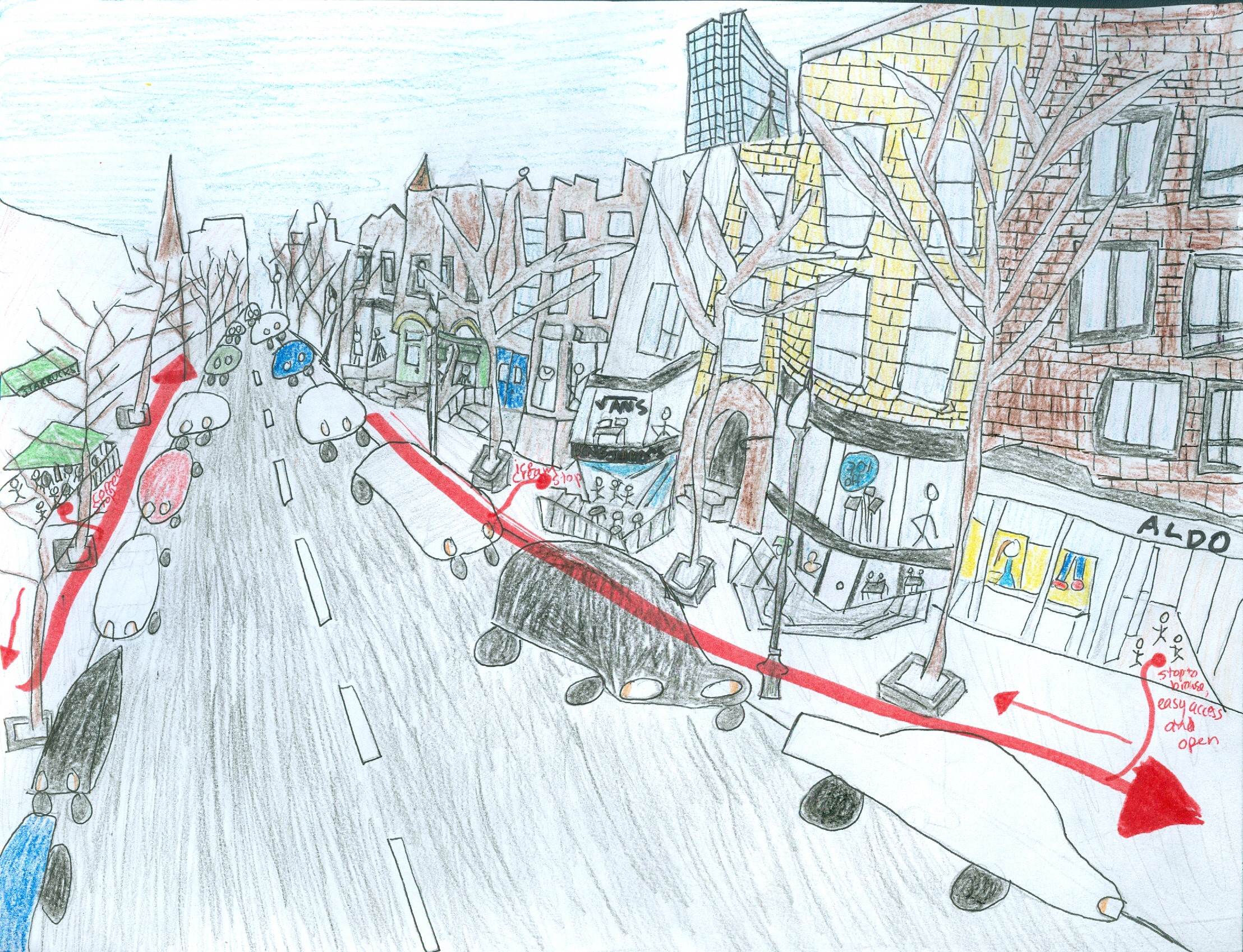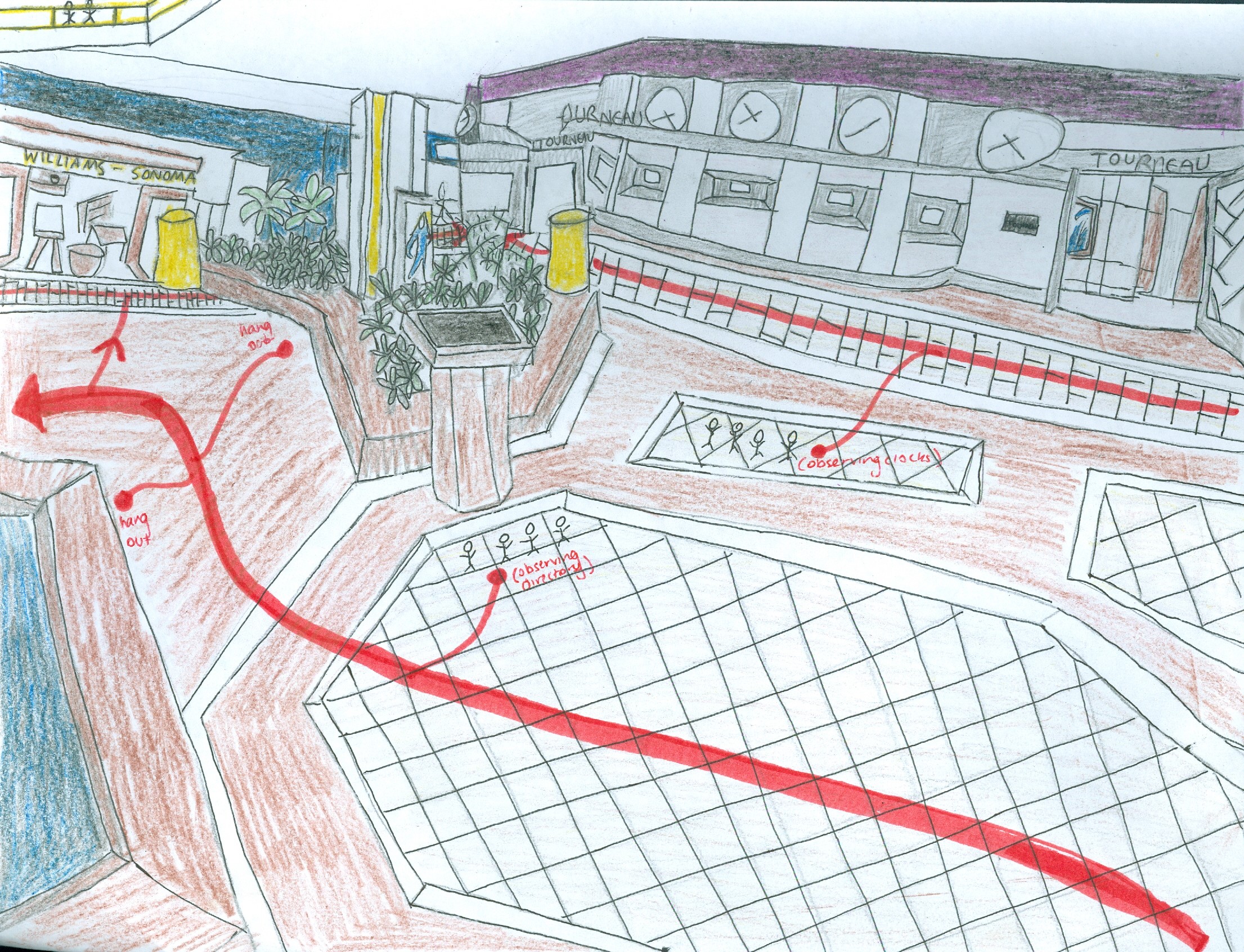 Another observable similarity between Newbury and the enclosed mall is the unique storefronts blended into a cohesive design; in the case of Newbury, this is largely 19th century brownstone. That cohesion deviates occasionally, as is illustrated in my sketch of Newbury, but quickly returns to a series of brownstone facades. It is interesting to note that larger, more well-known stores have extra sidewalk space and notably large, unique facades, much like the department stores in enclosed malls.