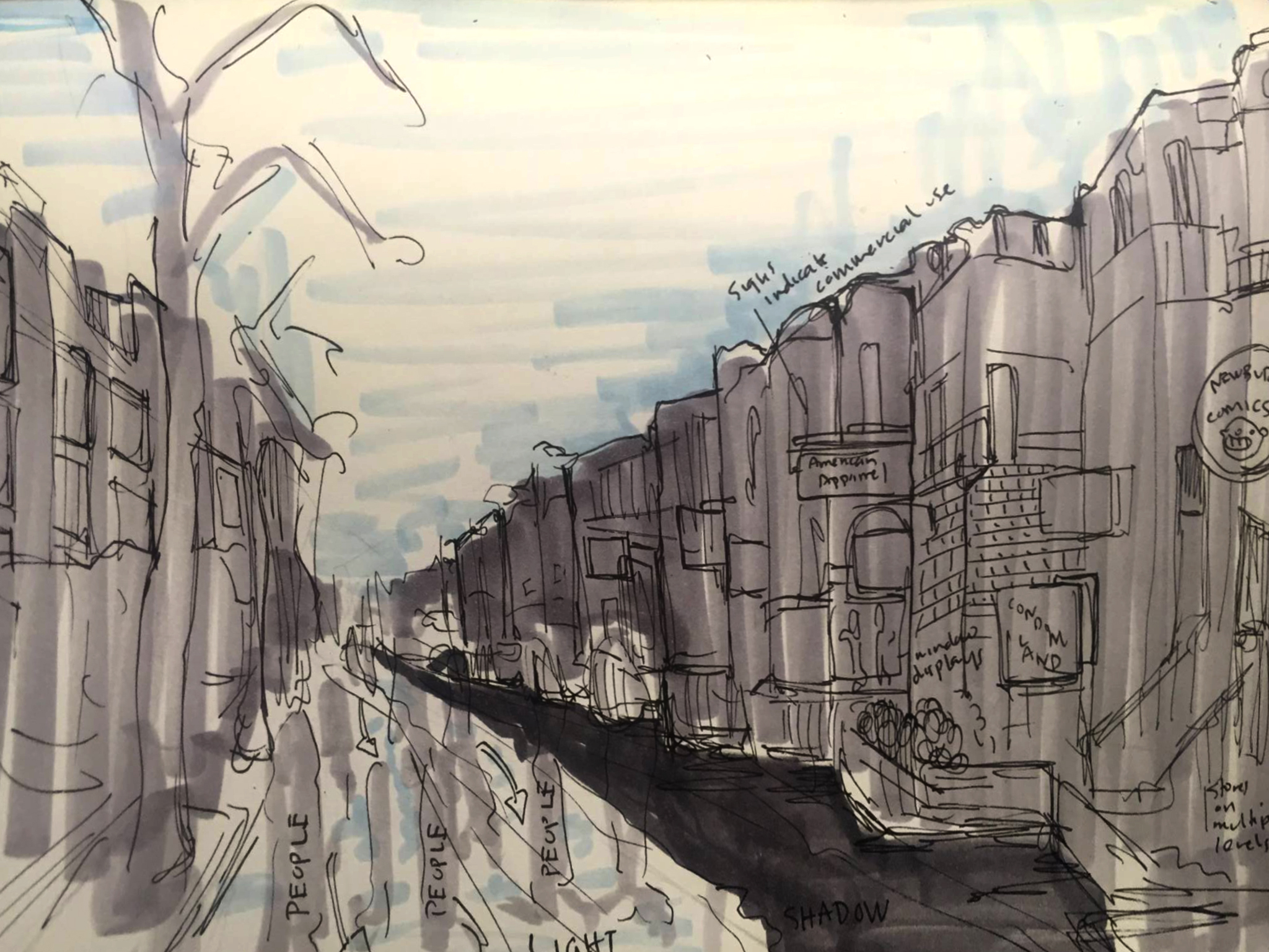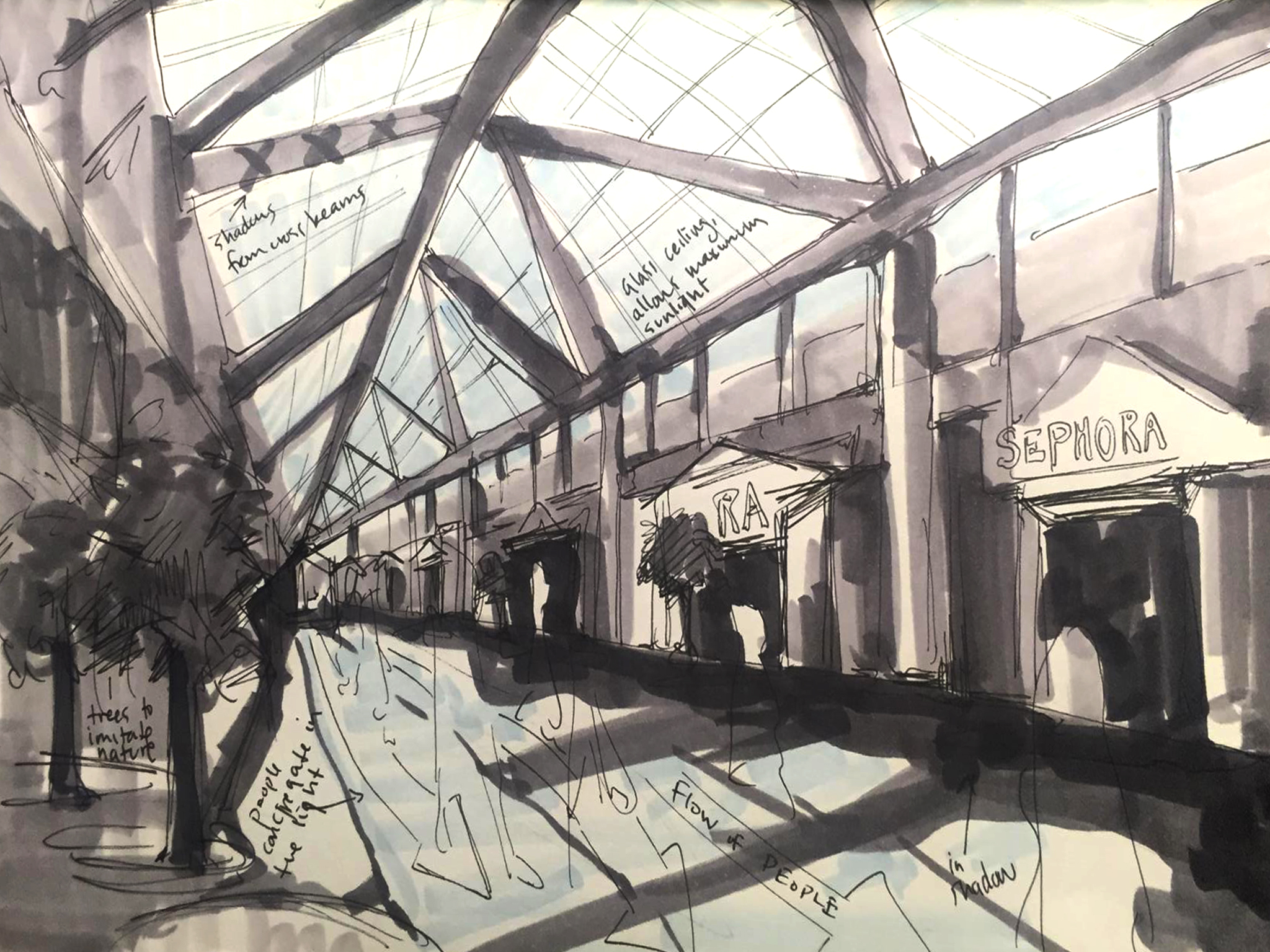 In my sketches and observations of Newbury Street and the Prudential Center/Copley Mall, I was interested first and foremost in observing patterns of light and its effect on people’s movement and congregation. On my sketches, I tried to indicate areas of light and dark through value alone, but that was not enough to distinguish them clearly, so I used a light blue to indicate areas of light.It was a beautiful day when I went into Boston, 50 degrees and sunny, and I think that played a large role in the patterns of movement. On Newbury Street, people tended to walk in the light and avoid the shadows thrown by the buildings. In the Prudential Center, people tended to walk and sit in the areas of sunlight let into the building by the expansive glass ceiling.