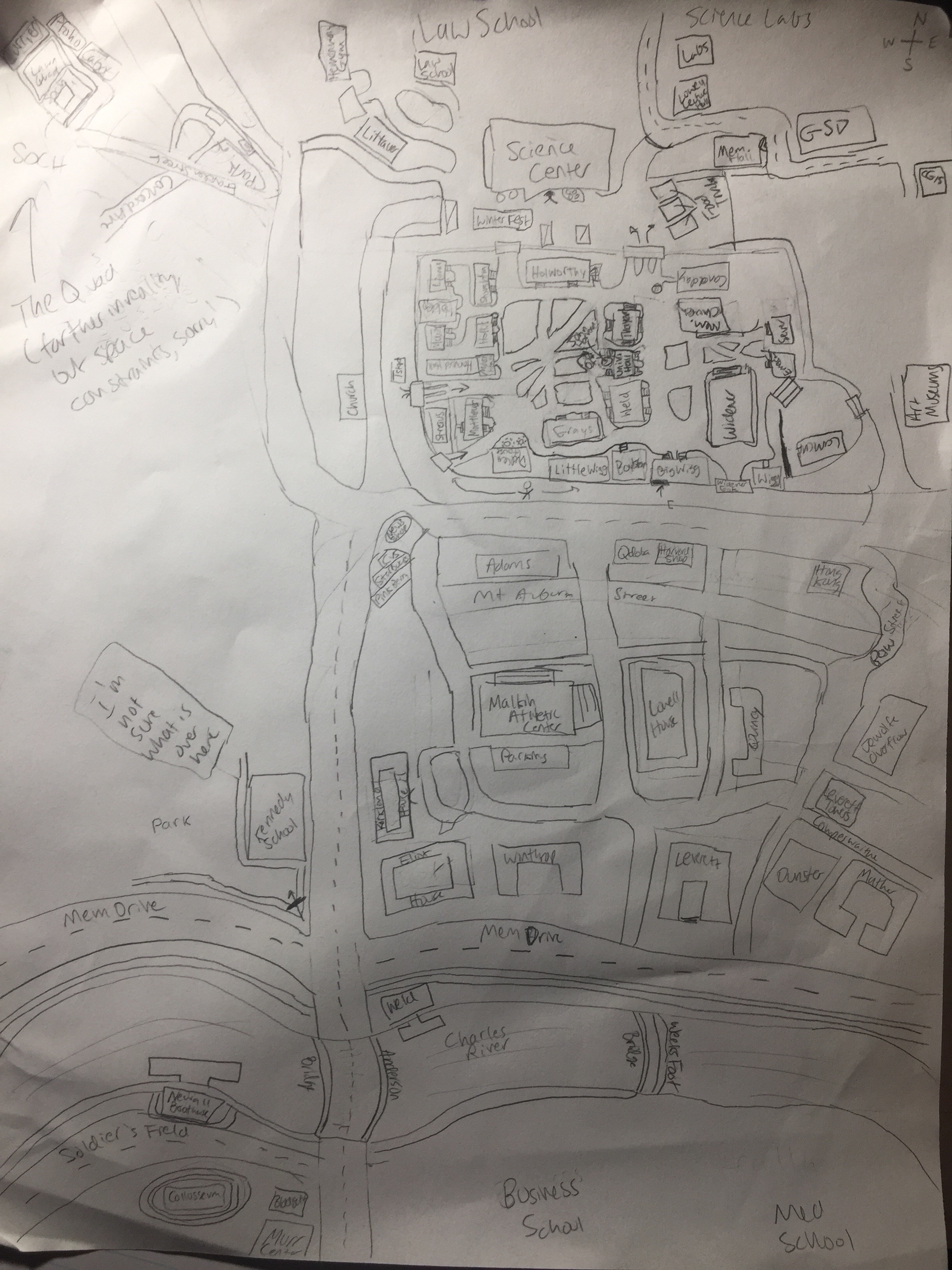 My map is quite accurate with regards to the buildings of the Yard, and relatively accurate with respect to the river house area of campus. However, it fell fall short of proportions on the location of the Quad. I was not familiar with the path to the Quad, as I do not spend a lot of time there. In addition, there were many paths in the Yard that I was not familiar with, as they are relatively randomly laid out. The shapes of the common spaces and houses by the river were also not clear in my memory, so I had to guess about a few of them. There was a large area West of the Yard the shape of which I had no idea, but none of it is part of the campus proper. Finally, the campus of the Law School and the Science Labs extends far North of where I drew, but I have not interacted with that part of campus yet. I am very familiar with the shape of the river and the bridges of the river because I have rowed on it, which helped me draw that part of campus.