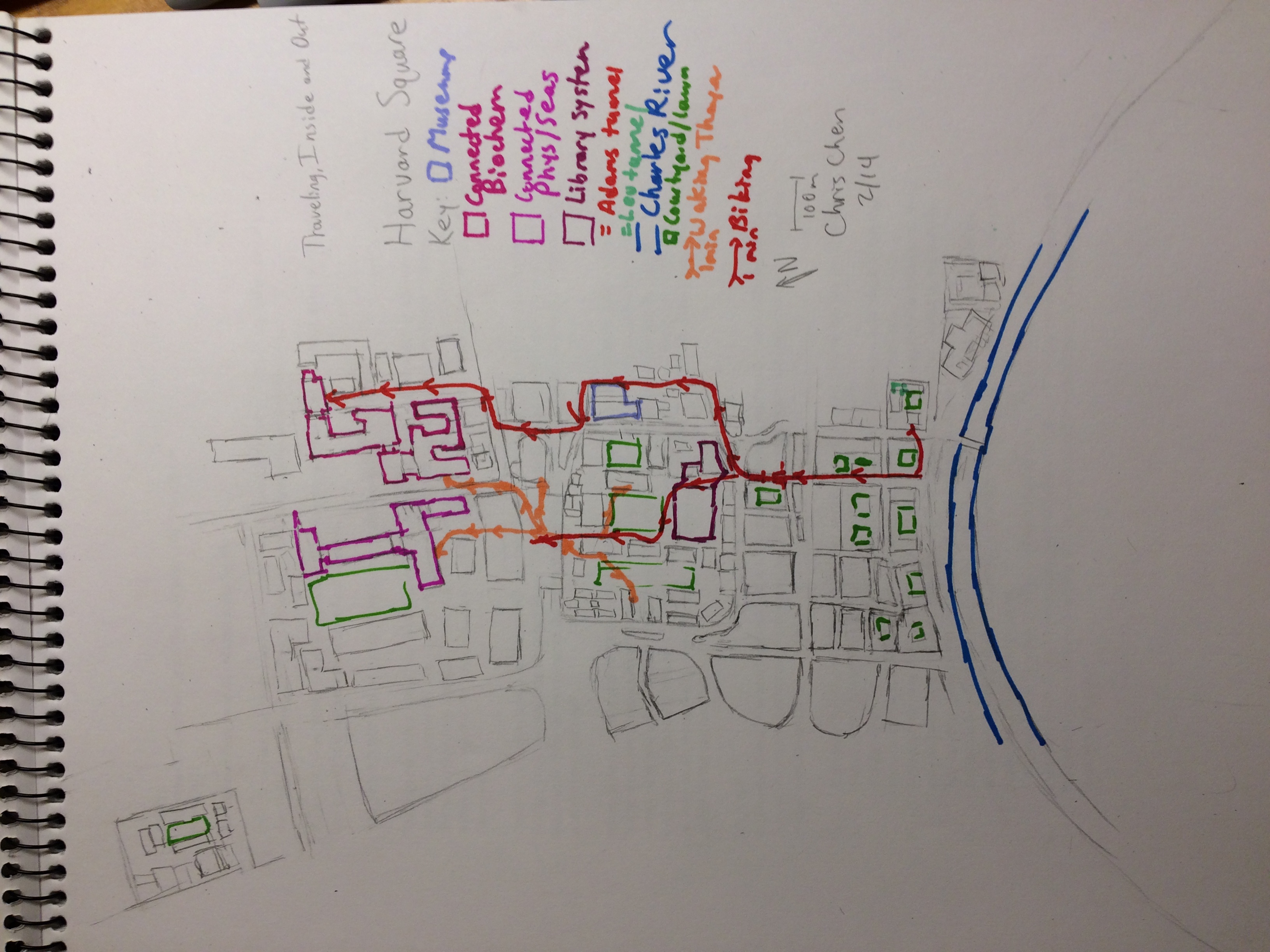 Christopher Chen The most difficult and different part of the sketch was getting the physical shapes, sizes, and relative orientations of the map features correctly. For example, most of the buildings are actually smaller than I expected. I am pretty proud of my map, in that I think it is pretty accurate. My perceptions of size and my memory make the two maps differently, suggesting I use and remember different features of the city than a camera would photograph.