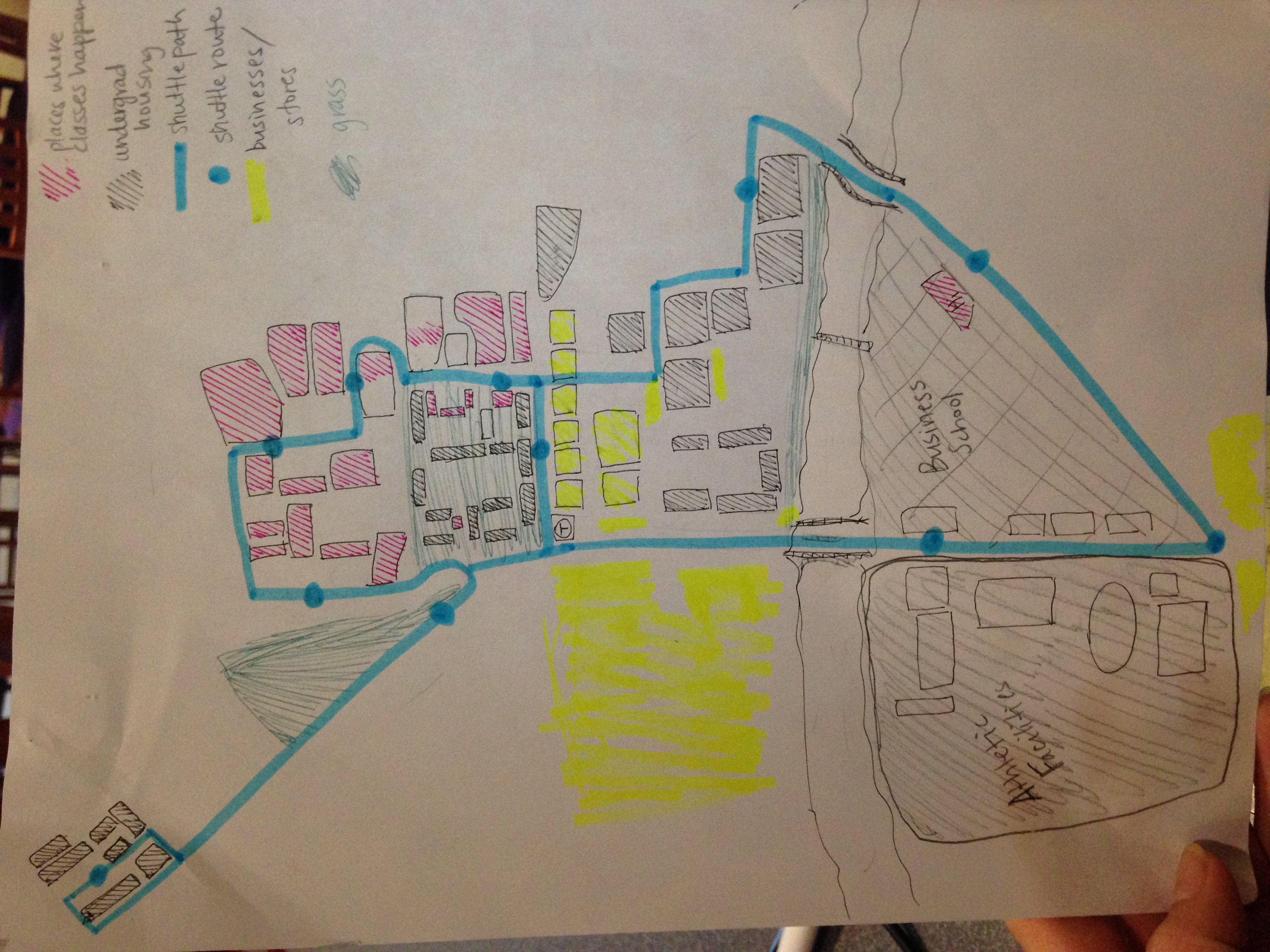 When drawing Harvard’s campus (from Quad to athletic facilities) from memory, I mapped out the common Harvard shuttle routes and differentiated the buildings from undergraduate living spaces, classrooms, and businesses. After looking at my colored sketch from a distance, I realize that I am most familiar with the areas contained within the shuttle routes. I live in the Quad and walk to golf practice very often, so I feel like I have an unusually good sense of these relatively distant parts of campus. After comparing my own sketch to Google Maps, I am most surprised by how little I remember of walkways cutting through the yard and the streets that go through upperclassmen housing. My sketch also reminds me of a somewhat futile representation of Jeffersonian planning, where the Yard is the most central public space and all other surroundings are individual gardens in a somewhat grid-like format. In the vicinity of the Yard are buildings where classes take place, buildings where business occurs, and buildings where upperclassmen can live. It is interesting to see how living, learning, and business spaces all merge together at Massachusetts Avenue. I also found it interesting to find that streets that divide different sections (i.e. living, learning, business) tend to be bigger.