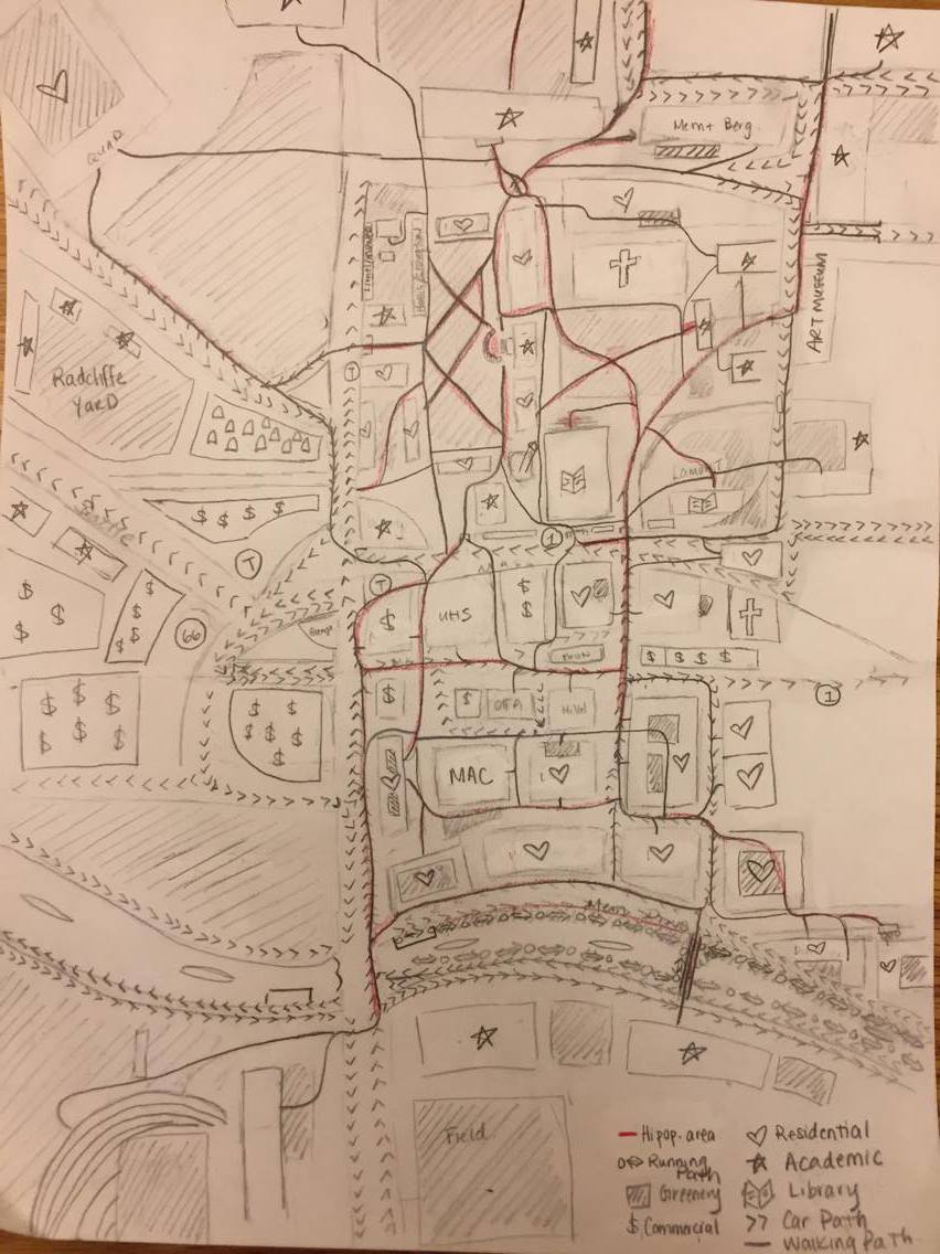The general layout of the map I drew is very similar to the official university map, with buildings appropriately located relative to each other. The level of detail for different areas are very apparent though. The areas with the greatest detail include the cluster of River Houses and Harvard Yard. However, most of Harvard Square, the Business School, the Athletic fields, the area up to and including the Quad and east of the River House boundaries have significantly less detail. This difference can very likely be attributed to the way that I use the space. Because I do not visit these areas as regularly, my memory of them are evidently vague. On the other hand, the River Houses and Harvard Yard, which I walk through daily, are drawn with greater detail and accuracy. These differences suggest that how people use and relate to the city are acutely individualized. If I lived in the Quad and was an athlete, my vision of Harvard would be uniquely different. What I notice and not notice and even what I choose to include and not include uniquely represent my experience. With a city being used by a multitude of people in several different ways, designing spaces that consider as diverse perspectives and functions can be critical to creating a space that will be well-remembered by all.