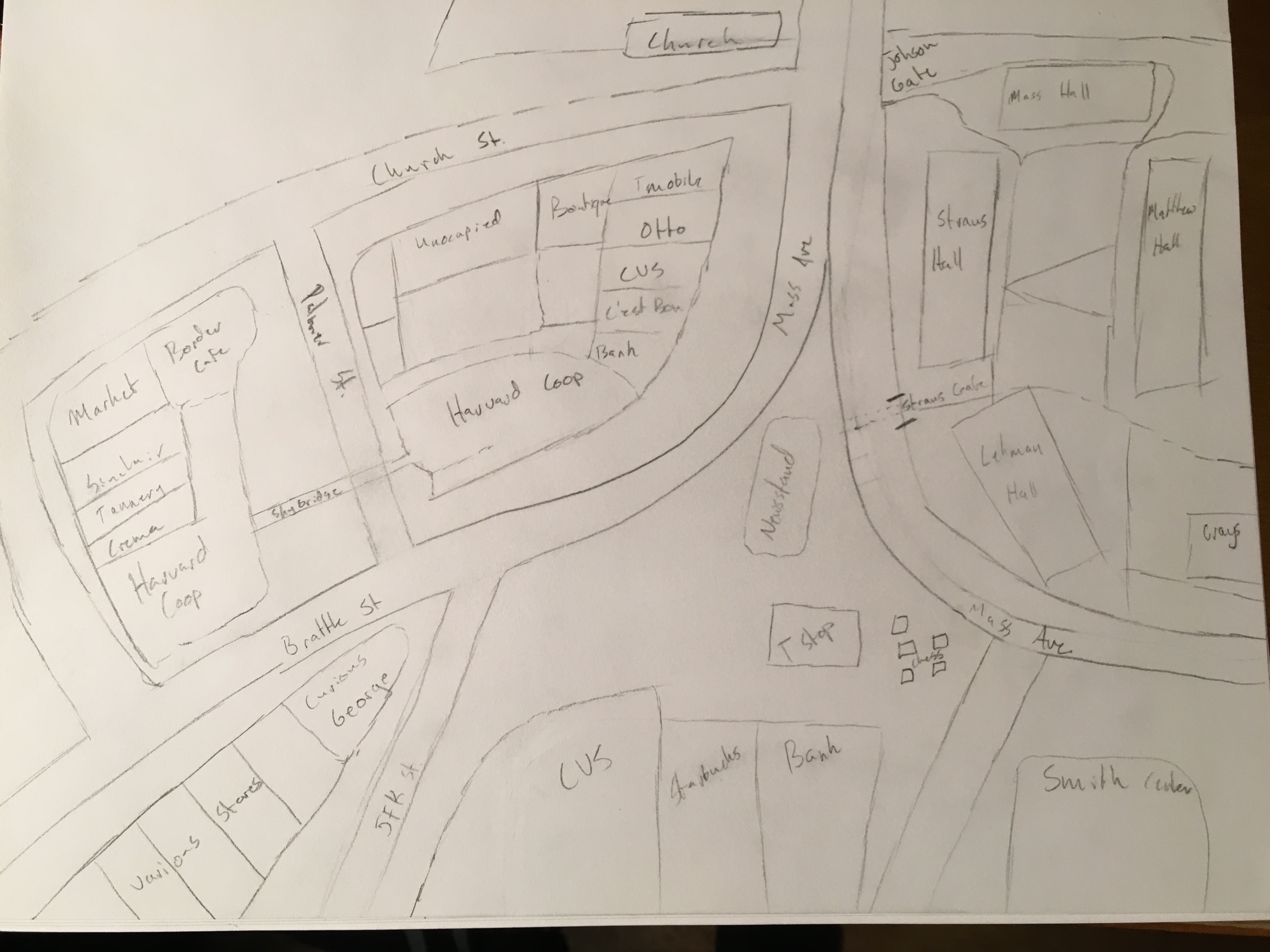 My first impression was that after looking at a map, the scale of my drawing was a bit off. Some buildings were a bit larger in the sketch than they actually are (Harvard Coop). I think this reflects what locations I've been to most in the Square.