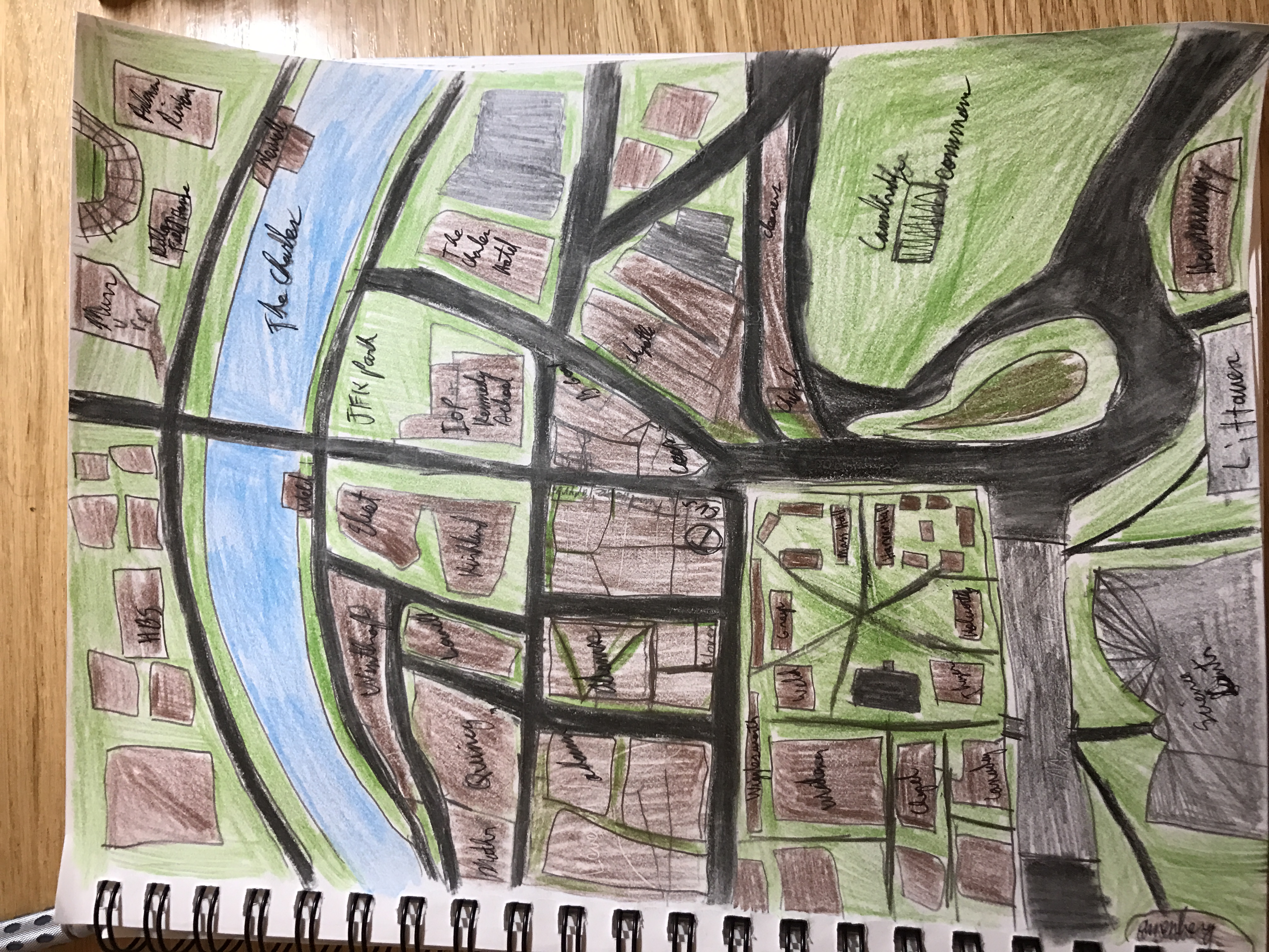 I think that the overarching features of the area are similar in my drawing and in the actual map. I paid particular attention to the layout of buildings in the yard as well as the area near The Charles on the Somerville side. I also focused a lot on making sure to add color to the photo in order to separate different types of spaces, in particular: water, pavement, grass, and buildings (both classic brick and modern). One aspect that I found particularly difficult was the proportionality of roads, the exact directions of each road, and how the road systems are connected. In addition, while it was not very hard to picture each part of the map from the perspective of someone walking on the ground, I found it particularly difficult to mentally adjust this image to a bird’s eye view. I think that my map and the exact map are different primarily because people do not remember tiny details of places with which they do not normally interact. For example, I walk down JFK St. to the boathouse every day yet I could hardly remember the order of the shops along the street except for the ones that I frequently visit (i.e. CVS). However, as I mentioned earlier, I think that people retain a good general relative spatial perception of the area around them with regard to the general shapes of roads, buildings, and parks. In other words, I know that the Science Center is beside Annenberg and across from Canaday, but it is hard for me to remember exactly how the path between the buildings looks or what the relative distances between each one are.