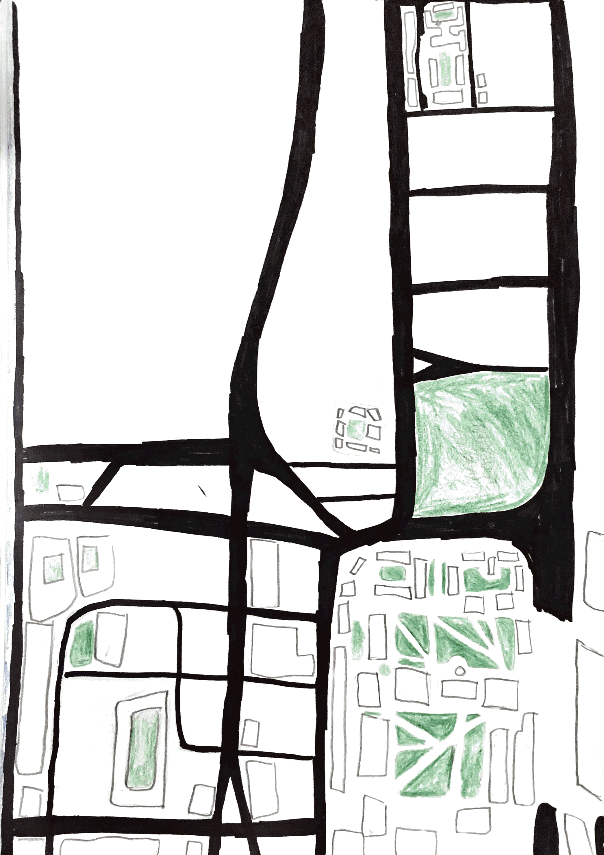 In this drawing, while looking at private vs. public space, I tried to emphasize three kinds of space—Harvard space, green space, and streets (the most public space). Though there are more buildings in the area, I only included Harvard buildings and those with which I interact with in a Harvard setting because they are fall somewhere between public and private space. To my classmates and I, they are public—within the buildings outlined in gray, there are few places we are not allowed—but to the general populace, the buildings are largely guarded by swipe access or, in some cases, actual guards. The green space also falls in a gray area between public and private space. Some of these spaces are publically owned and accessible (Cambridge Common), some are privately owned but publically accessible (Harvard Yard), and some are fully private, gardens rather than parks (the courtyards within the houses). The streets share none of this fuzziness—they are open to everyone. What I found most enlightening and frustrating about creating this drawing was relating one section to the next—things would feel in scale, or seem right, but then when I would add the next piece, it wouldn’t fit together like it should. The streets feel straighter when you’re walking them.