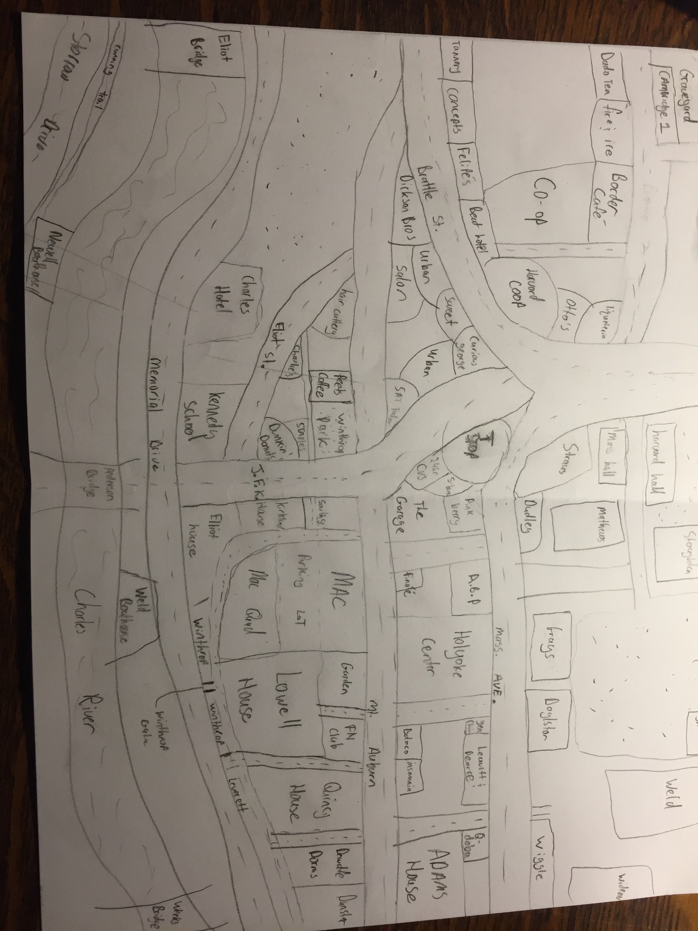 For my map I started by drawing what to me is Cambridge’s defining feature, the Charles River. From there I added the bridges which I row under every day, and the intersection of JFK and Memorial (the arteries I use to walk to practice). I added Mt. Auburn to the north, and then Mass Ave…the rest of the streets were a bit of a struggle. I began to fill in the locations of the coffee shops I frequent, Peet’s, Dunkin, Starbucks. I can easily imagine the surroundings of these locations. Restaurants next, Cambridge 1, Border Café, Beat Hotel, Felipes. I have spent much time looking out the windows of these establishments. Next I filled in what it outside my window, Winthrop House and the MAC quad. It was harder for me to remember the exact layout of the yard and Mass ave, my home base of three years ago. Additionally, the area west of the Charles Hotel, to which I rarely venture was difficult to map out.