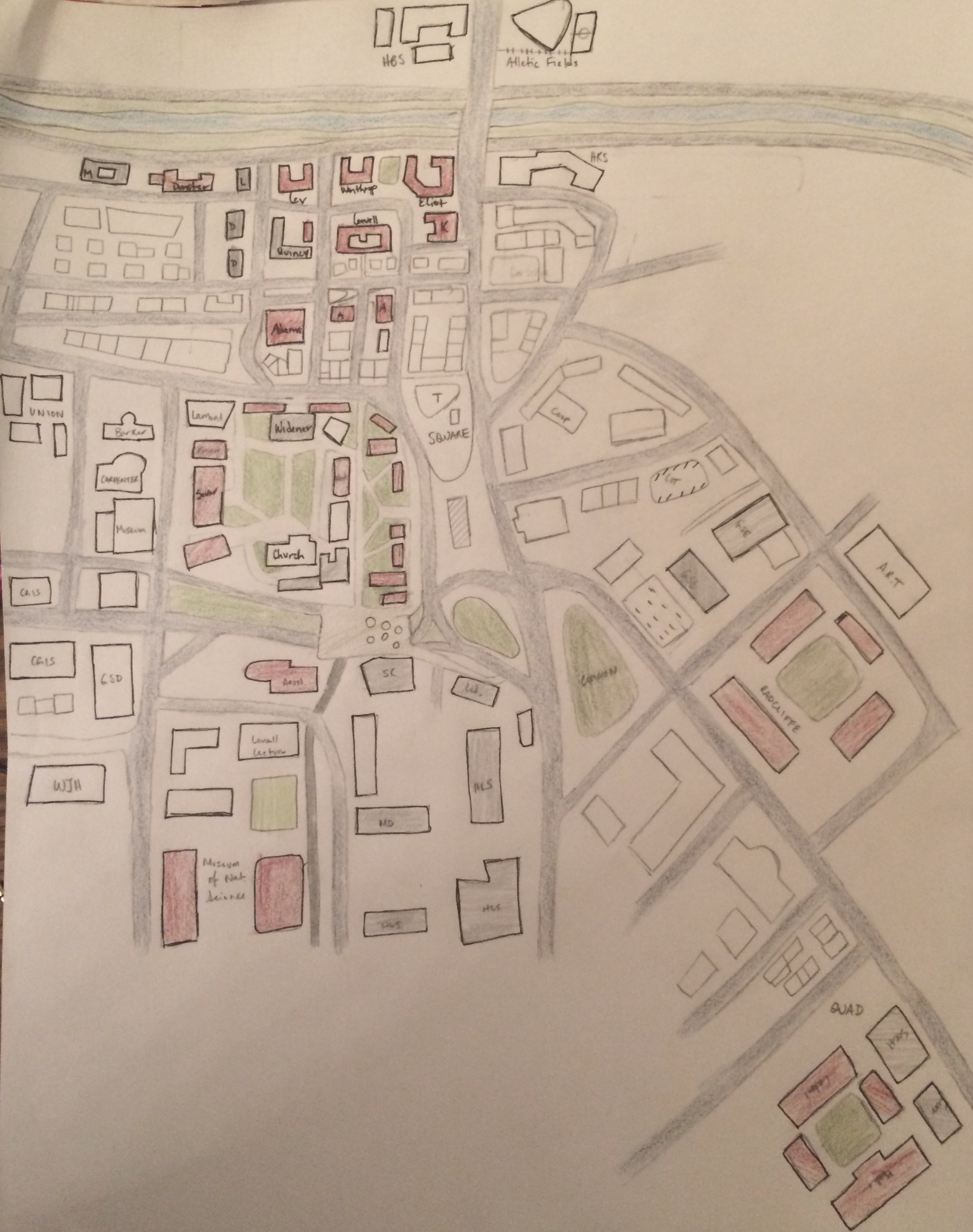 One interesting thing I noted was that I completely turned the map’s orientation. That is, most maps illustrate the river to law school (down-up). For some reason, it was easier to envision the square and the Yard in that way. There was a clear poor sense of spacing in the areas I don’t often walk to. For example, the Dunster-Mather and Quad areas are very disproportionate. They are 1) too close to the yard and 2) either smaller or larger in comparison to other houses. Likewise, for the area past Lowell Lecture Hall—where I usually have class—there is a lot of free space and random buildings. Besides that, my map is fairly accurate to the original rendition. It captures most major buildings and provides a good sense of the pathways in play.