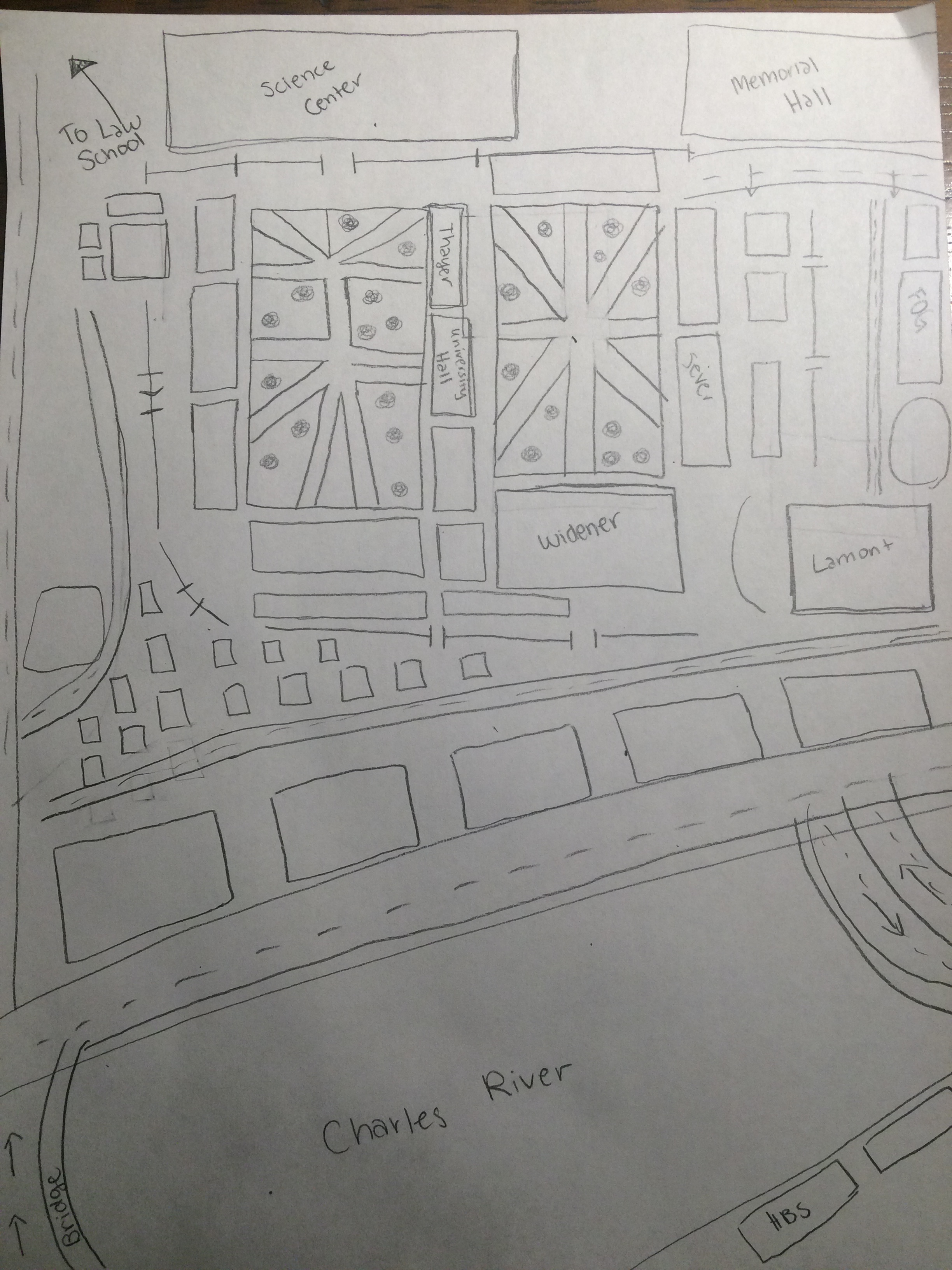 Overall, my map is pretty inaccurate; however, my portrayal of the Harvard Yard and Tercentenary Theatre areas is decent. I think this is because, as a freshman, I spend most of my time around the Yard so that region has become the most meaningful to me. It is also what I see on a daily basis, so I know my way around a bit better. The major flaw of my map is that I made the Yard too close to the Charles River. I think part of this was simply miscalculation while drawing, but another part is that I do not venture to the upperclassmen houses as much so I do not really know what is around there. When I do go to the river, I usually do so on runs so that makes the distance feel shorter than it is. Additionally, I made the river very large since, as I do not cross it that much, it feels like a strong barrier between Harvard and Boston. I also did not know the arrangement of streets in Harvard Square because I walk everywhere. Overall, the way my map turned out makes sense to me. It is accurate in the places I frequent, and very off in unfamiliar areas.