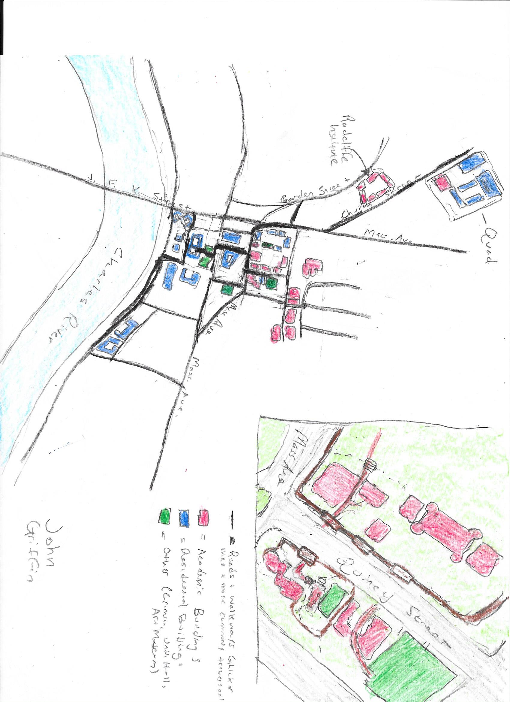 Attempting to reproduce a map of campus from memory, I realized that my knowledge was very limited to a small triangle bounded roughly by Dunster, the Yard, and the intersection of JFK and Mt. Auburn. My ability to map anything on the "other" side of JFK or anything past Quincy Street was basically non-existent, despite going to both places with some frequency. I was also surprised at the extent to which my memory of the Yard and the areas bounding Quincy Street were significantly better even than my memory of places near my own house. I also seem to have made the Quad bigger and closer than it actually is.