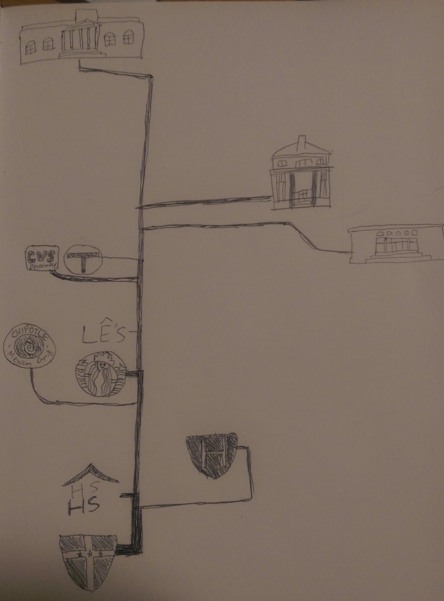 In this sketch, I attempt to visualize my own path around Harvard by drawing the places I frequent the most. In this sense, my representation of Harvard only takes into account the things that matter to me, leaving out the vast majority of the campus that may be of importance to others. Overall, I depict places of living (Kirkland House, Starbucks and CVS), leisure (Chipotle, Le’s and the T), academics (Littaeur, Emerson, and Lamont), and extracurriculars (Malkin Atheltic Center and Harvard Square Homeless Shelter). I used a logo when it was available and drew the building otherwise, as was the case for the buildings where I take classes and study. In order to depict the relative importance of the different locations and my movement throughout the campus, I drew the thickness of the path based on how frequently I followed it. For example, I spend the most time in Kirkland House at the bottom of the sketch, so the line is extremely thick. Because I go to Chipotle much less frequently, the line is much thinner.