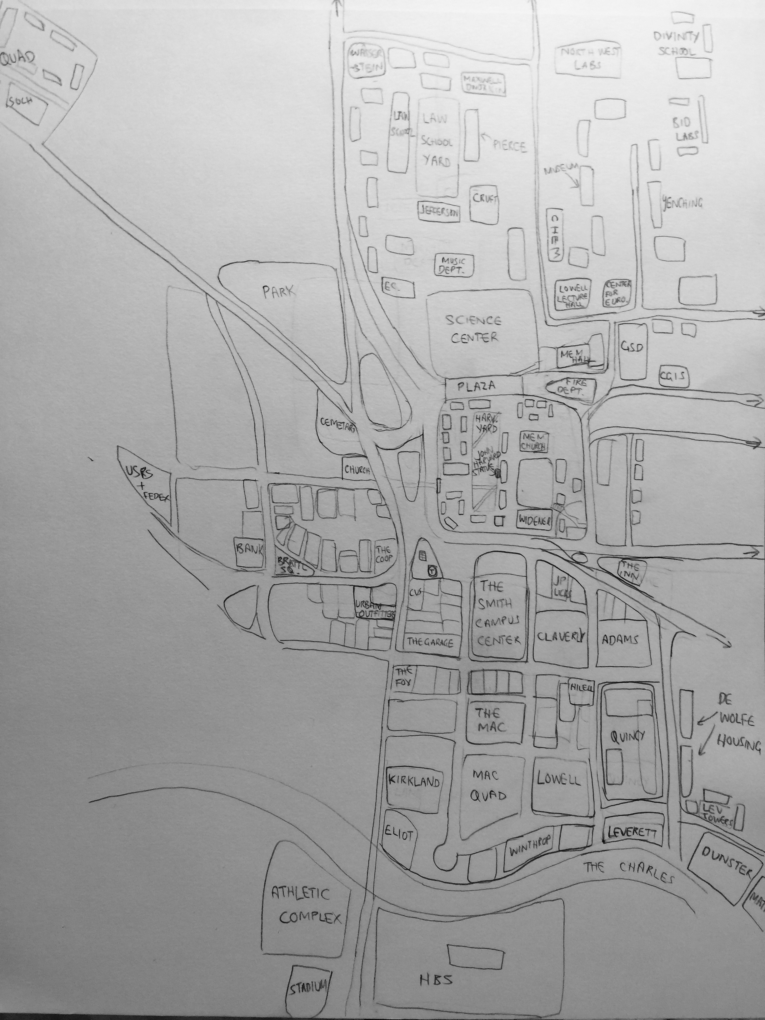 This exercise made me realize how little I pay attention to the buildings on campus that don’t use. Examples of this are Wigglesworth (freshmen dorms) and The Harvard Lampoon. I also made the area behind the science center - with all the engineering, CS, chemistry and biology labs - larger than it actually is. This might be accounted for by the fact that there is a lot of grassy area around those buildings which creates the illusion of more space between buildings than there really is.