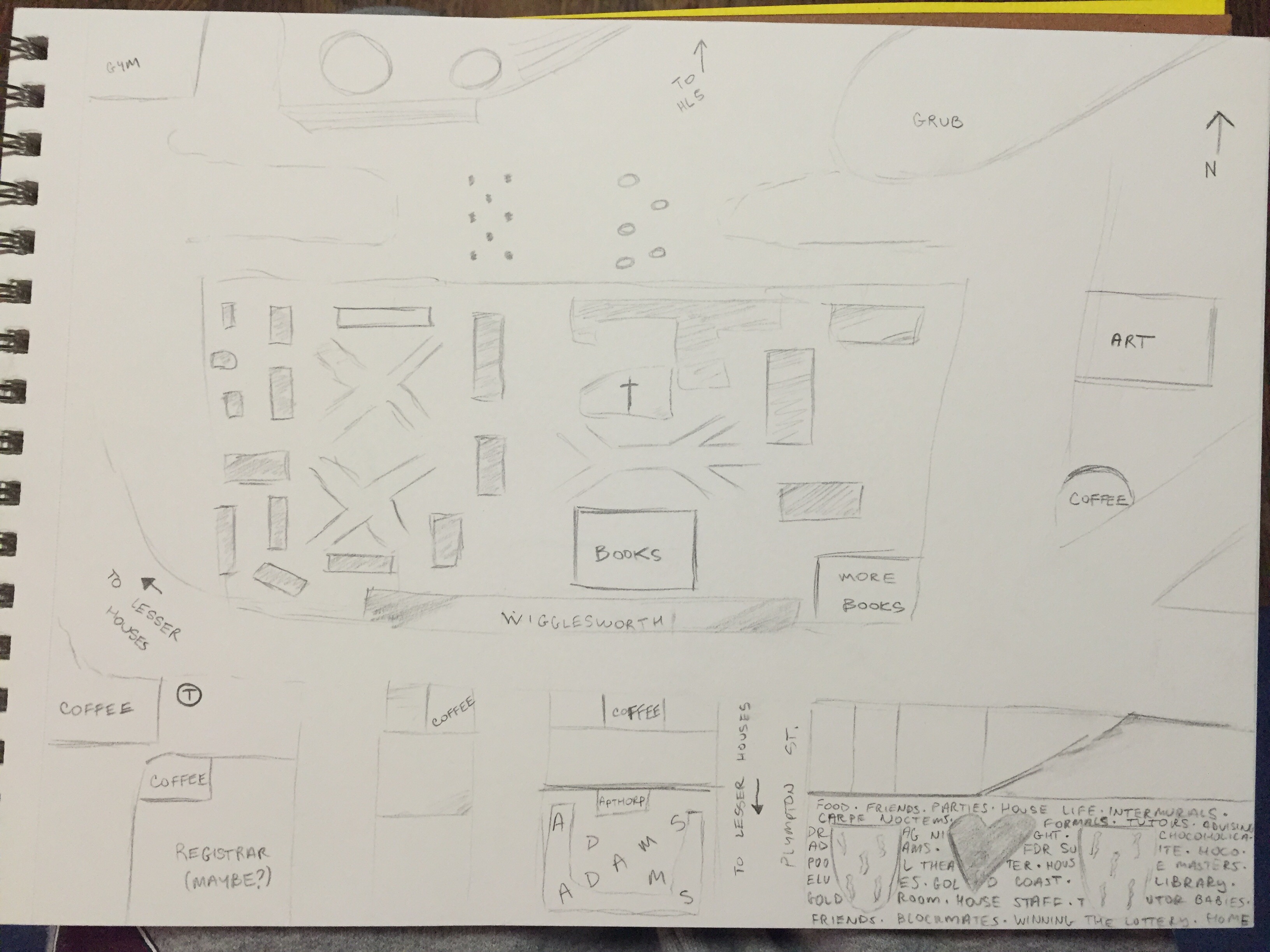 The central part of campus is Harvard Yard and as such takes the central location on my sketch. If I had a bit more time and artistic ability, perhaps I could’ve inverted the map to make Adams the center of my sketch (since it is the center of my Harvard universe). I was able to draw out the big buildings in the Yard that I’m familiar with—i.e. freshman dorms, classroom buildings, but I definitely haven’t stepped foot in places like Robinson Hall or Loeb House to remember to include them. I think I also drew the paths incorrectly; however, the aim was more to show some representation of a walkway rather than necessarily depict the existing walkways. Additionally, I think my scale is some way off given that Adams appears much larger than some of the dorms in the Yard, and Widener is nowhere near as large as it should be (it is much bigger than most of the dorms), but the shapes and sizes I drew are the evocations of these places in my head and probably as such depict their relative importance to my life.