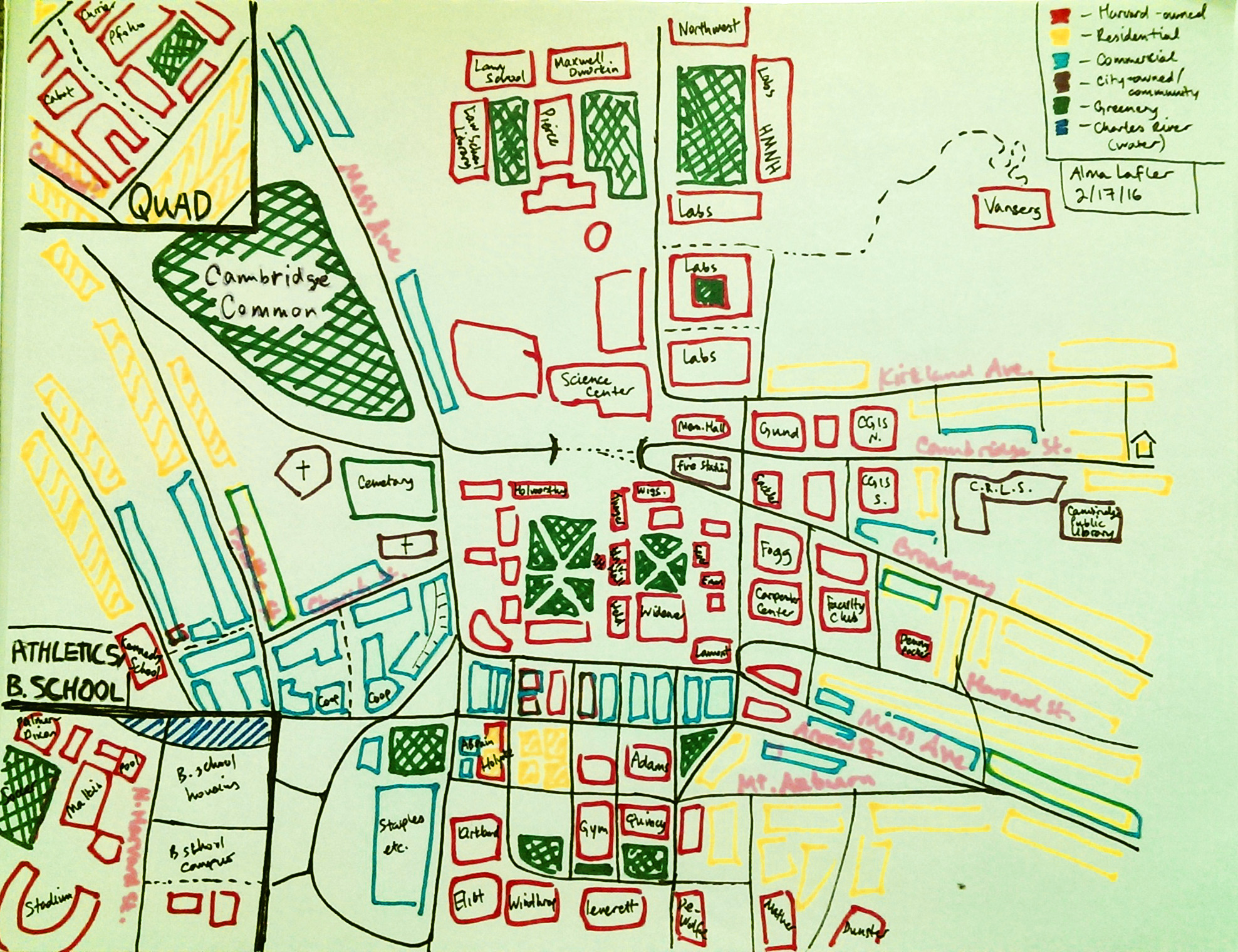 My map is accurate enough that it could help a tourist get around the included parts of town with little trouble. I commute around campus by bicycle and am very familiar with the road network around Harvard, which would likely make it different from a map drawn by someone who, for example, takes the bus and doesn’t need to pay attention to the roads between their origin and their destination. On top of this, I grew up in Cambridge, and was able to bring other personal landmarks to mind when I was thinking about the shape of the campus.