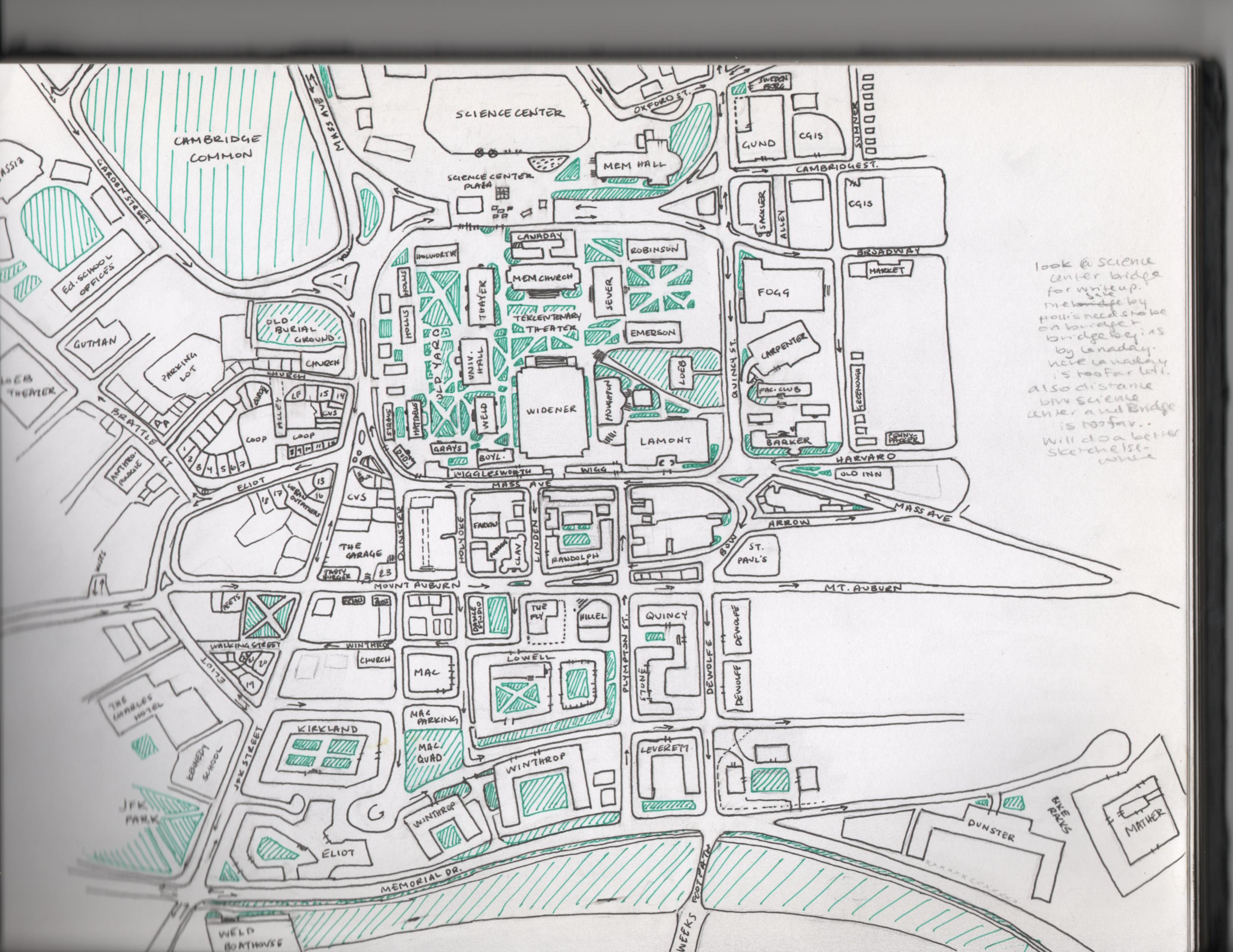 It’s immediately obvious, looking at my map, that my knowledge of Harvard is very much concentrated on the Square and the Yard and as one gets further towards the periphery of the campus and surrounding area, my knowledge rapidly diminishes. While the center of the map is pretty accurate and recognizable as the Harvard Square area, the Quad looks absolutely nothing like how I drew it—for one thing it’s further away, but it’s also much larger with more buildings. The Law School, Mather, Dunster, the Kennedy School, the Business School, and much of the athletic complex fare the same way. I even forgot Leverett’s dining hall.
