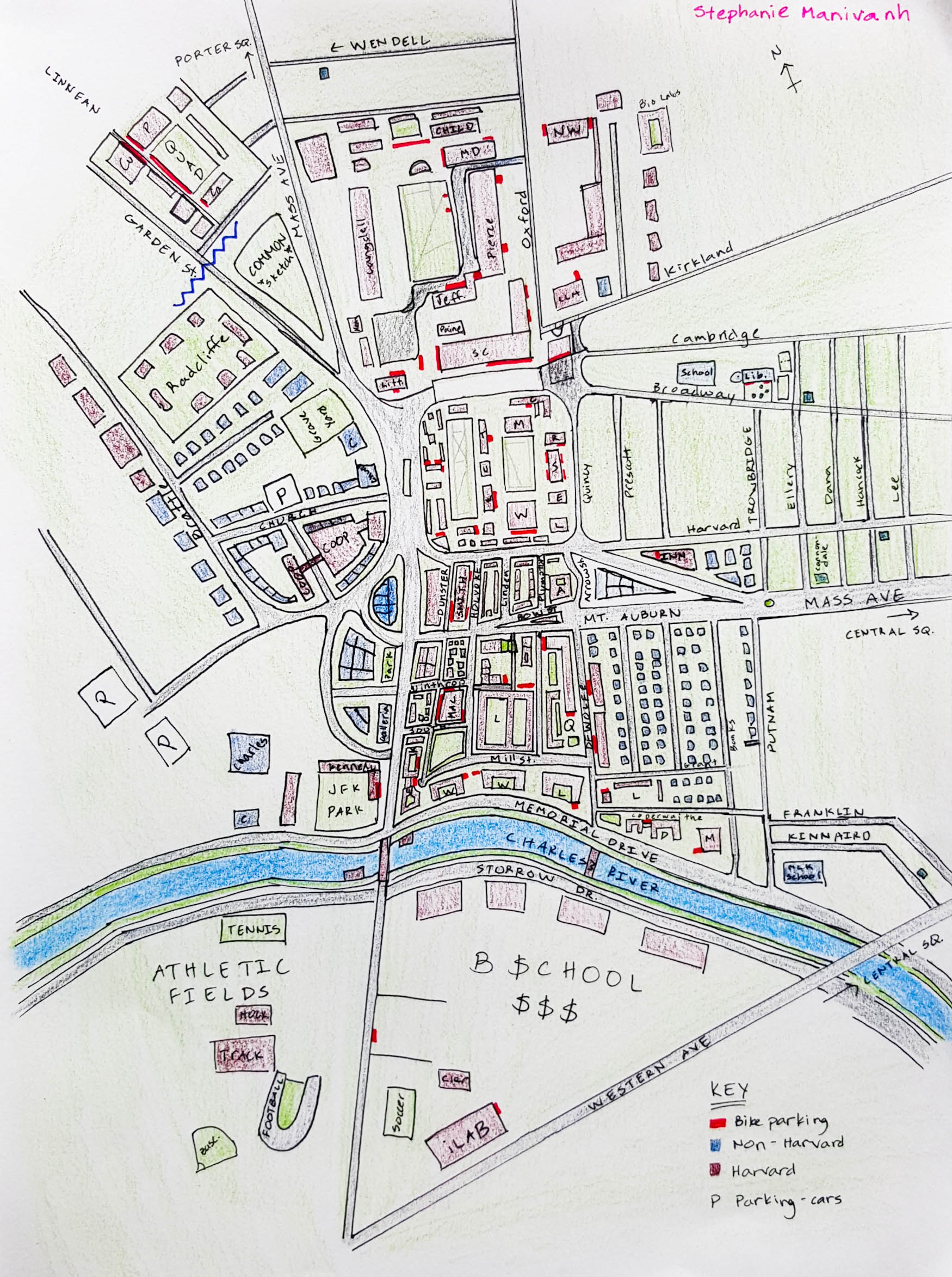 My map is a pretty accurate top-view rendition of how the Harvard Square area actually looks like. The places that I’m most inaccurate in drawing are places that I rarely visit (business school and the athletic fields, parts of the quad). I think the fact that my map is so accurate in naming streets is because I bike literally everywhere (in red I’ve marked all the bike parking areas I can think of) so I refer to Google Maps a lot. I’ve also been in Boston for three summers straight so I’ve had a lot of time to explore Cambridge. I can see that I pay most attention to exactly how all the streets intersect and are organized. What helped me create this map was actually closing my eyes and visualizing my bike rides and walks around certain areas. Also, since I have a lot of friends who live in the area I am very familiar with the order of the streets leading to Central Square in particular.