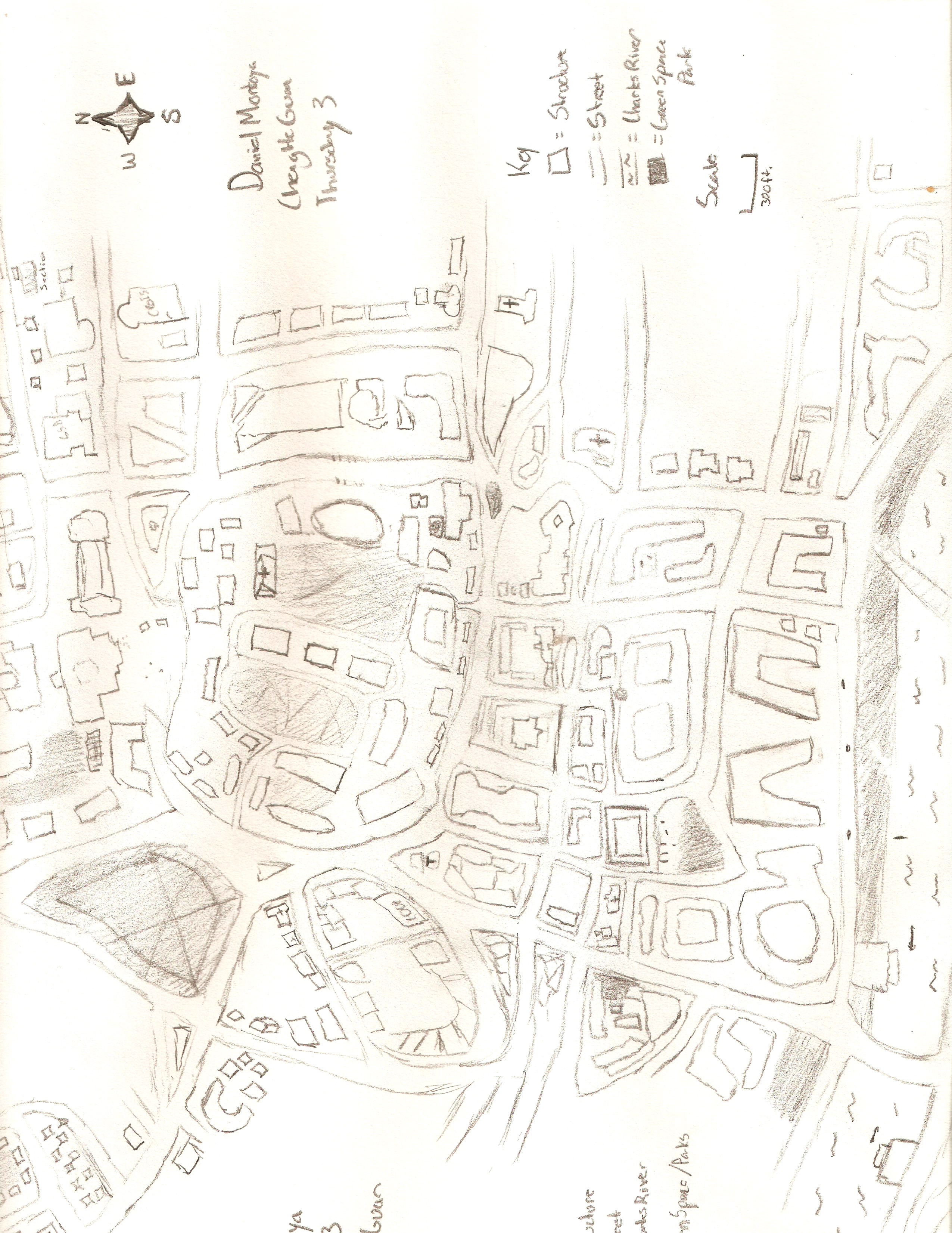 Urban design still remains a foreign concept: space, dimensions, structure can easily clutter the mind when drawing our fondest roads from memory. Despite the initial hesitation and frequent erasure marks, I believe the product that came out captured the spatial distribution of Harvard very closely. The map is not completely accurate, by no stretch of the imagination, but it really does encapsulate the most important landmarks of Harvard while respecting the spatial distribution of the urban/suburban settlement. Right off the back, the biggest difference I see is that of perception, meaning that in comparison to the actual map, my map elongates certain bottom portions. This is most apparent with Winthrop House which is my home, as well as the point of origin for the sketch. Winthrop is by no means the same size as the Science Center but the way I went about designing this map started from home and worked its way abroad causing certain levels of exaggeration in size for Winthrop (but not substantial). Furthermore, my map has very accurate points at times, the Yard, the walk to the Quad, the houses along the river symbolize places that matched up almost identically to the real map. This is most likely do to these places being centers of my life, and thus my memories that I can perfectly sketch them out. It seems that these three foci served as the triangle of urban planning for my mental map in which the great challenge was filling the in-between space and the peripheries with landmarks that I could easily recognize.