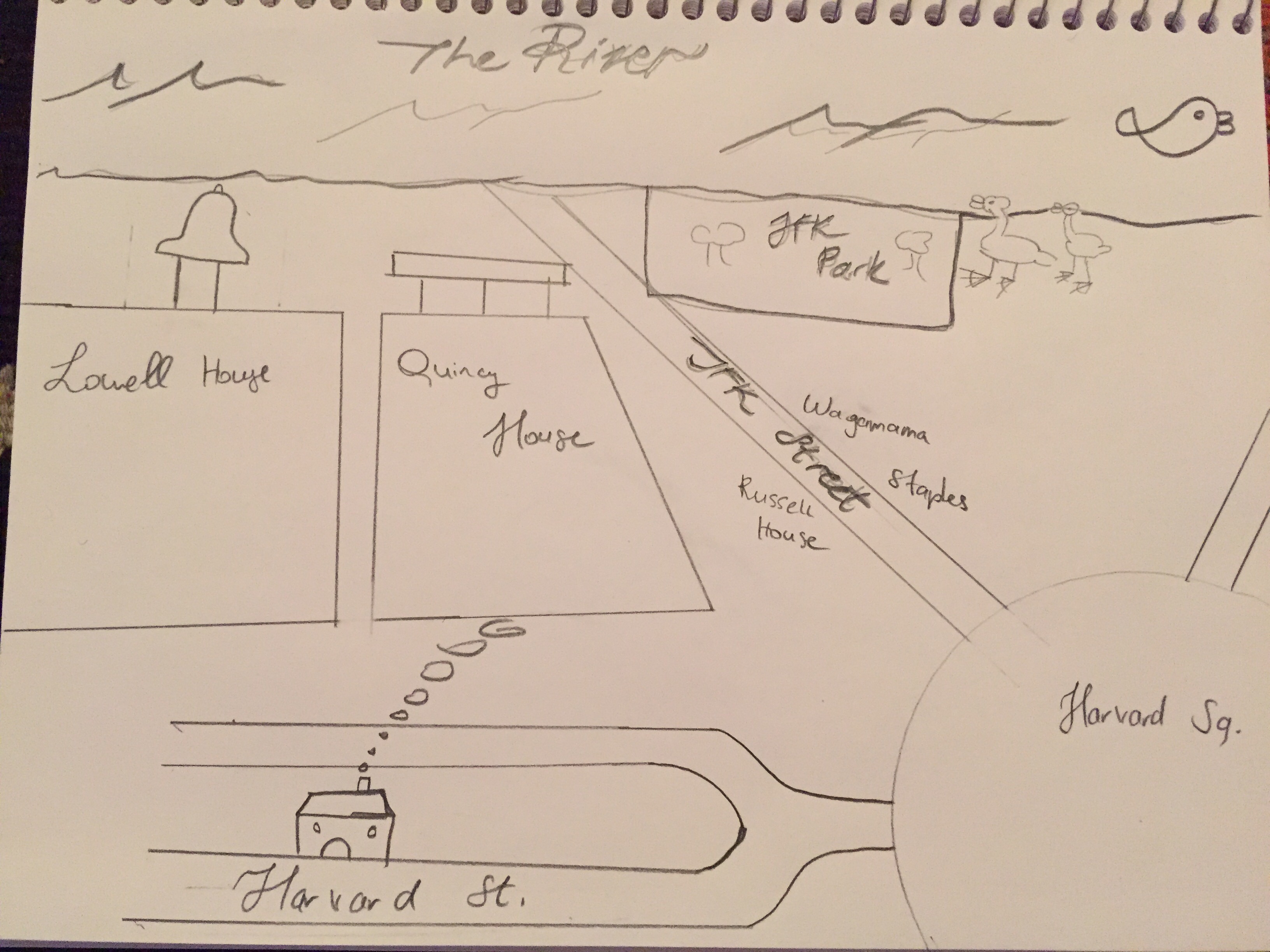 In this amateurish mental map which I have devised solely using my memory, and images that come to my mind when I think of the places around Harvard Square; depicts a path I take quite oftenly, the path that leads from my apartment to the river side. I live off-campus on Harvard Street, in the building I have depicted with the smoke coming from its' chimney. I usually take the road down to Harvard Sq, then turn left onto JFK Street to get to the river. I really enjoy the riverside either for exercise or contemplation and really like the duck who inhabit there, which I attempted to artistically convey. Comparing my map to an accurate one of course reveals the plethora of inaccuracies that are inherent in my mind map; but it also showed me how much mental space and importance we accredit to pathways we take often. This often leads to the architecture of these pathways and the building we come across on these pathways to plays bigger roles on our psyche and have influence on our everyday.