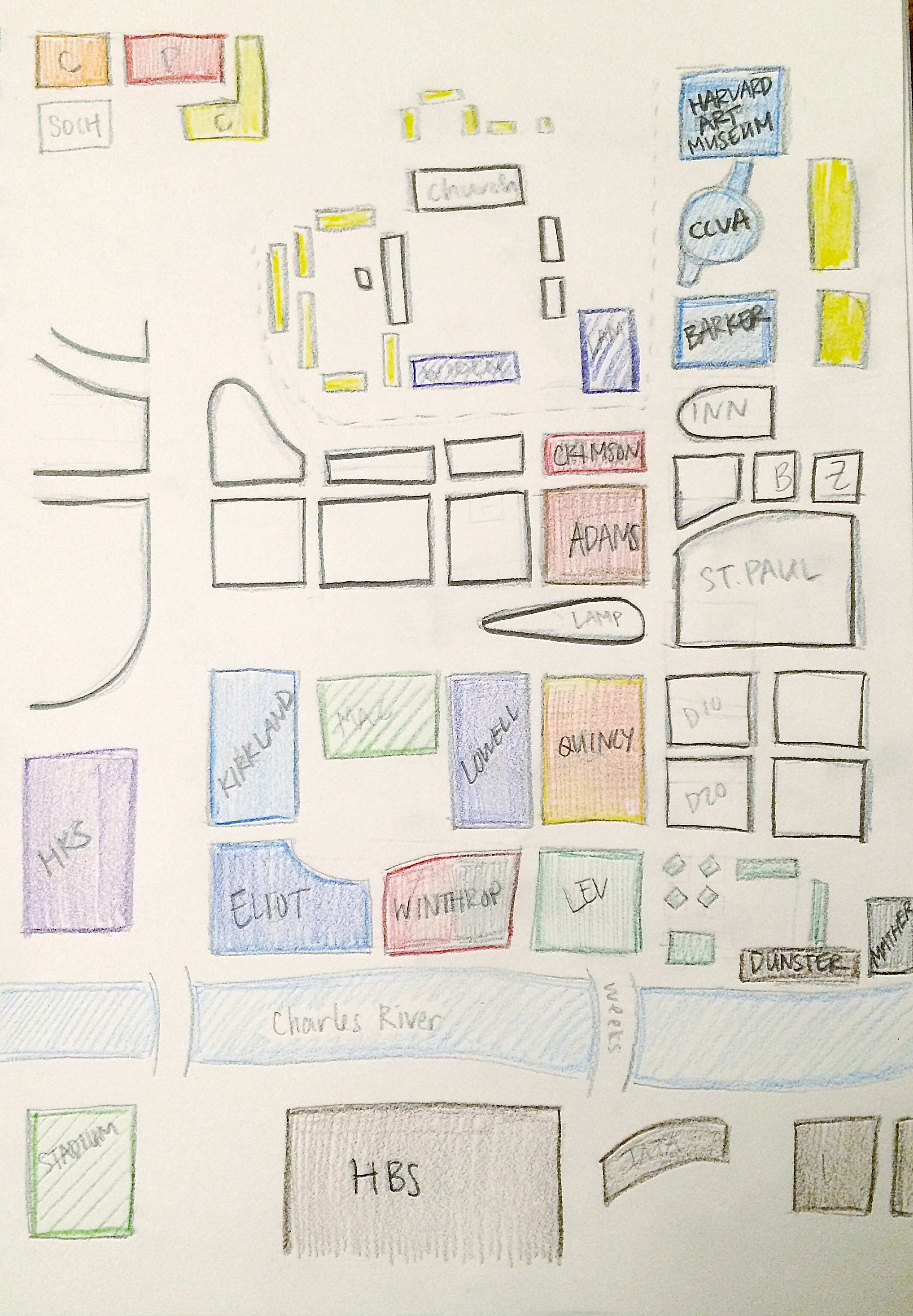 My sketch tends to heavily focus on the riverside of Harvard Square. Unlike the actual map, I found that in my sketch I disproportionately scaled the buildings to a bigger size, making the other buildings along the northern end of Harvard difficult to fit. In part, this is due to my natural lack of understanding/experience/exposure to the northern part of the square -- I spend the most time along the river in my house (Leverett), and travel mostly up and down DeWolfe St. to get to and from my classes. The lack of detail I have in between the Quad and the yard is indicative of my lack of understanding of the space between the two either -- my perception is that the Quad exists and is there, but is in a way distanced from the rest of Harvard, as suggested by the abyss of blankness that separates it from the rest of the map. Overall, my map is relatively accurate along the riverside, but anything beyond that falls quickly out of proportion and detail.