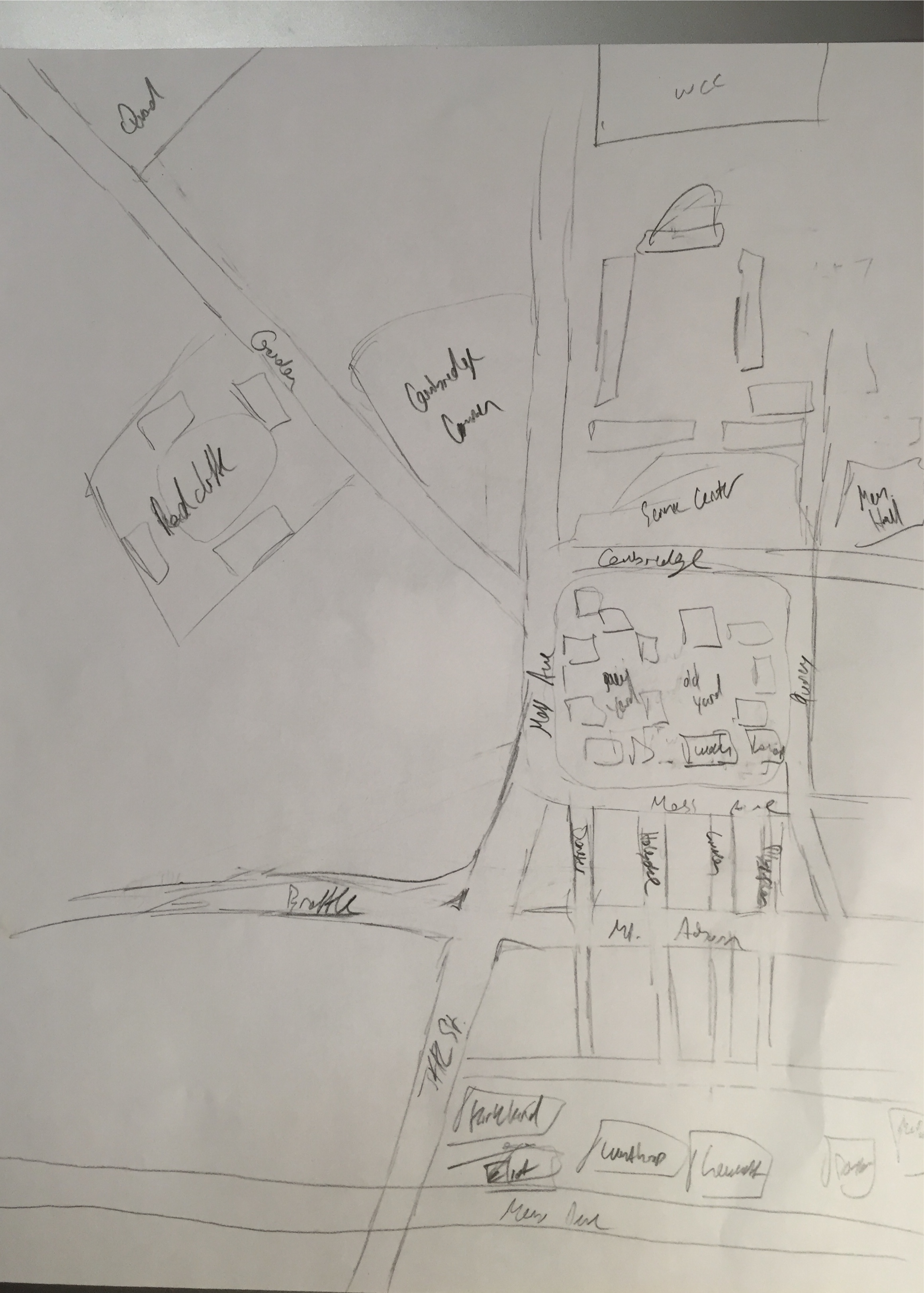 Although I’m biased, after comparing my map to a Google Maps image of the area, I would say my illustration was decently accurate. I have accounted relatively well for the positions of Harvard Yard relative to the law school, as well as the undergraduate houses on the river and Cambridge Common. My map’s scale is a bit off in certain areas, particularly Garden Street leading up to the Harvard Quad, and I did not accurately portray the edge of land to water by the Charles River. I don’t quite know why that’s true, but I imagine that the fact I drew Harvard Yard first and felt constrained by the edge of the paper played a role. In general, it appears as though my memory was much more accurate regarding placement of streets than other things like placement of buildings, etc. I’ve found this true in other parts of my life as well – I’ve always had a bad sense of direction, and that may be because I have a hard time remembering “landmarks” and their placement in space. At the same time, I’ve always been good with a map – If I have one, I can navigate my way around quite well. Indeed, I could picture a map in my brain relatively well once I’ve seen it a few times. The fact that my depiction of streets was more accurate than other objects may be a reflection of these.