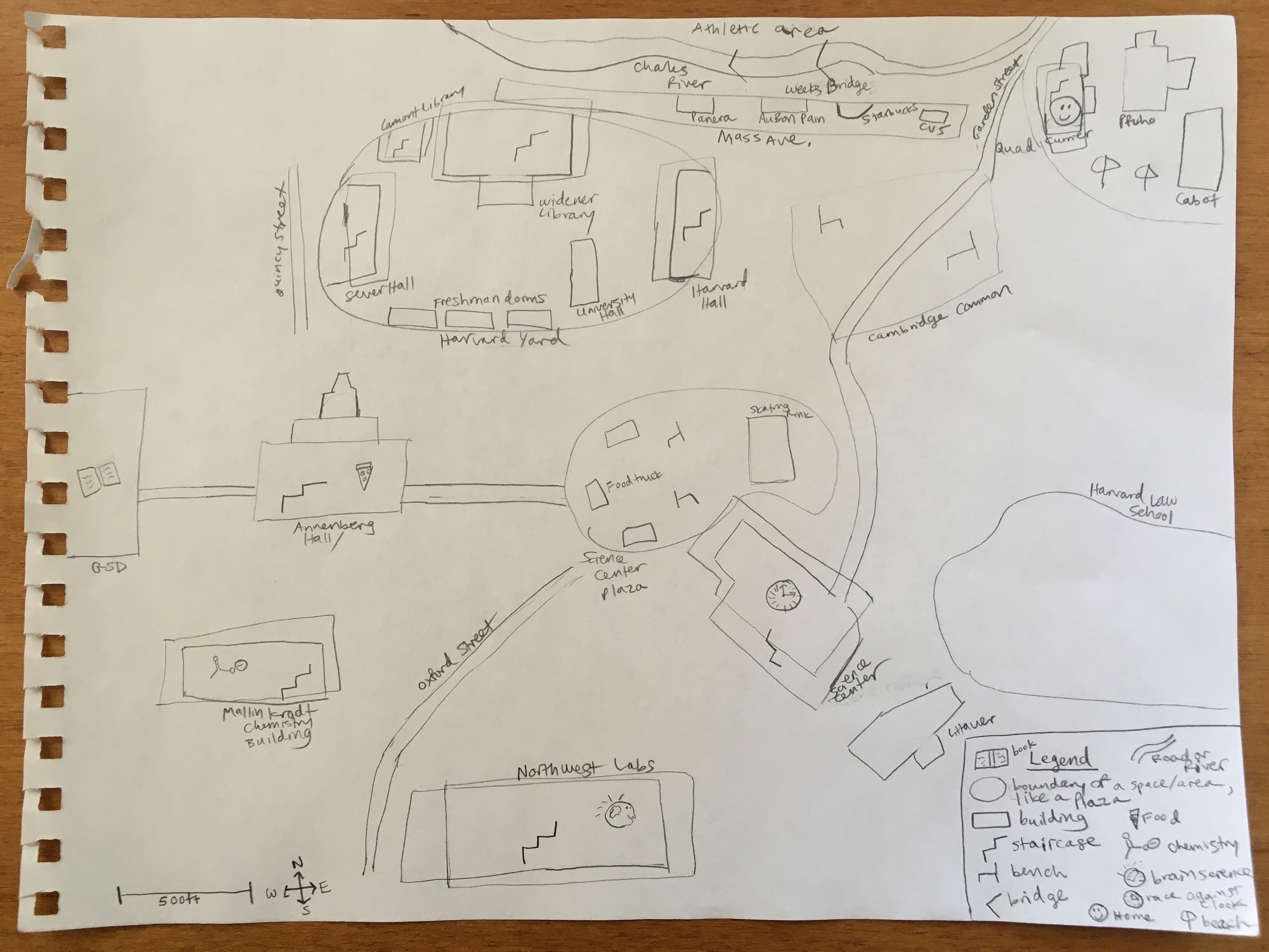 It is imminently clear that my overall directional and spatial knowledge of Harvard’s campus is relatively complete. Buildings are generally placed in the correct orientations with respect to one another. However, despite this latent perception, the disproportionate percentages of space taken up by certain areas, and the absence of some buildings altogether, represent my weaknesses. It seems that I have structured my map surrounding my daily activity. For example, the road from the Quad, where I live, to the Science Center holds a central location in the image, and is perhaps too isolated and large compared with reality. Conversely, I know nothing about some buildings and streets (not even locations), such as at the Law School. These unknowns therefore do not even appear on the map. Although I did attempt to depict certain buildings I know little about, like University Hall, I was unable to recall any details of their structure.