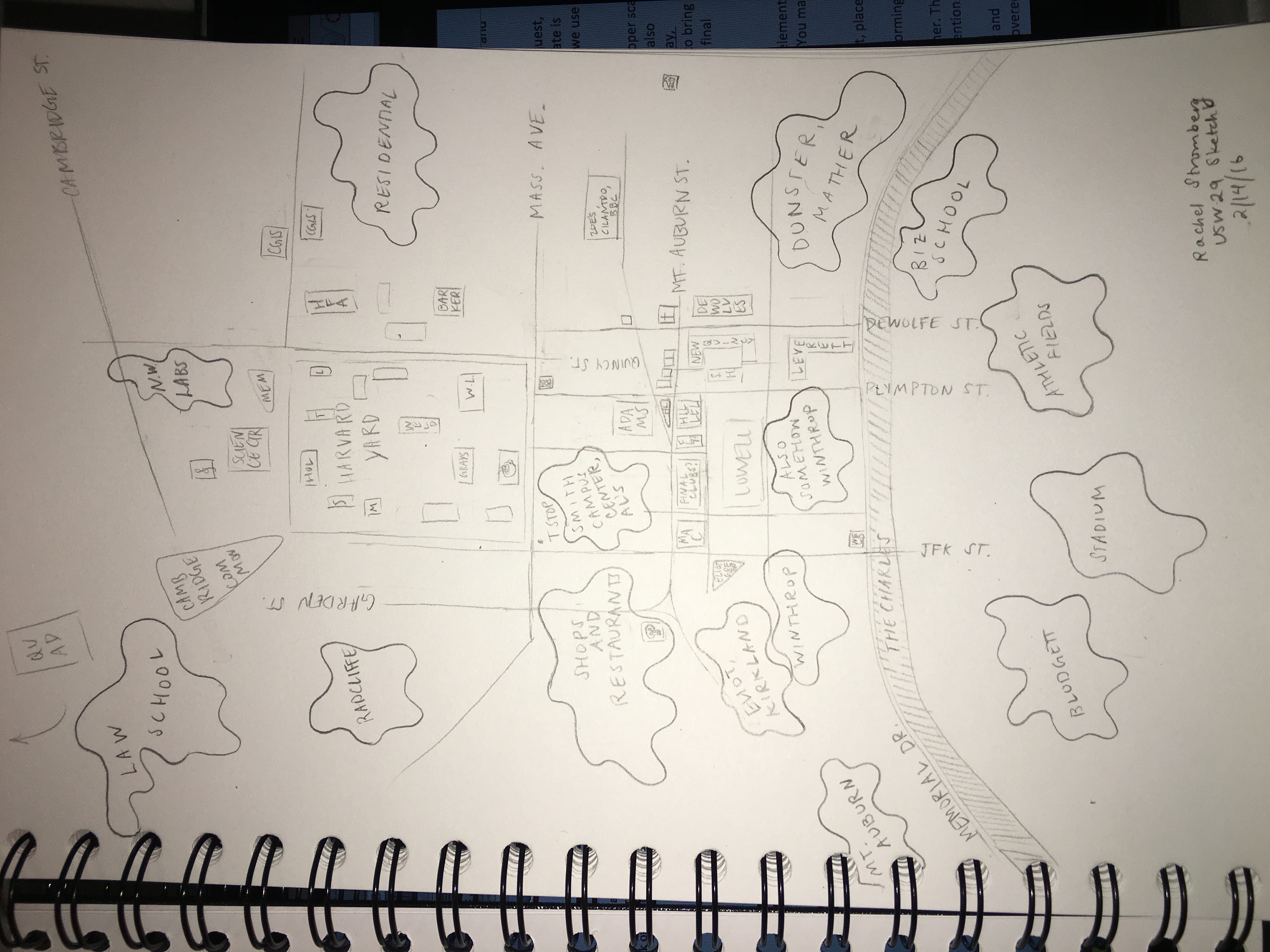 While sketching, I chose to differentiate between the places I knew for certain and those whose locations I was less sure of by drawing the former as angular shapes and the latter as formless blobs. I initially just hoped this would be symbolic of my uncertainty surrounding certain sites, but I realized that it is actually deeply reflective of the way I think about space, and the mental navigation system I use in real life. For instance, I do not know exactly where Dunster House is, nor even quite what it looks like, but I know that if I keep walking east along the river for a while, I will run into it fairly soon. Similarly, in my head, Northwest Labs are somewhere nebulously north and east of Annenberg and the Science Center. This level of specificity in my knowledge of location, although low, is perfectly sufficient to allow me to navigate the Square. The map in my head contains more blobs than rectangles, but it gets the job done.