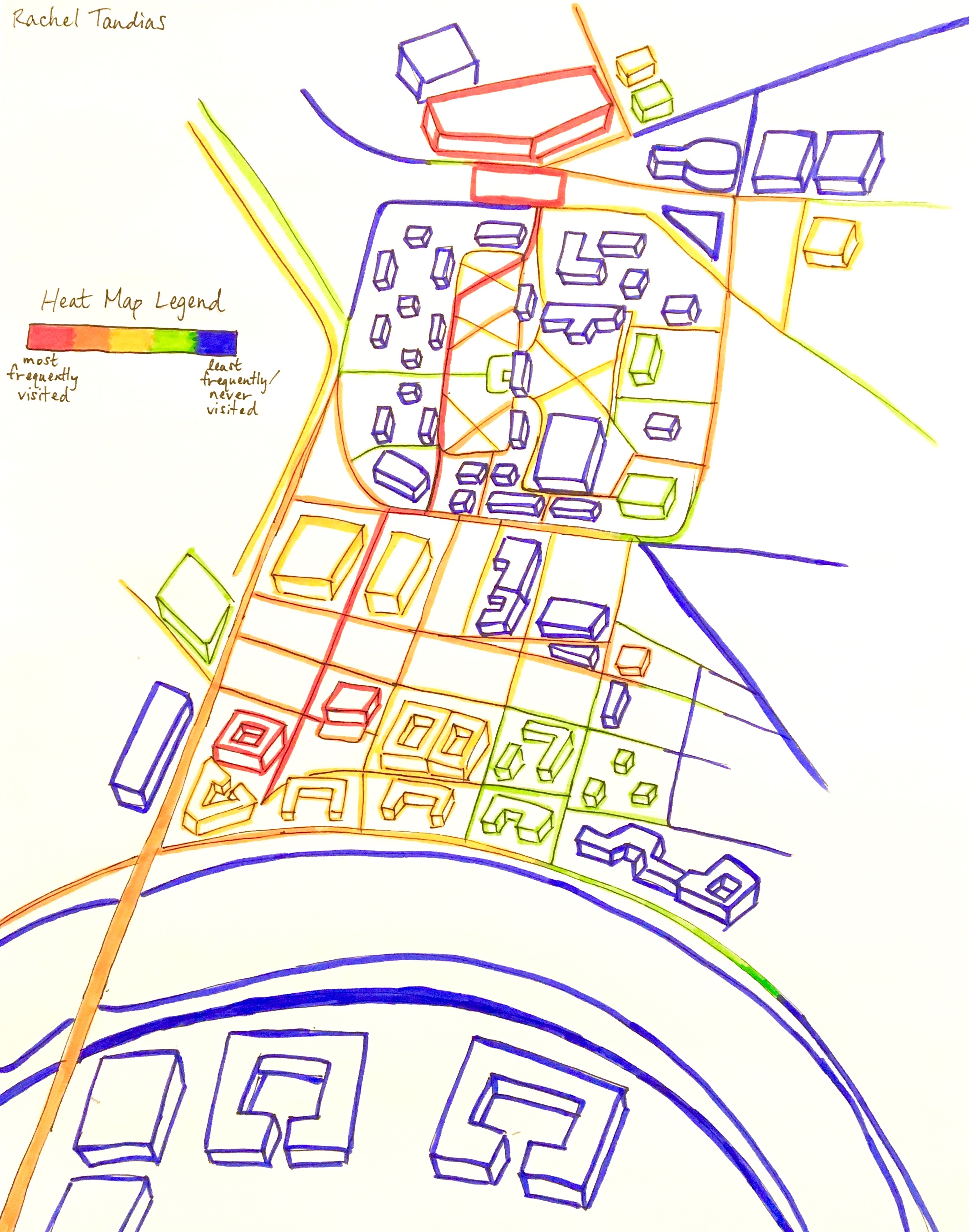 This assignment was very interesting in that it allowed me to assess my ability to concretely depict my mental representation of my surroundings. I began this exercise by visualizing my everyday route across campus from my dorm near the Charles River, through Harvard Square, and across Harvard Yard. I decided to create a “heat map” showing the areas that I most often frequent. Interestingly, although I was able to envision the buildings and streets in my mind nearly perfectly, I found it incredibly difficult to depict these structures on paper. It was particularly difficult to represent the shape and relative size of buildings, and I found that I was only able to sketch the relative orientation of structures by mentally navigating through the streets.